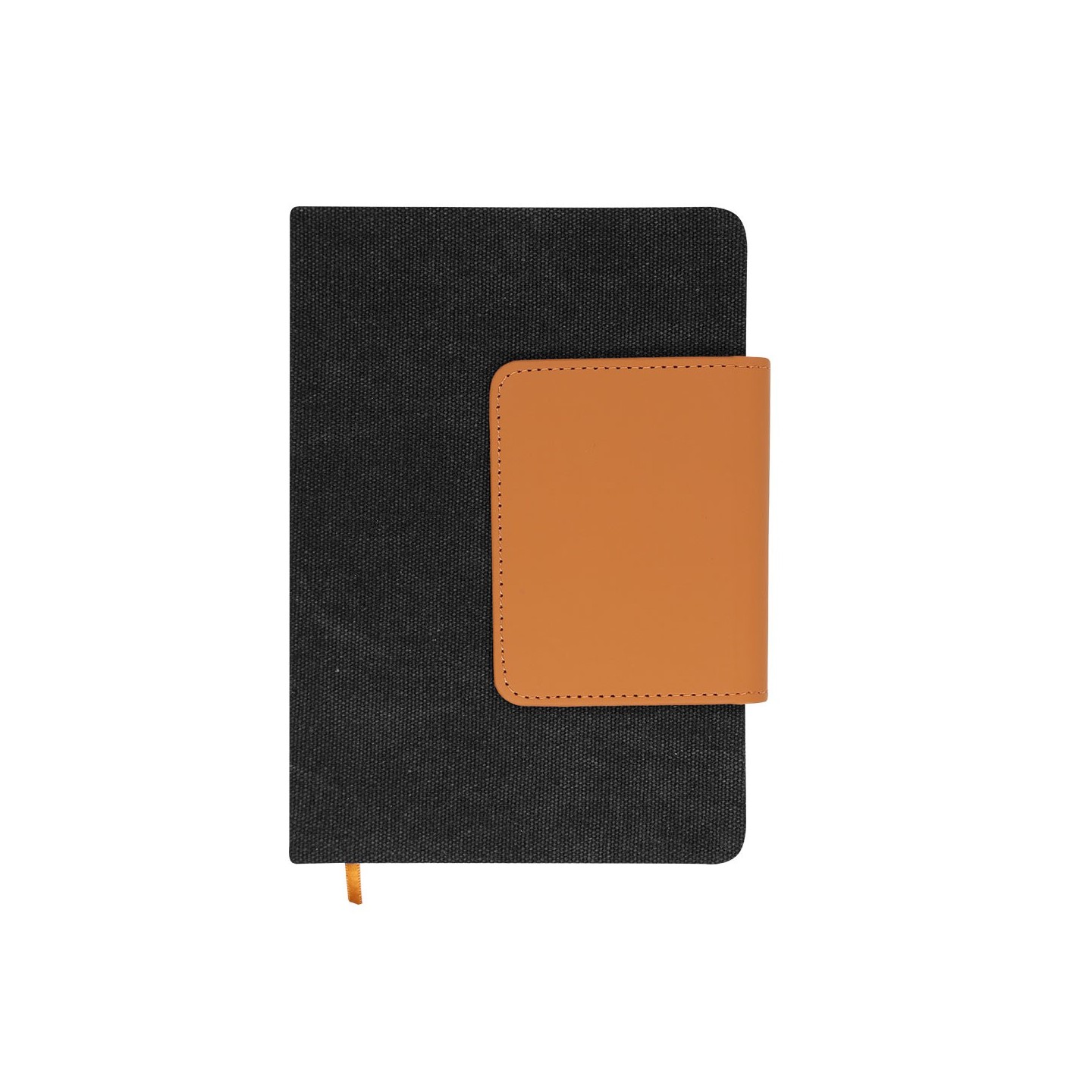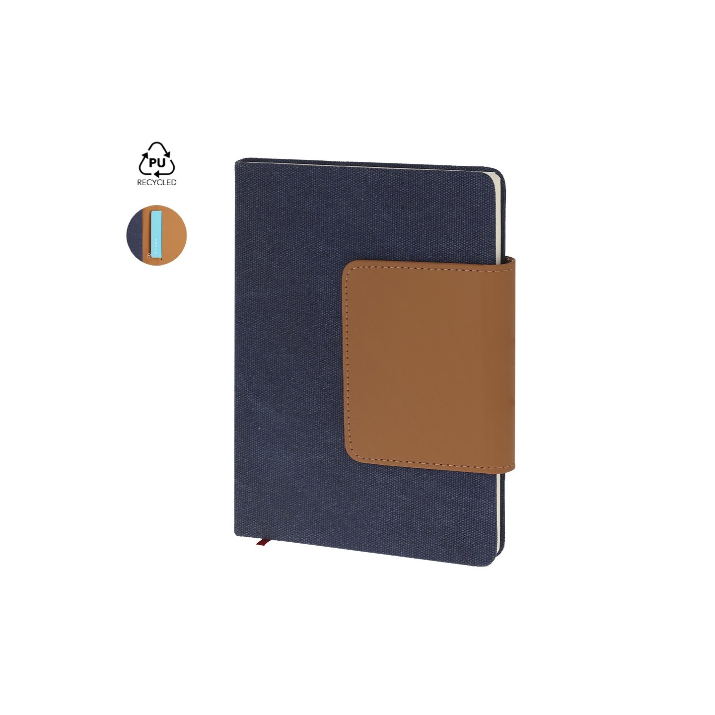 Bloc de notas A5 con combinación de Canvas Reciclado y PU Reciclado. Incluye 80 hojas, tarjetero y marcapáginas. Personalizable con tu logotipo.