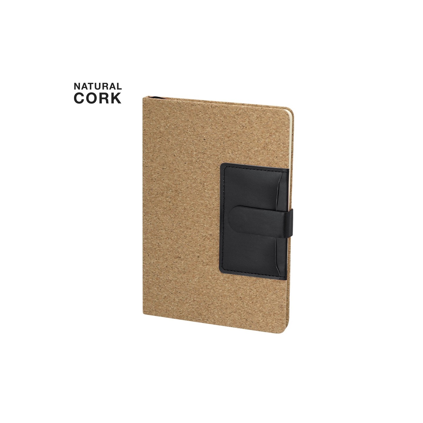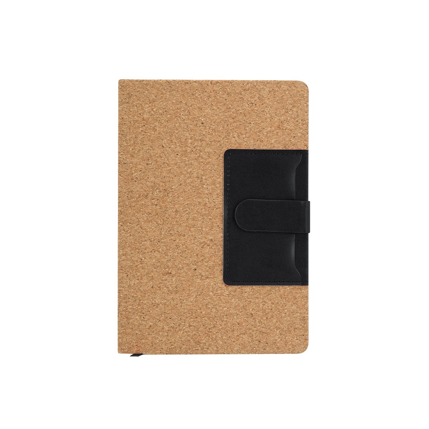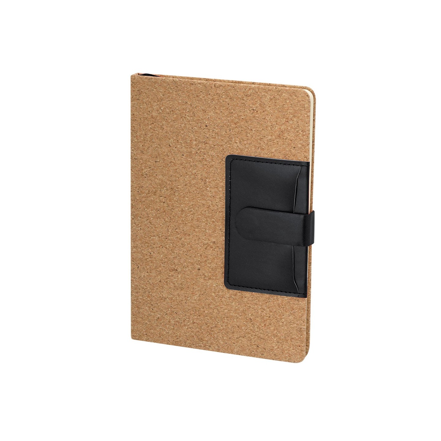 Bloc de notas sostenible con corcho natural y PU. Con bolsillo para tarjetas, cierre magnético y 80 páginas. Personalizable con tu logotipo.