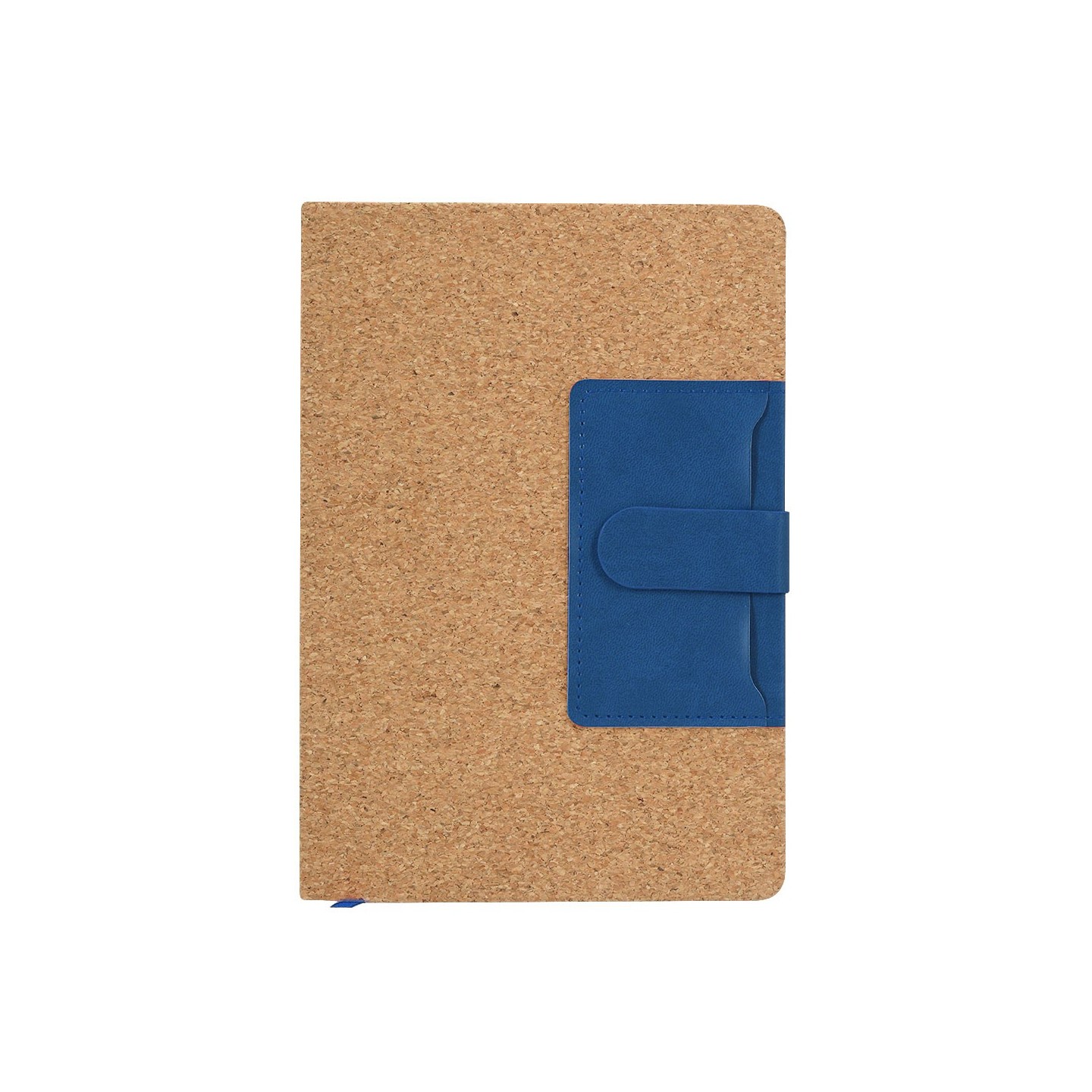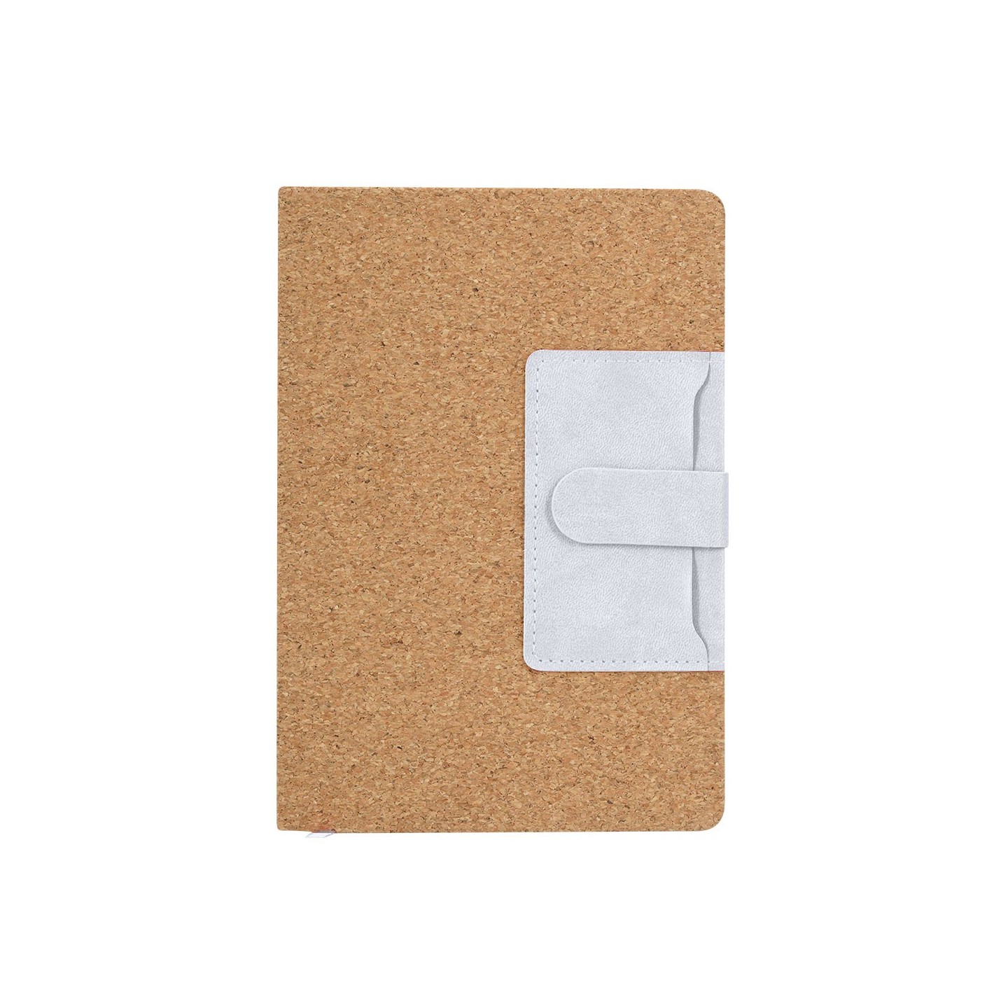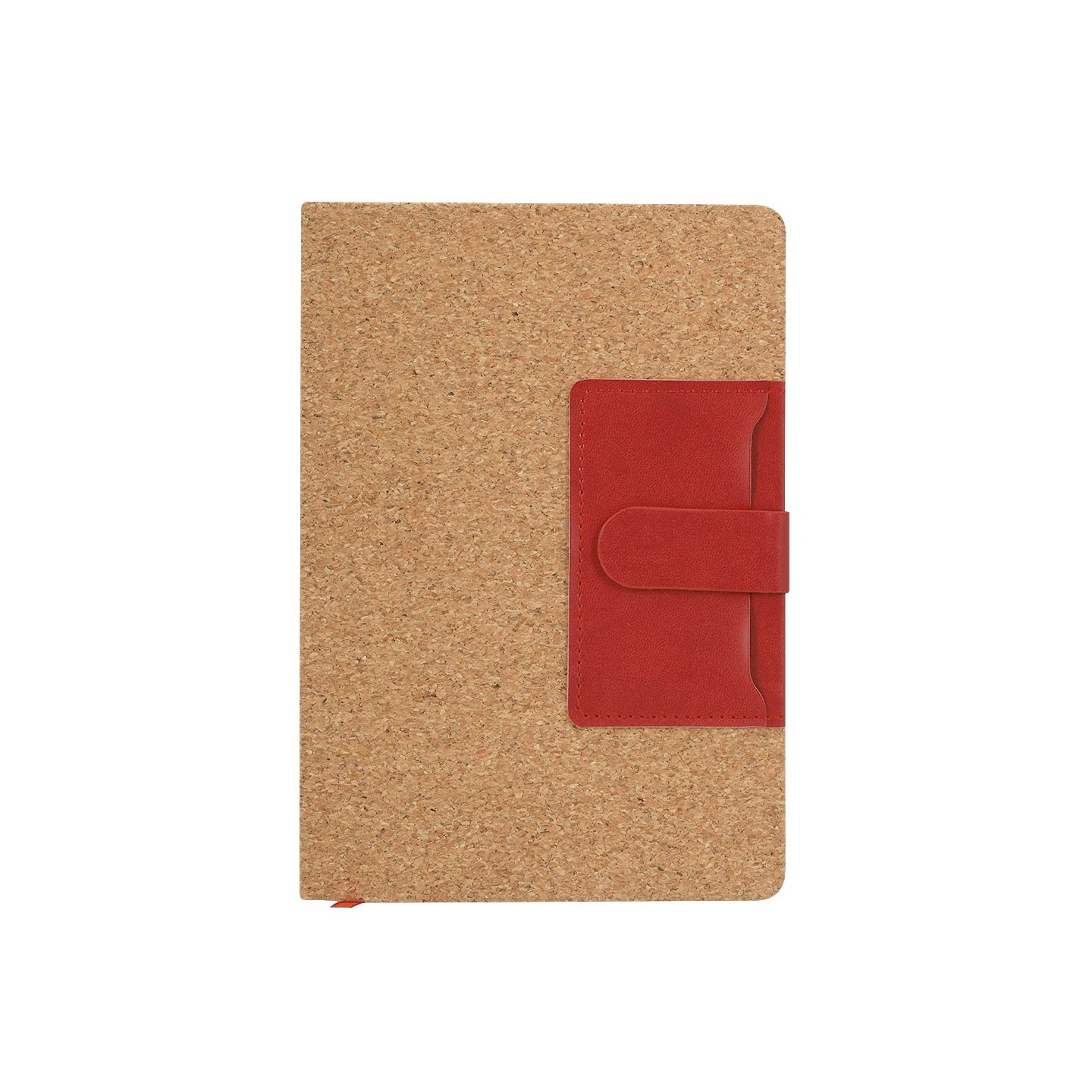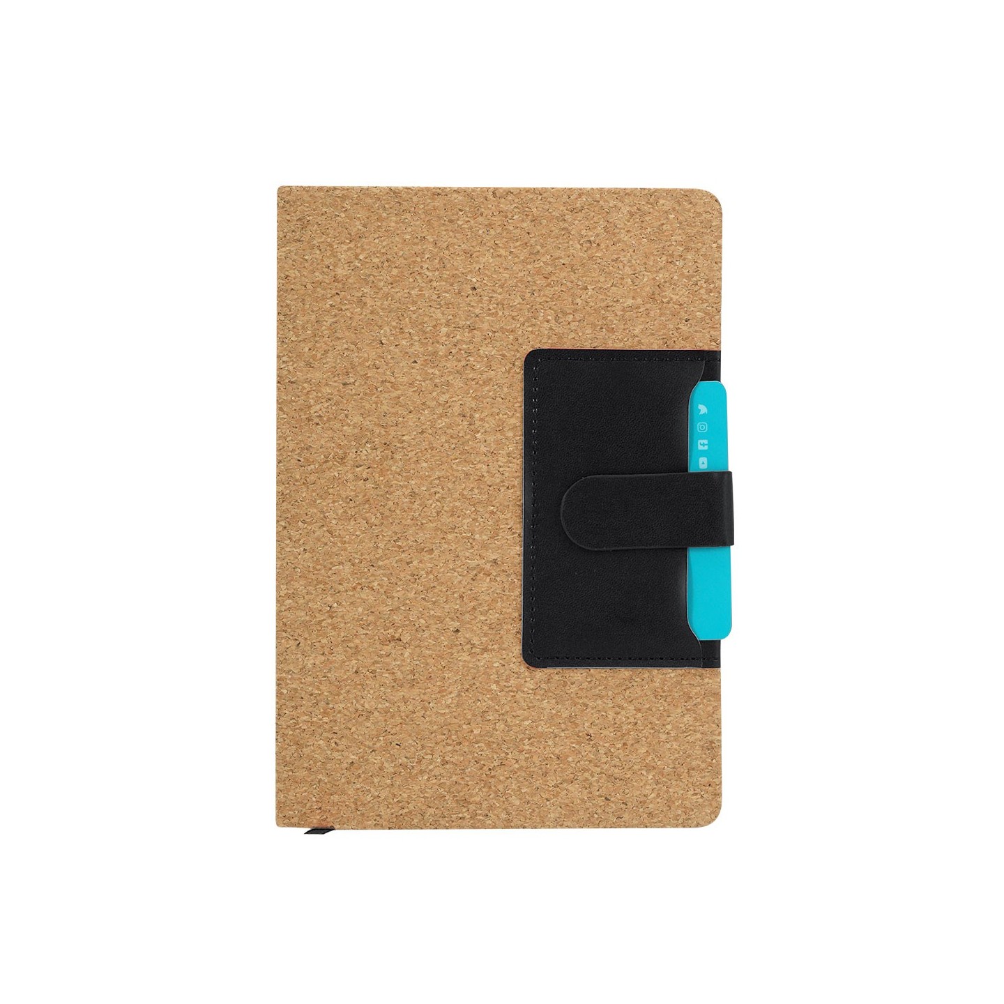 Bloc de notas sostenible con corcho natural y PU. Con bolsillo para tarjetas, cierre magnético y 80 páginas. Personalizable con tu logotipo.