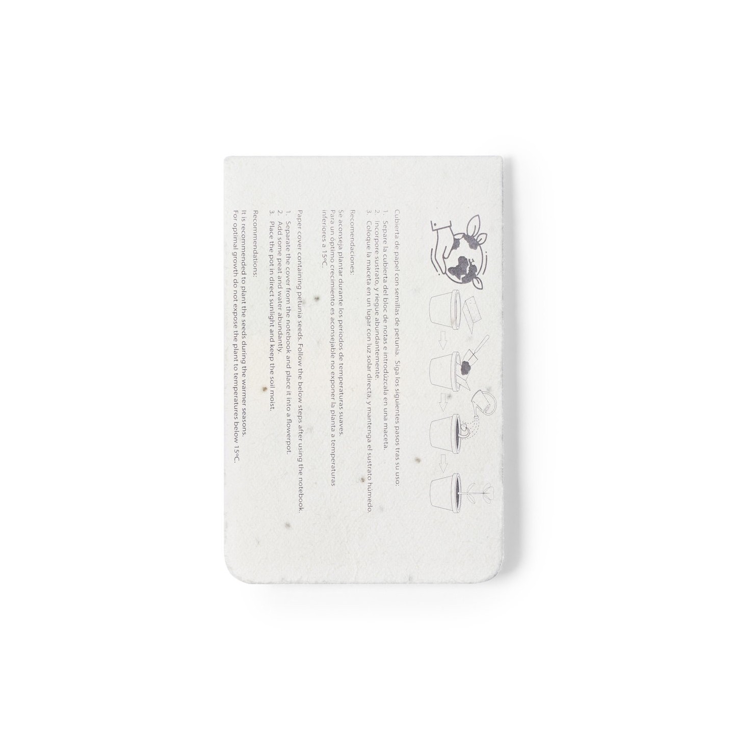 Una característica especial de este bloc de notas es que incluye semillas de petunia en ambas cubiertas, lo que lo convierte en papel plantable al final de su vida útil. Una vez que hayas terminado de utilizarlo, simplemente puedes plantar las cubiertas y ver cómo las semillas de petunia se convierten en flores vibrantes.