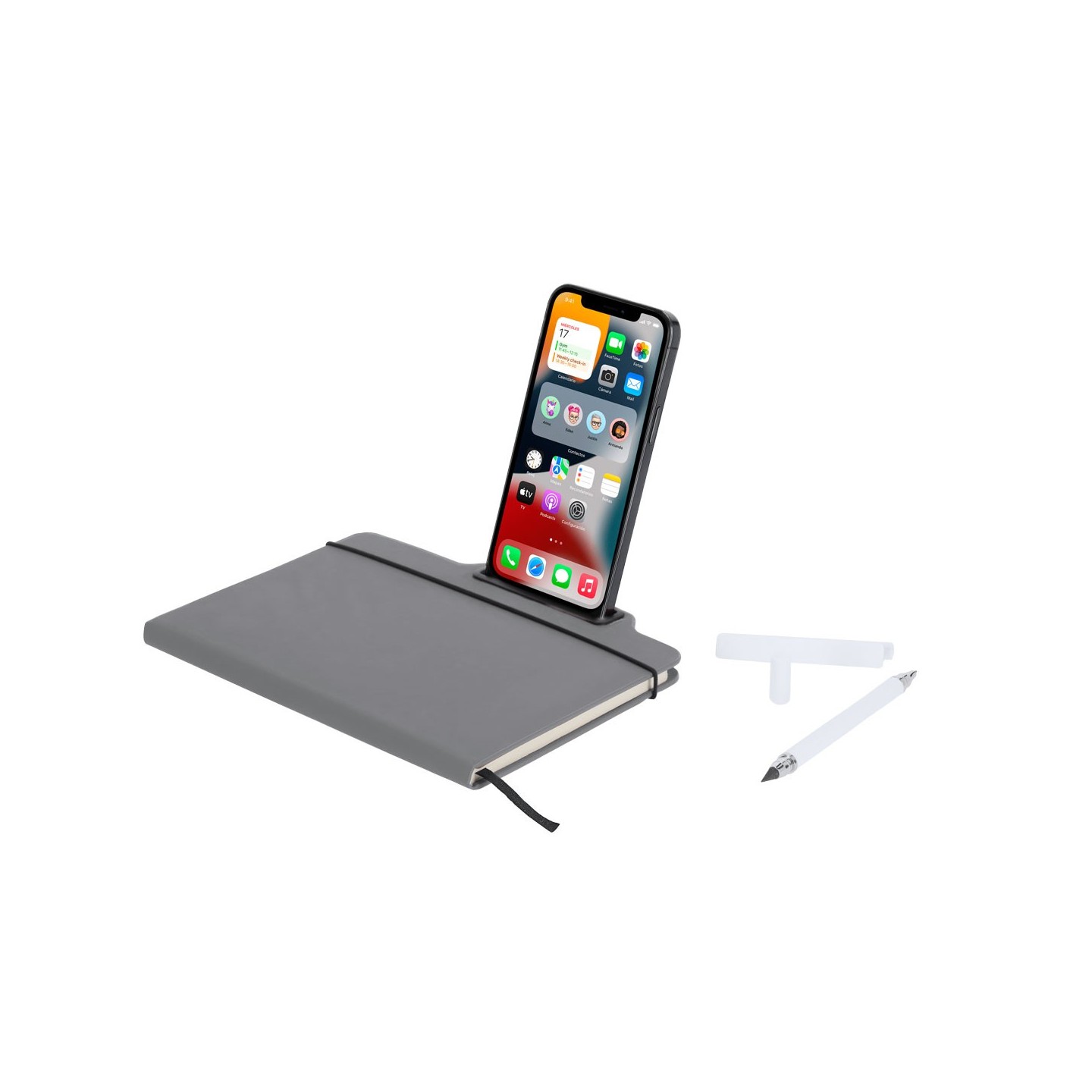 El Bloc Notas Soporte Cruas, fabricado en suave PU, incluye soporte para smartphone, bolígrafo blanco y 80 hojas lisas. Personalizable, ideal para regalos corporativos.