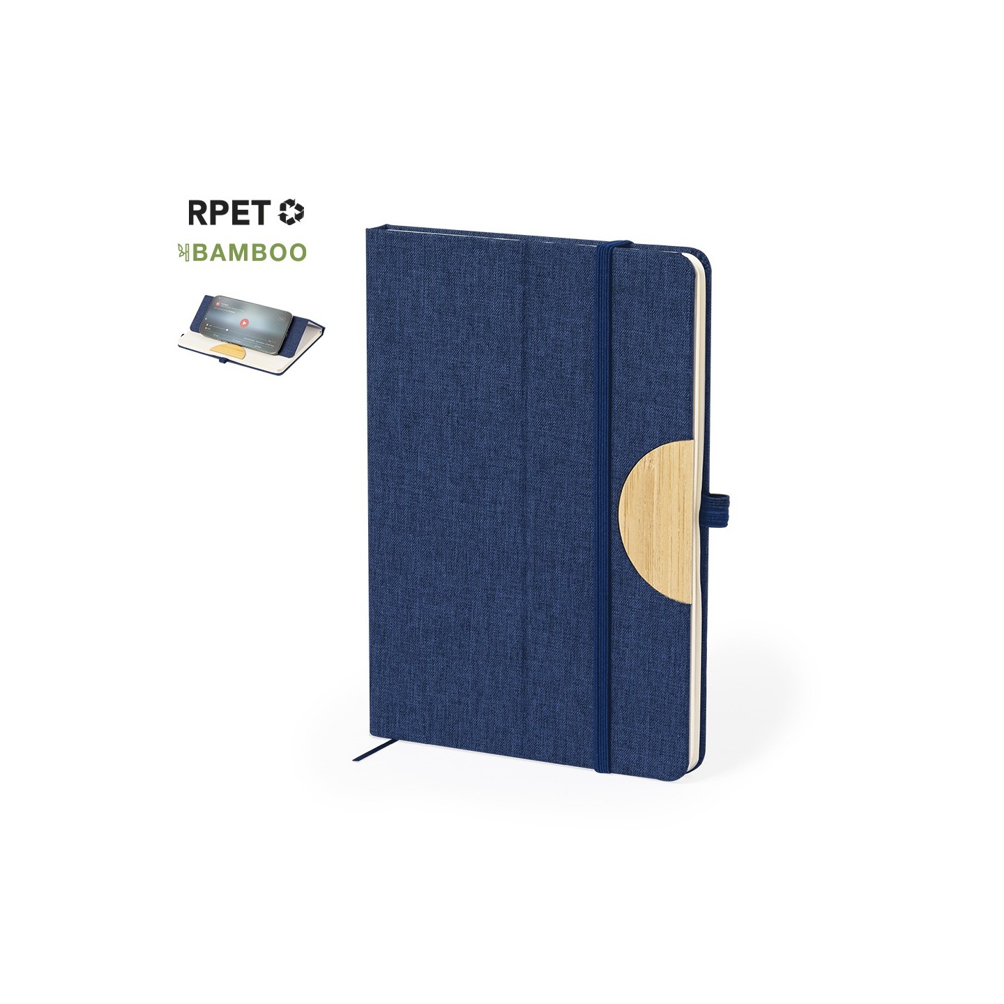 El Bloc Notas Soporte Jibs tiene tapas rígidas de RPET y bambú, con soporte para smartphone y tablet. ¡Personalizable y eco-amigable!