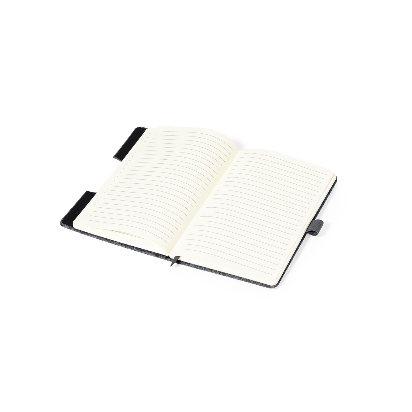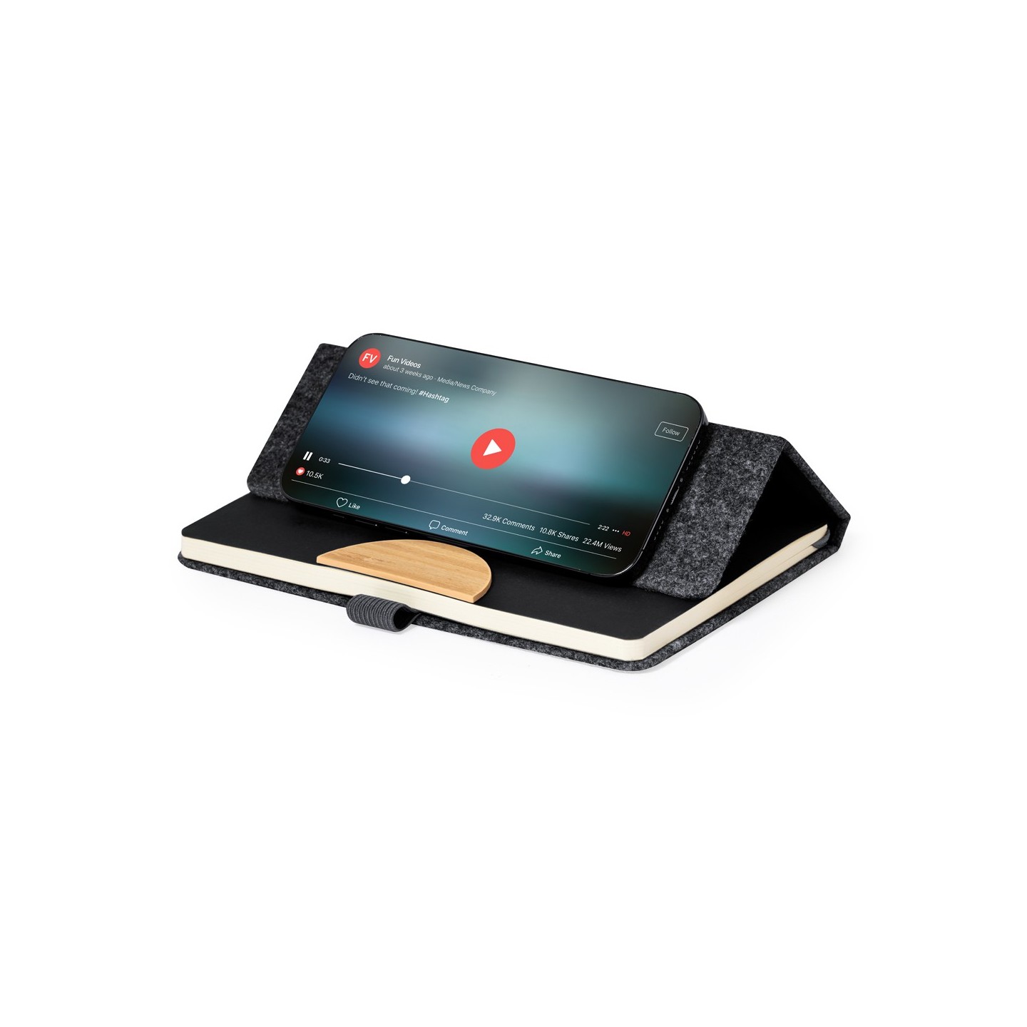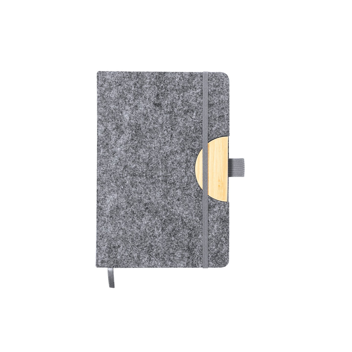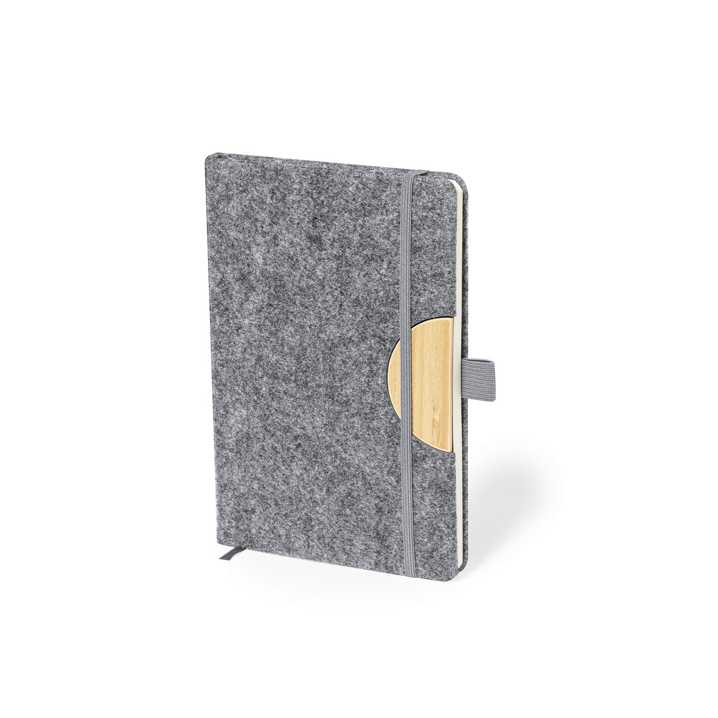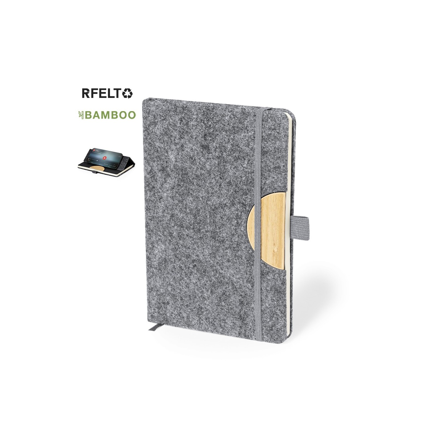 Este bloc de notas está diseñado con tapas rígidas fabricadas en fieltro RPET 300D, un material eco-friendly que combina la resistencia del poliéster reciclado con la suavidad y versatilidad del fieltro. Su originalidad reside en el soporte integrado en la portada, diseñado para sostener smartphones y tablets, fabricado en bambú, un material sostenible y renovable.