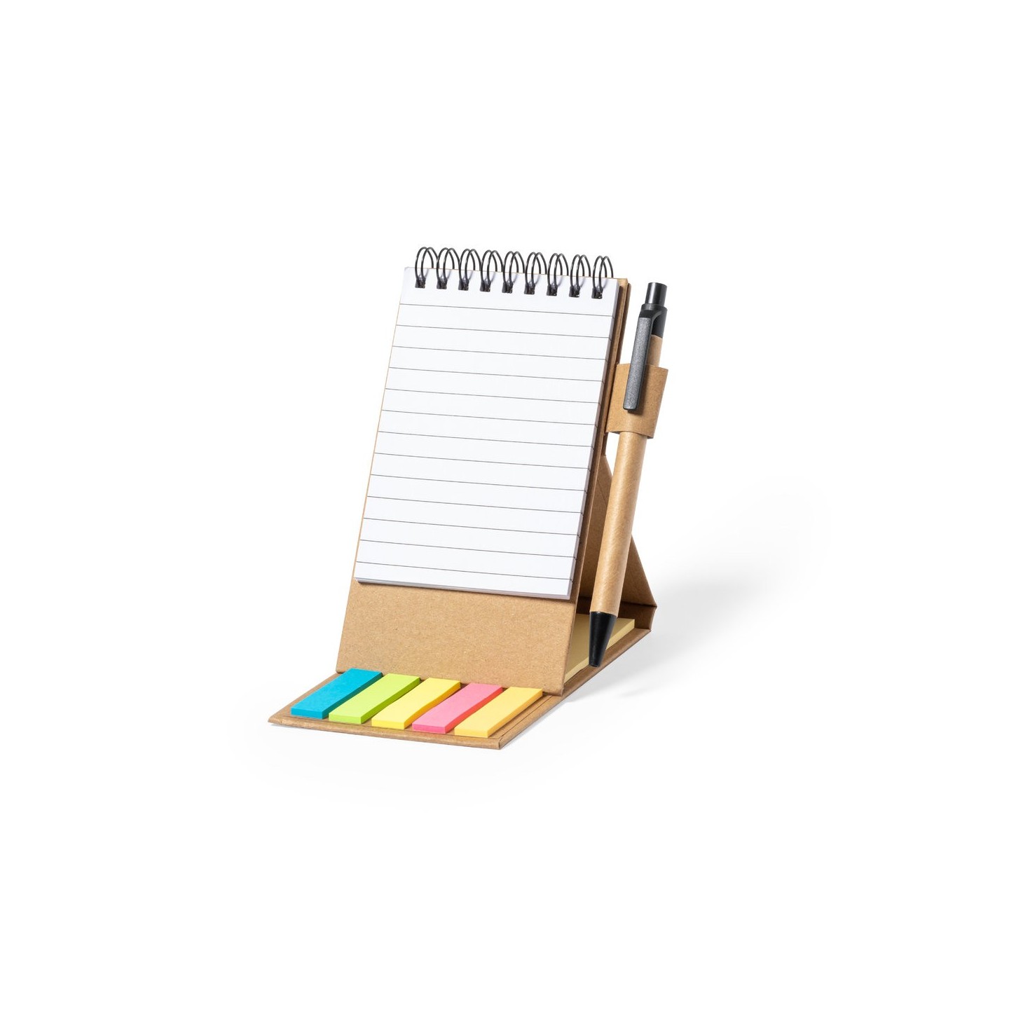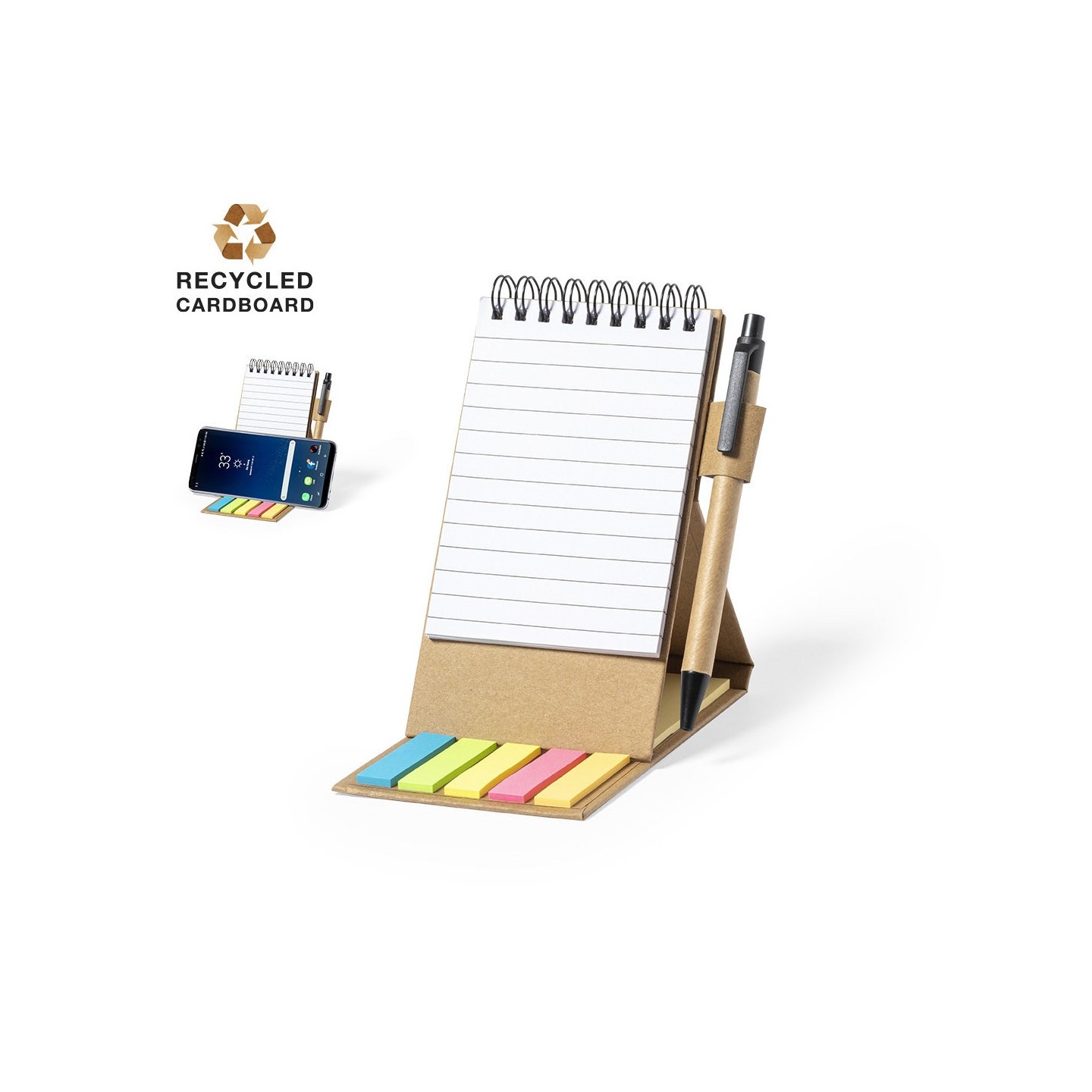 El Bloc Notas Soporte Phesux está hecho con cartón reciclado, y viene con bolígrafo incluido. Con notas adhesivas y mininotas. ¡Funcionalidad y sostenibilidad en un solo producto!"