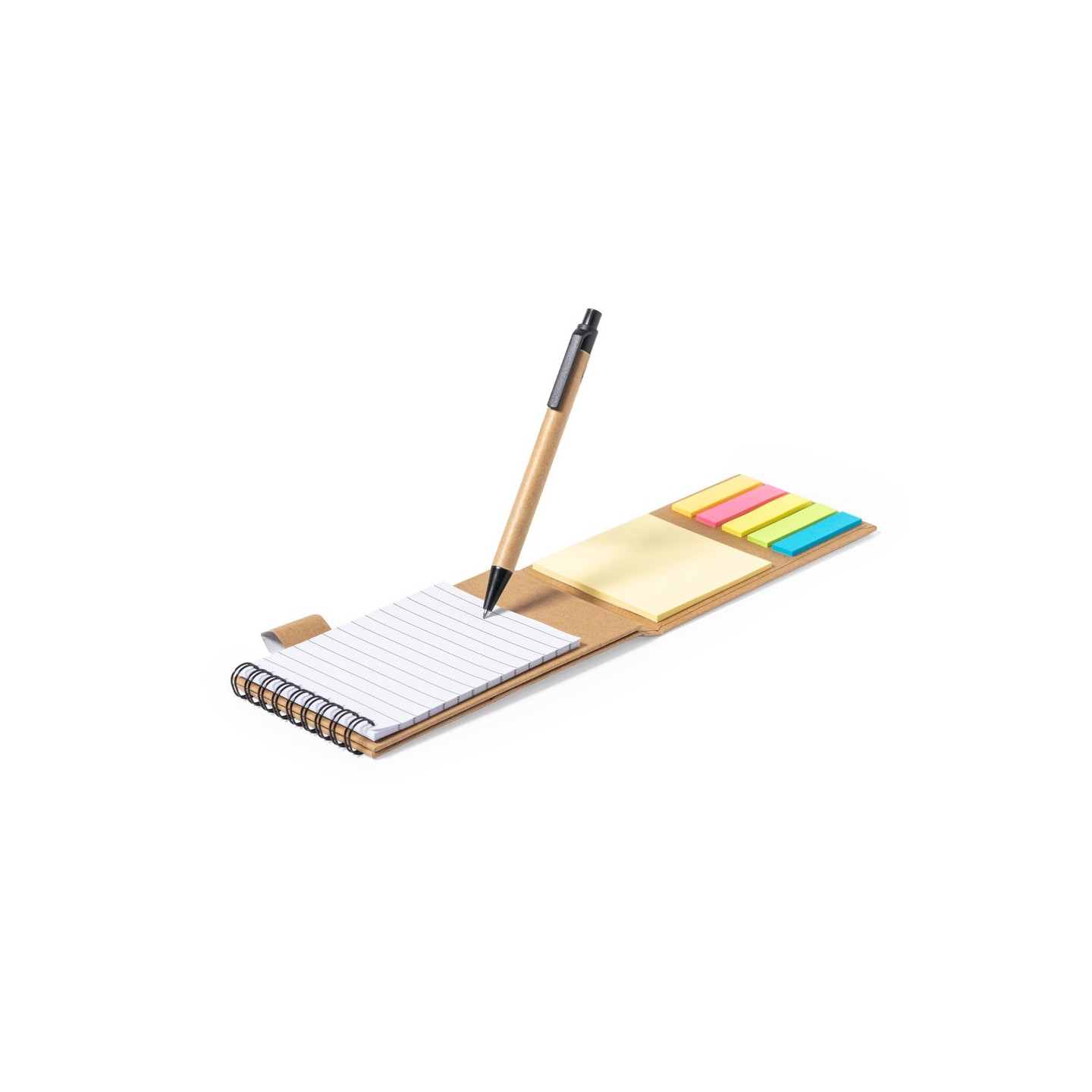 Este set completo ofrece un bloc de 30 hojas, 25 notas adhesivas de 7,5 x 7,5 cm, 125 mininotas adhesivas de 1,2 x 5 cm y un bolígrafo en cartón reciclado, todo presentado en un material de cartón reciclado. Es la elección perfecta para aquellos que valoran la funcionalidad, la sostenibilidad y el cuidado del medio ambiente en un solo producto.