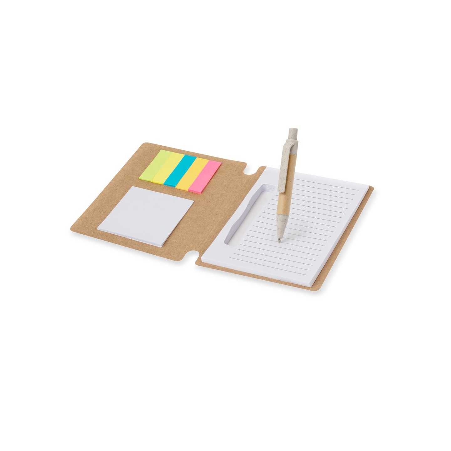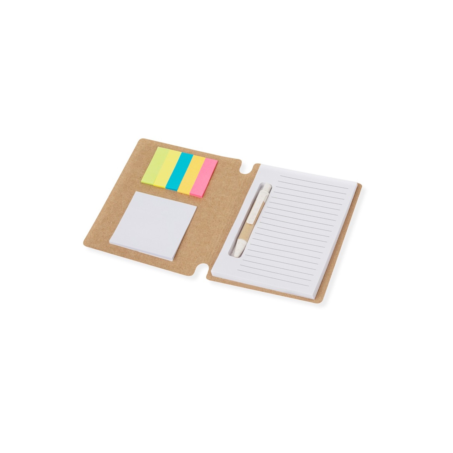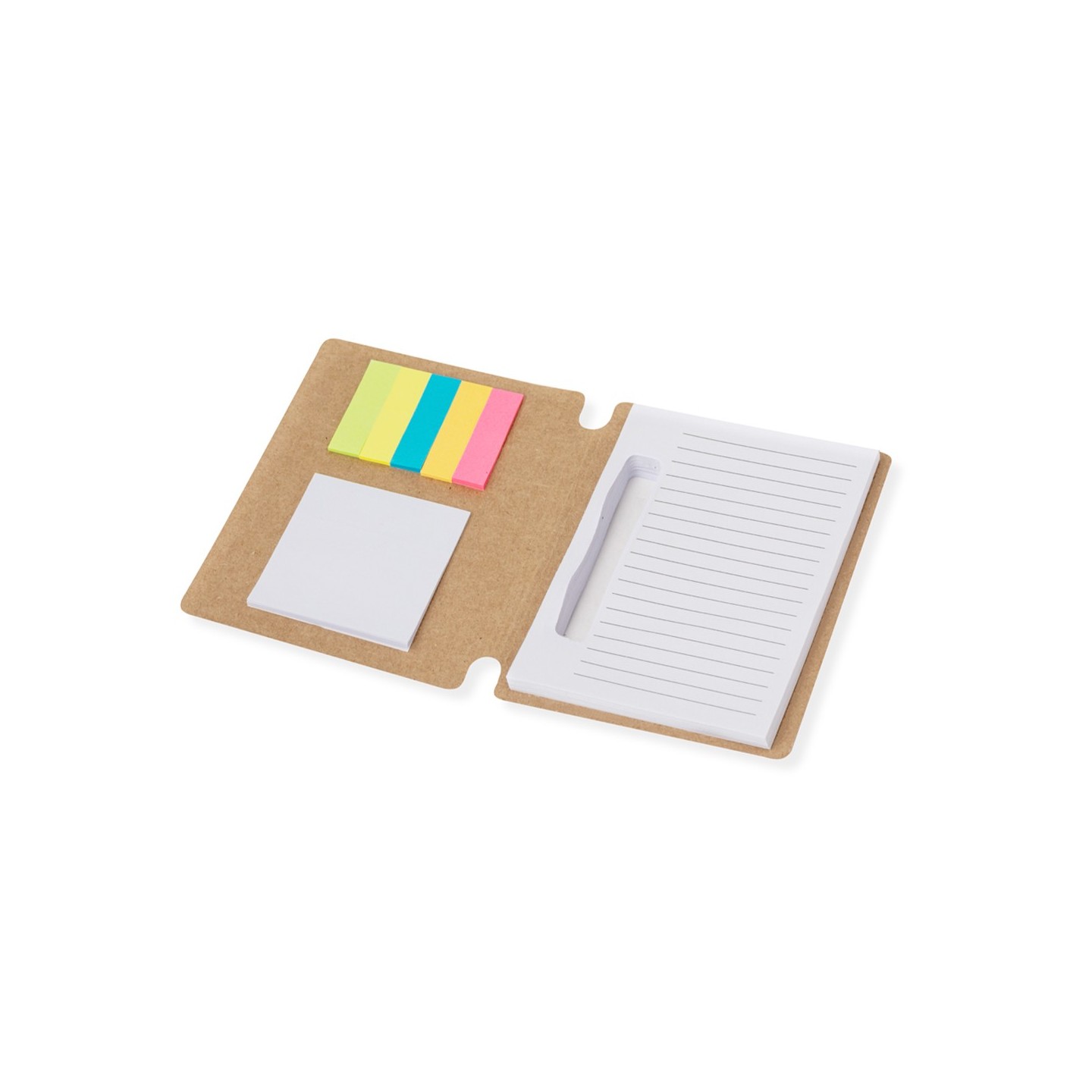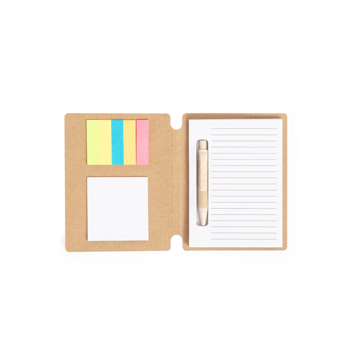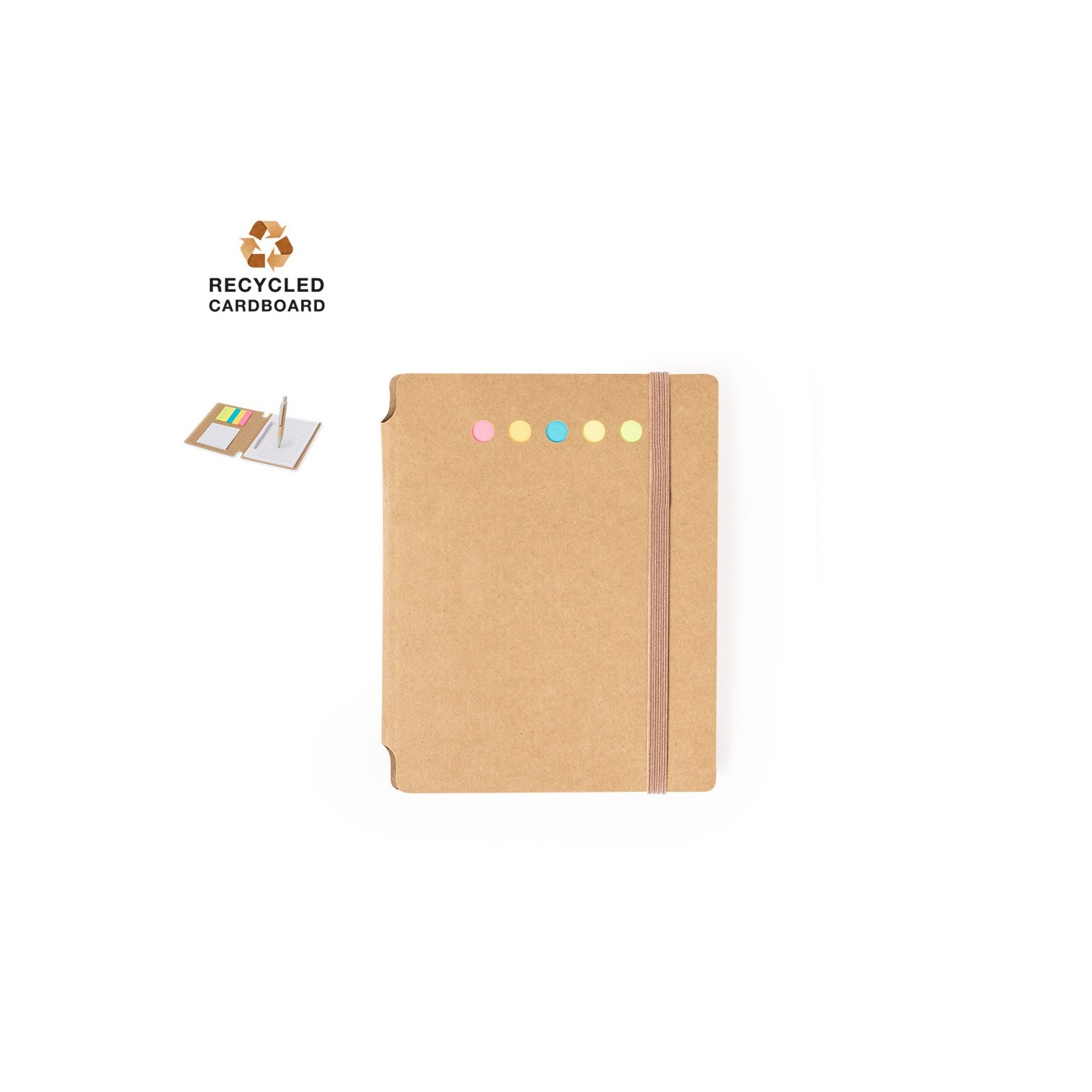 Bloc Notas Wombax de cartón reciclado con 70 hojas y notas adhesivas en varios colores. Bolígrafo reciclado incluido. Personalizable.