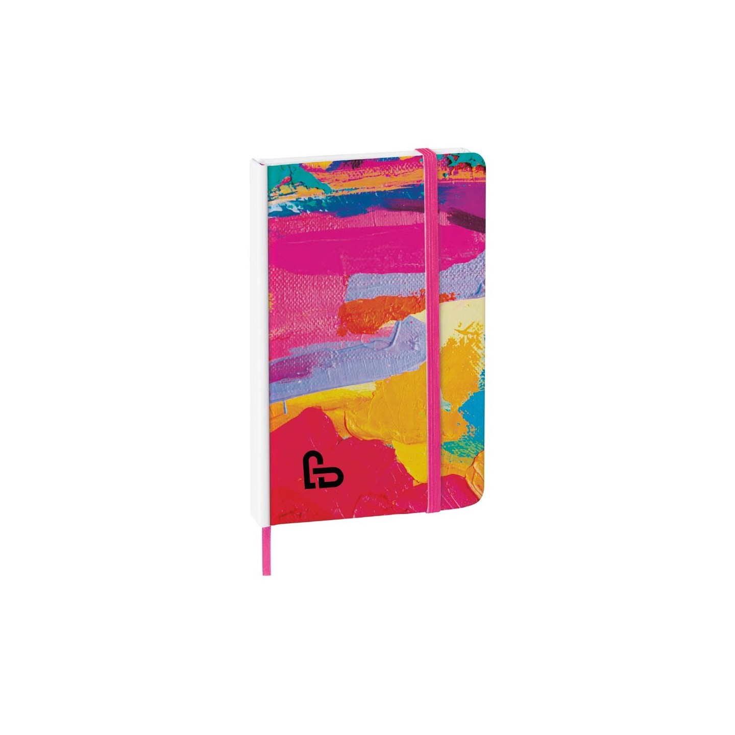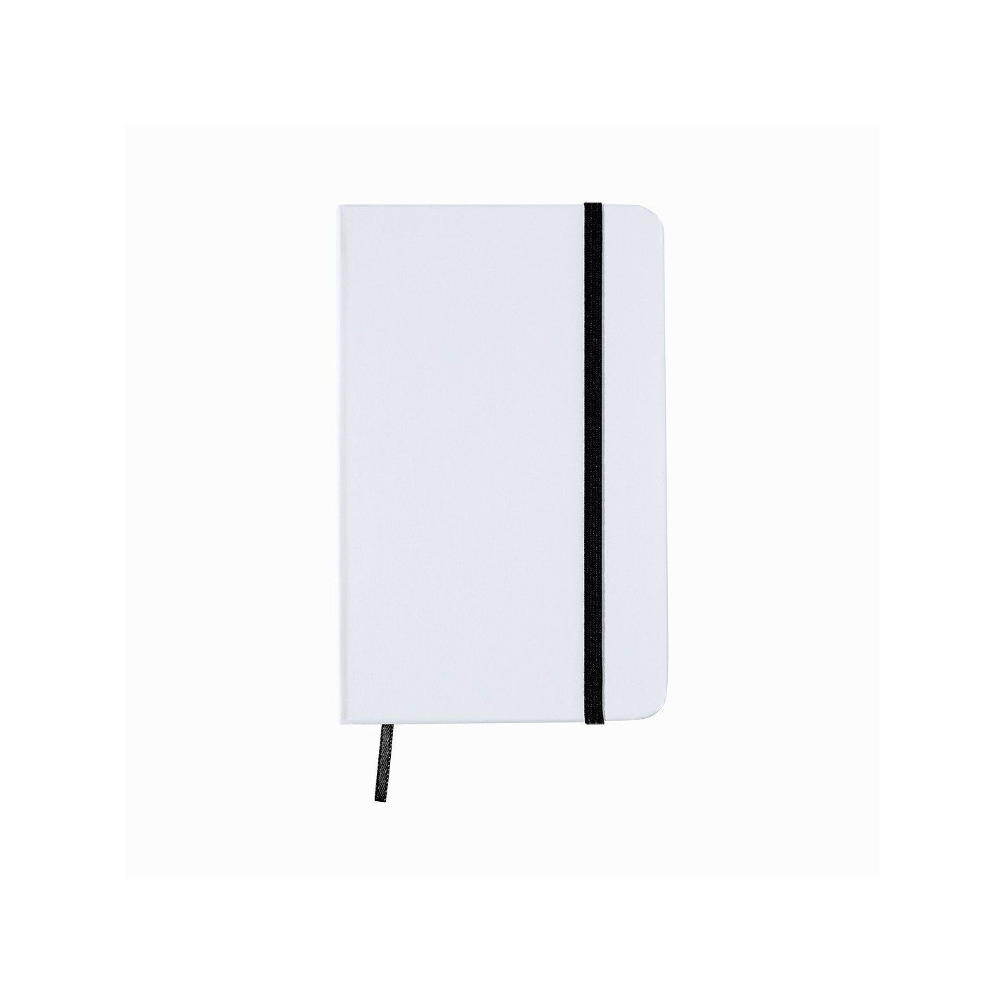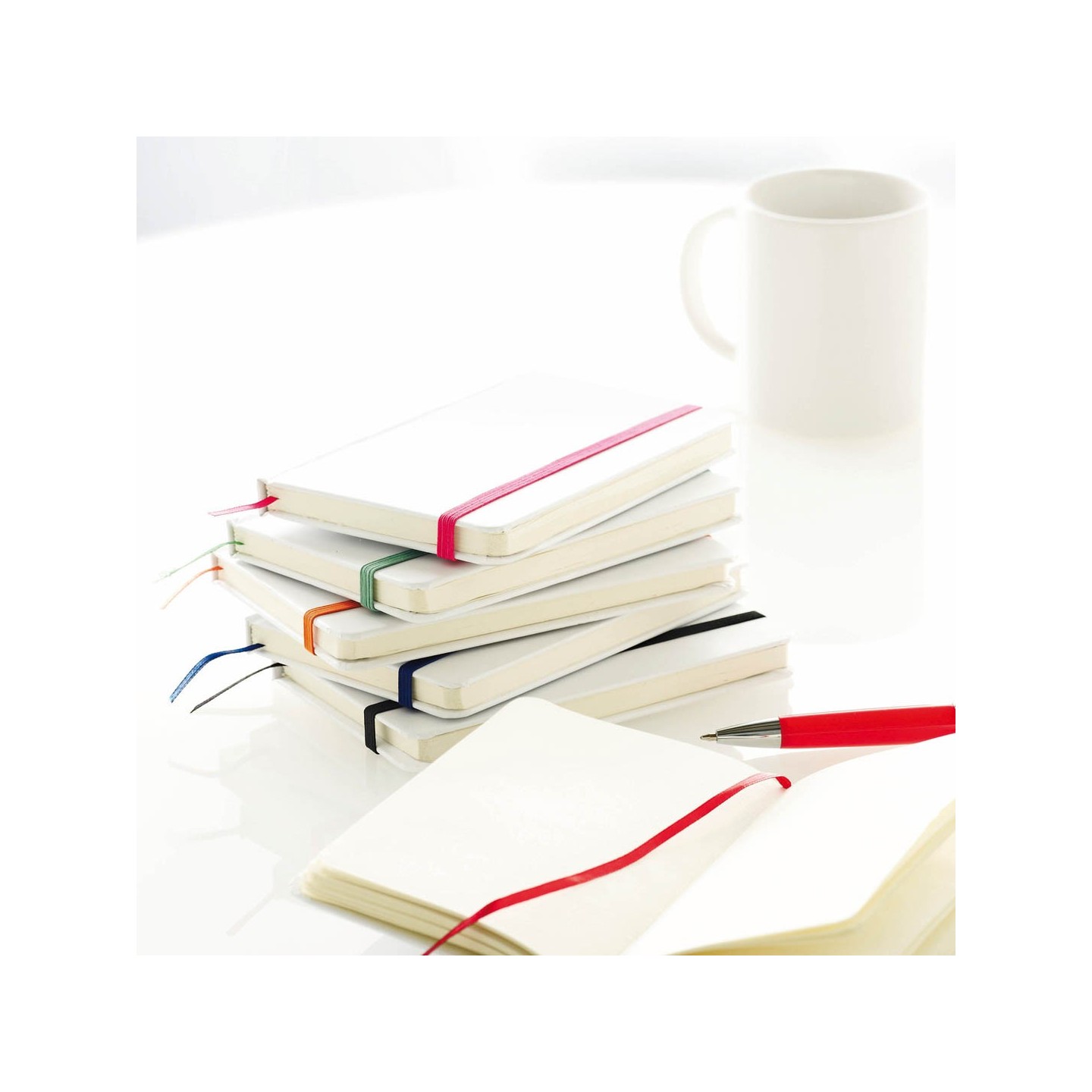 El Bloc Notas Yakis tiene tapas de cartón blanco resistente, 80 hojas lisas, elástico de sujeción y marcapáginas de tela. Calidad y estilo en un bloc personalizable.