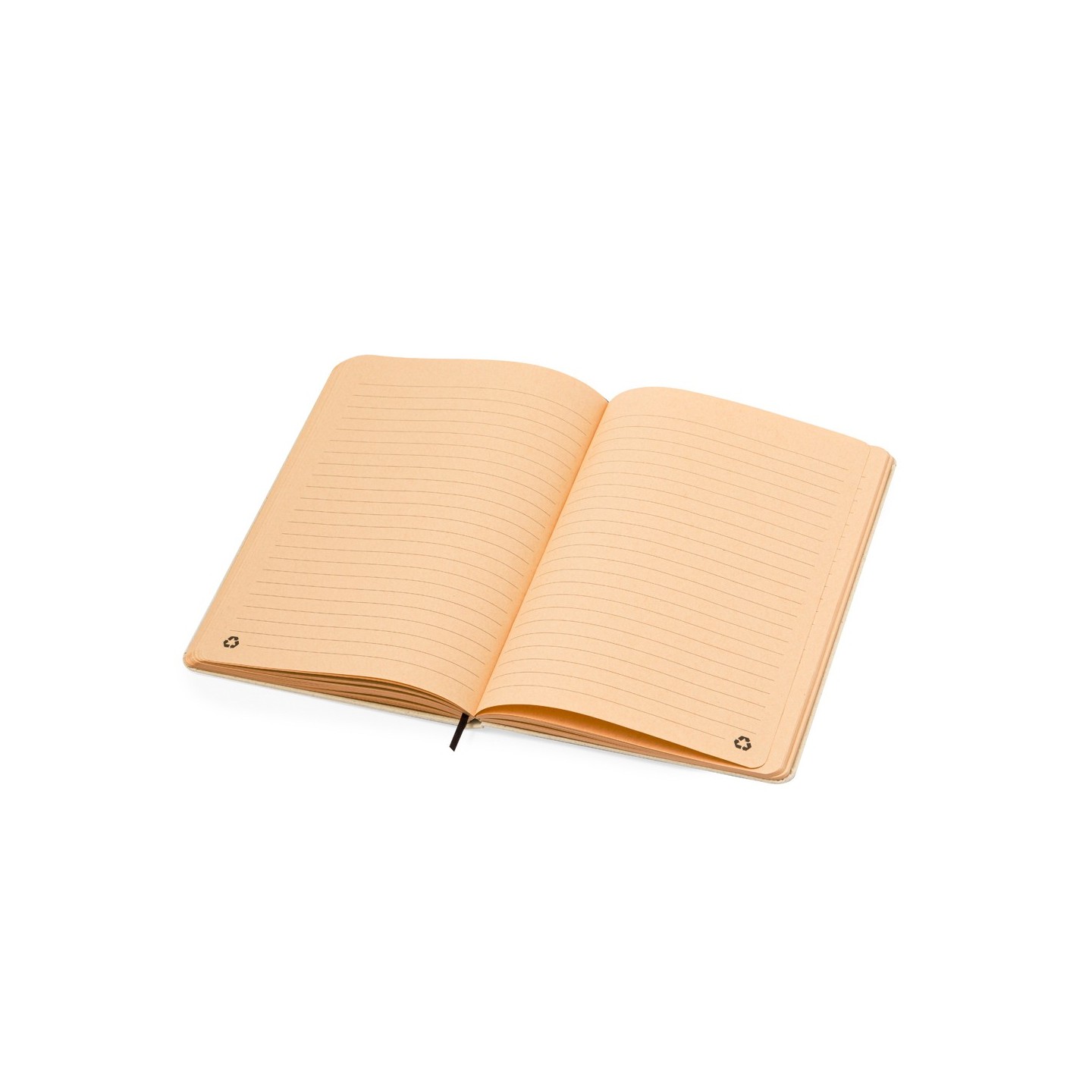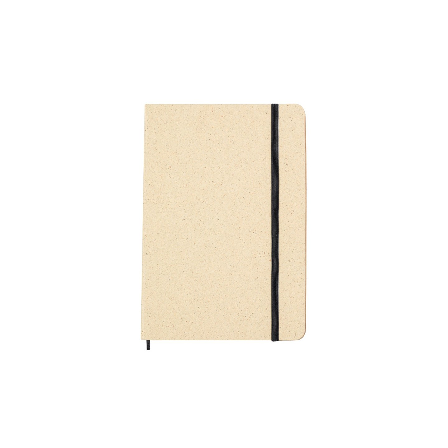 El Bloc Notas Yerx tiene un tamaño A5, tapas duras de hierbas recicladas, 80 hojas kraft, marcapáginas y banda elástica. Personalizable y eco-amigable