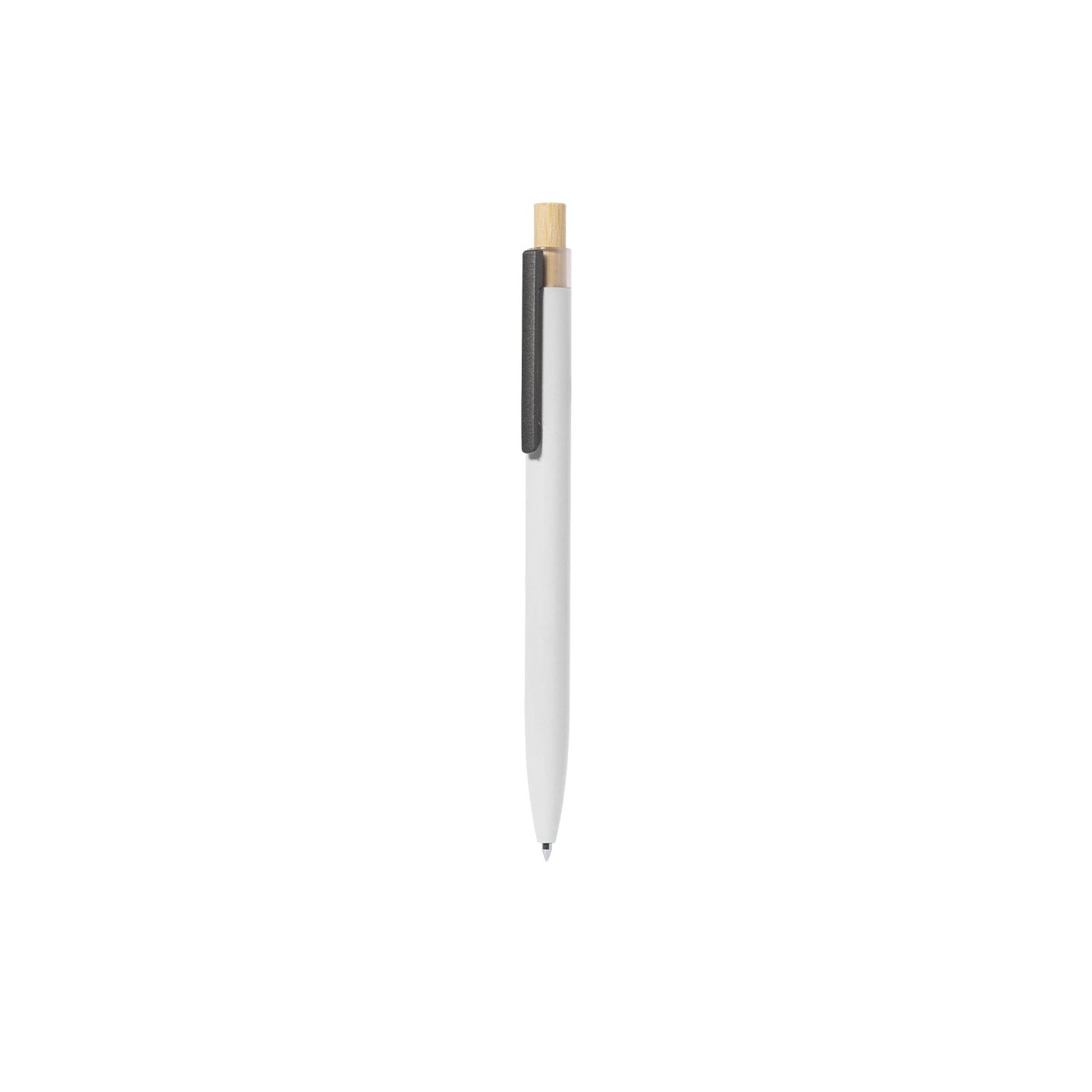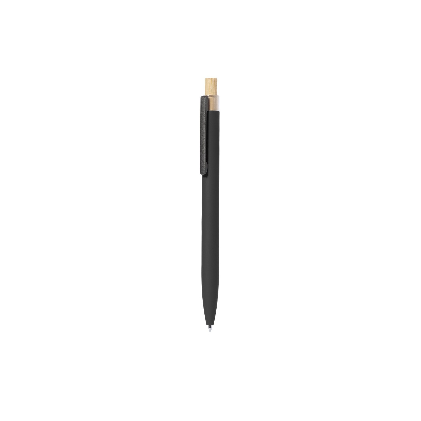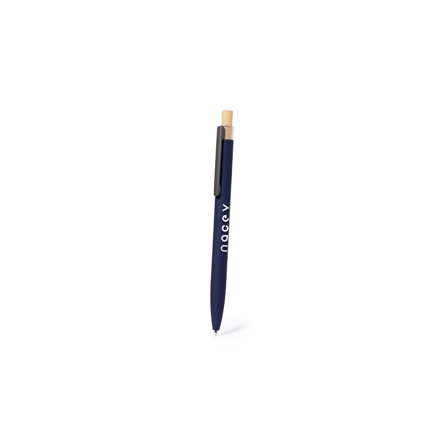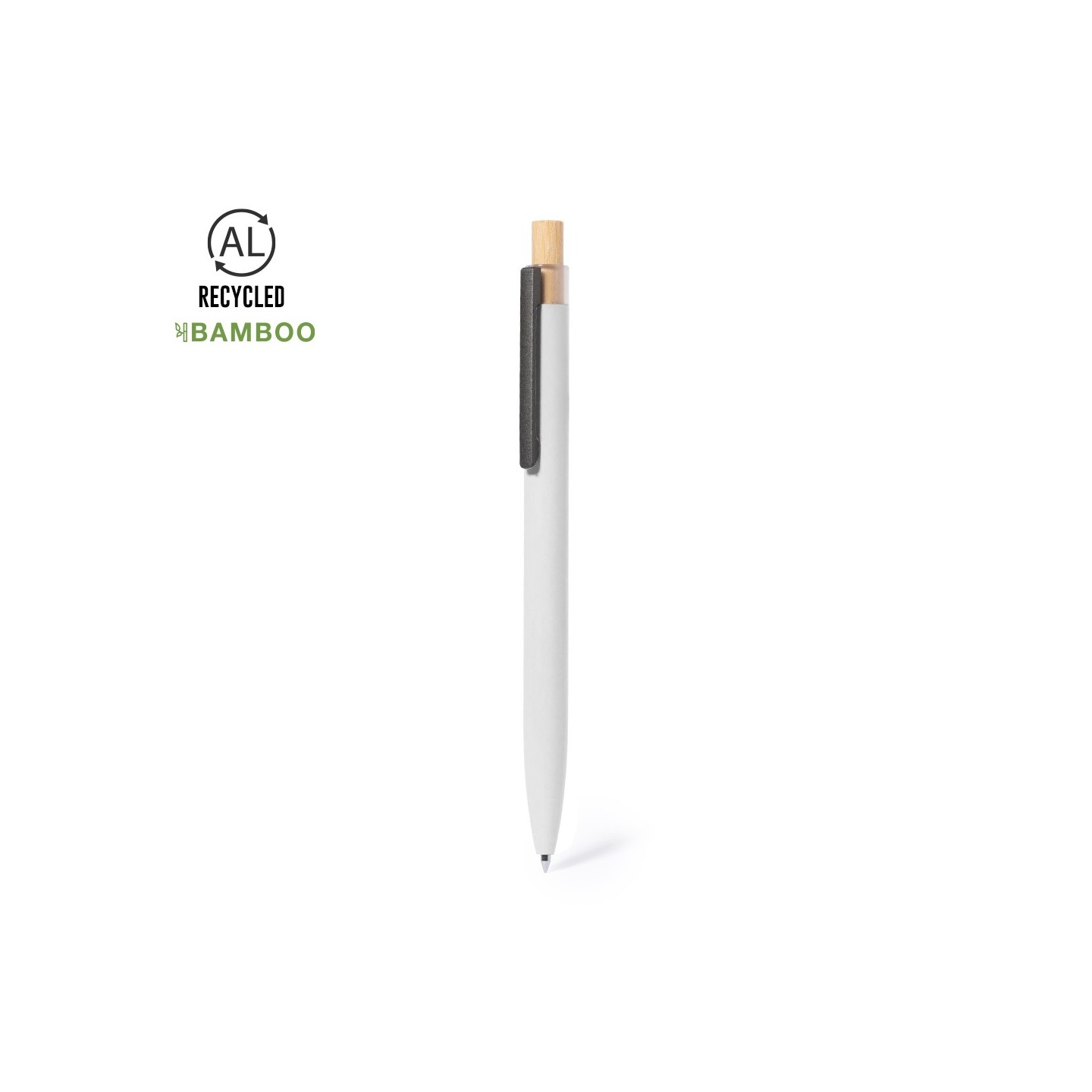 Bolígrafo de mecanismo pulsador fabricado en aluminio reciclado. Pulsador en bambú y cuerpo acabado goma, disponible en variada gama de elegantes colores. Clip metálico y distintivo aluminio reciclado en la parte superior del bolígrafo. De cartucho jumbo y en tinta azul. Presentado en bolsa individual reciclada.
