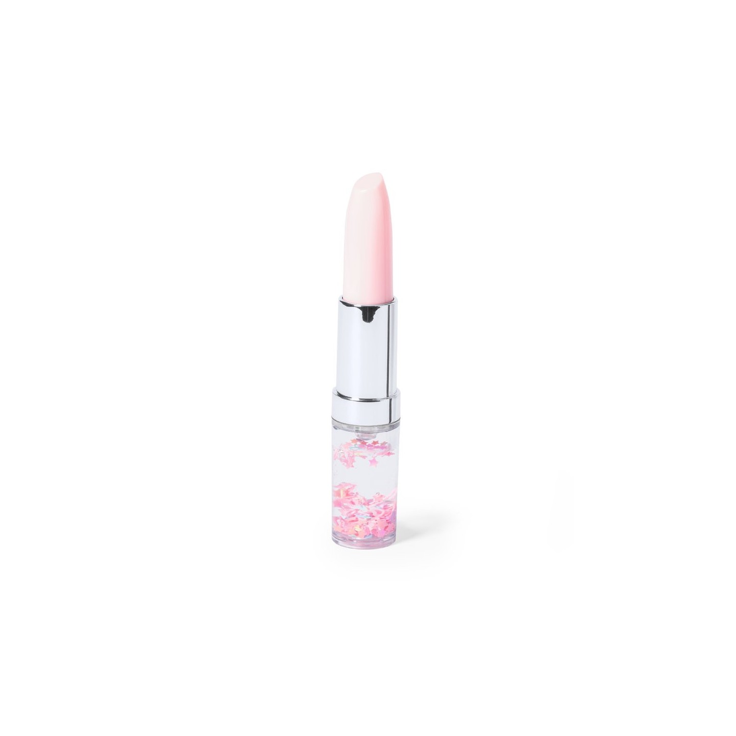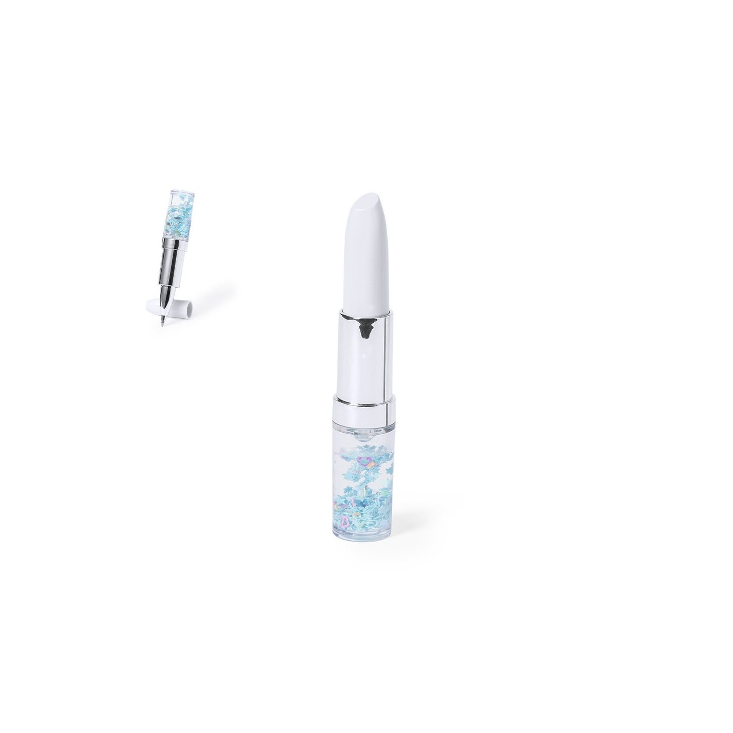 Original bolígrafo en forma de pintalabios, con líquido interior en colorido diseño. Con capucha y en tinta azul.