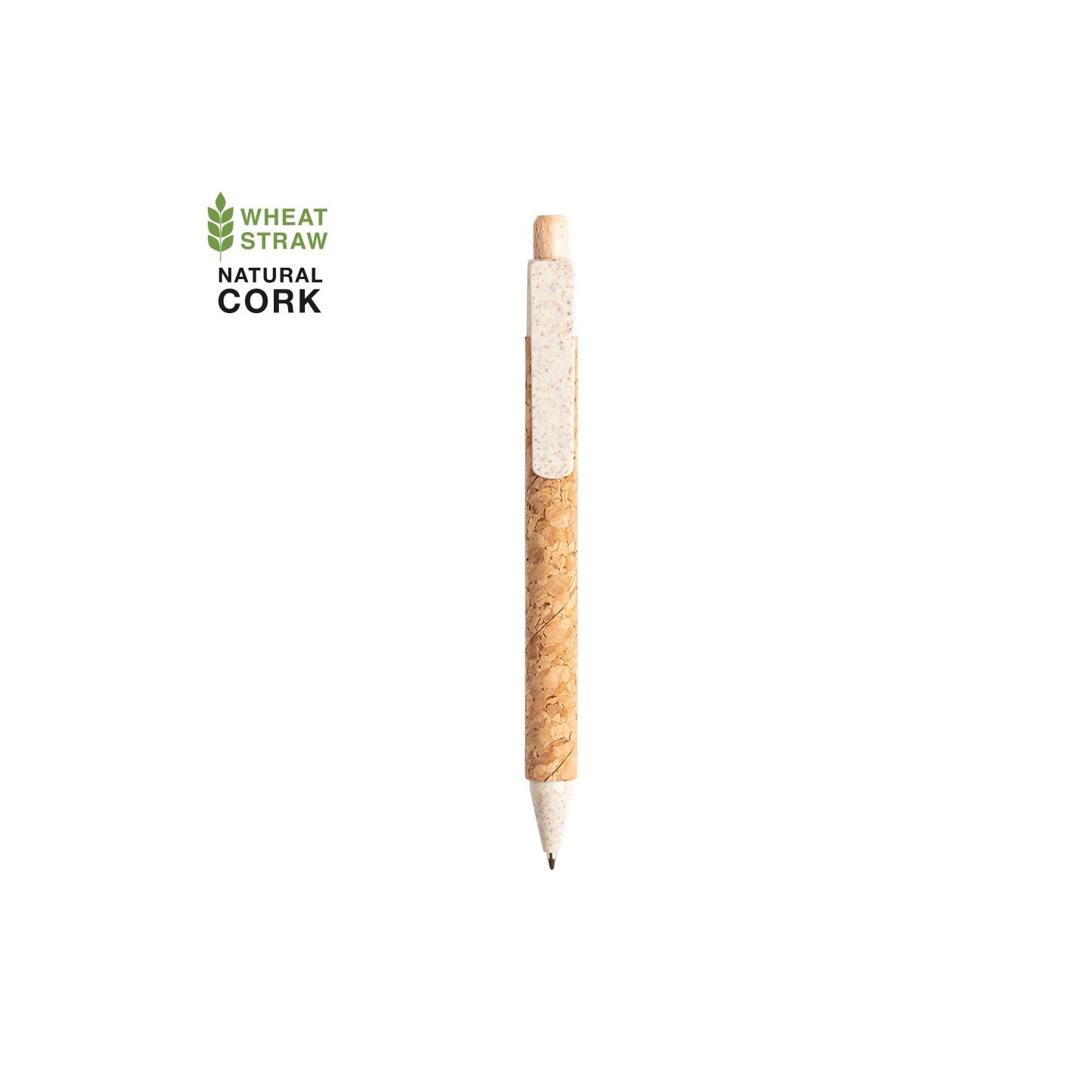 El Bolígrafo Clover es eco-friendly y elegante. Cuerpo de corcho, detalles en caña de trigo. Personalización en tampografía. Mecanismo pulsador y tinta azul.