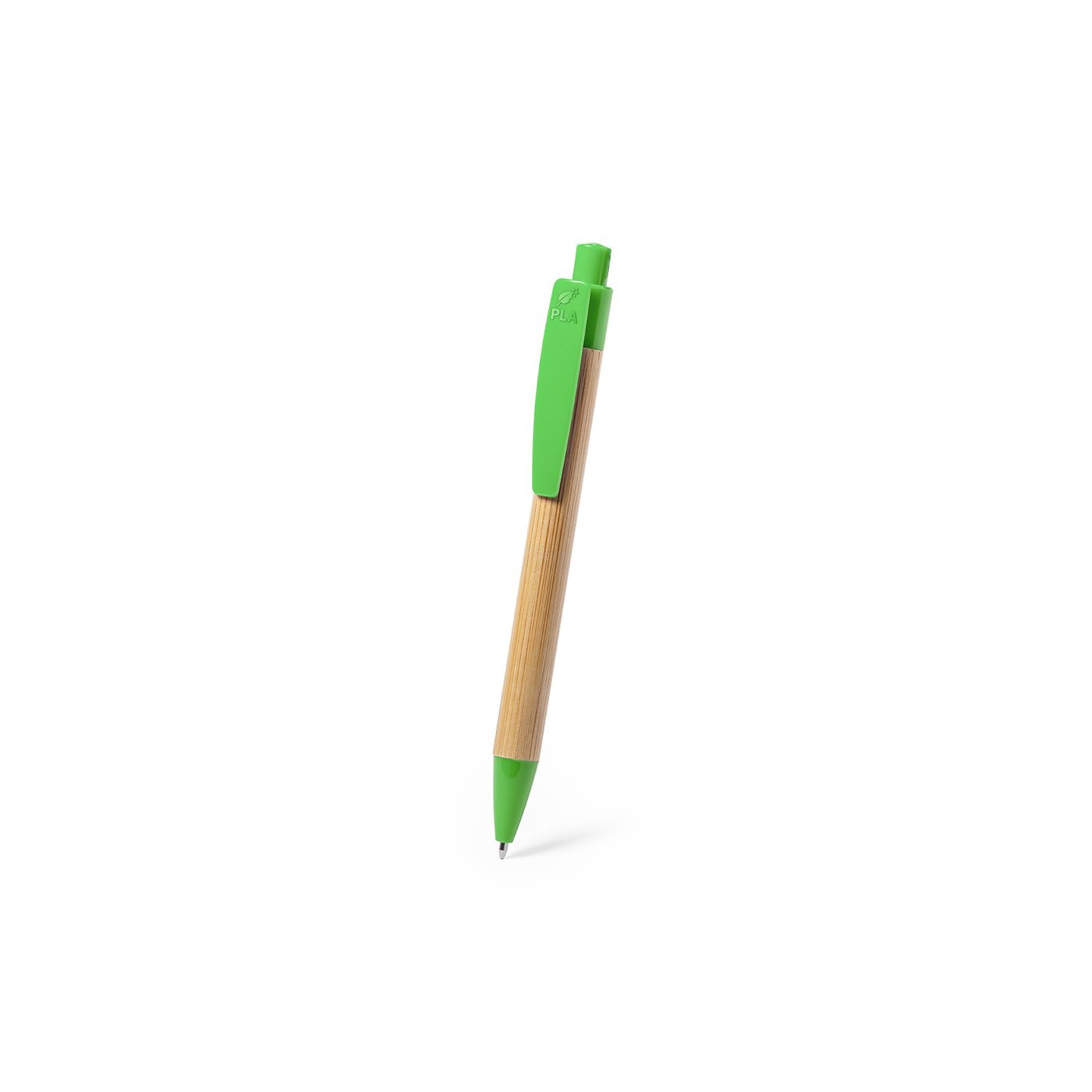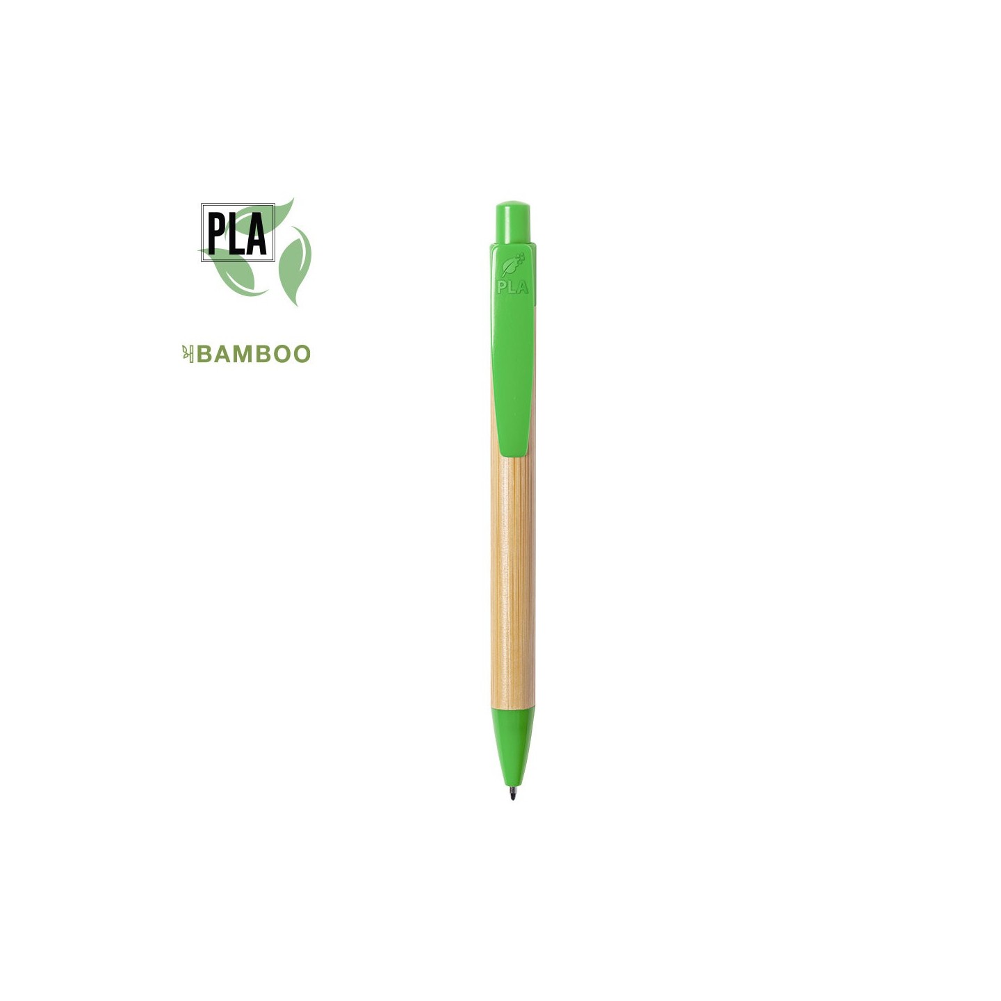 El cuerpo del bolígrafo está elaborado en bambú brillo, un material natural conocido por su belleza y durabilidad. Además, los accesorios del bolígrafo, como el clip, están fabricados en PLA (Ácido PoliLáctico), un bioplástico obtenido a partir de recursos renovables, como el almidón de maíz, la yuca o la caña de azúcar.