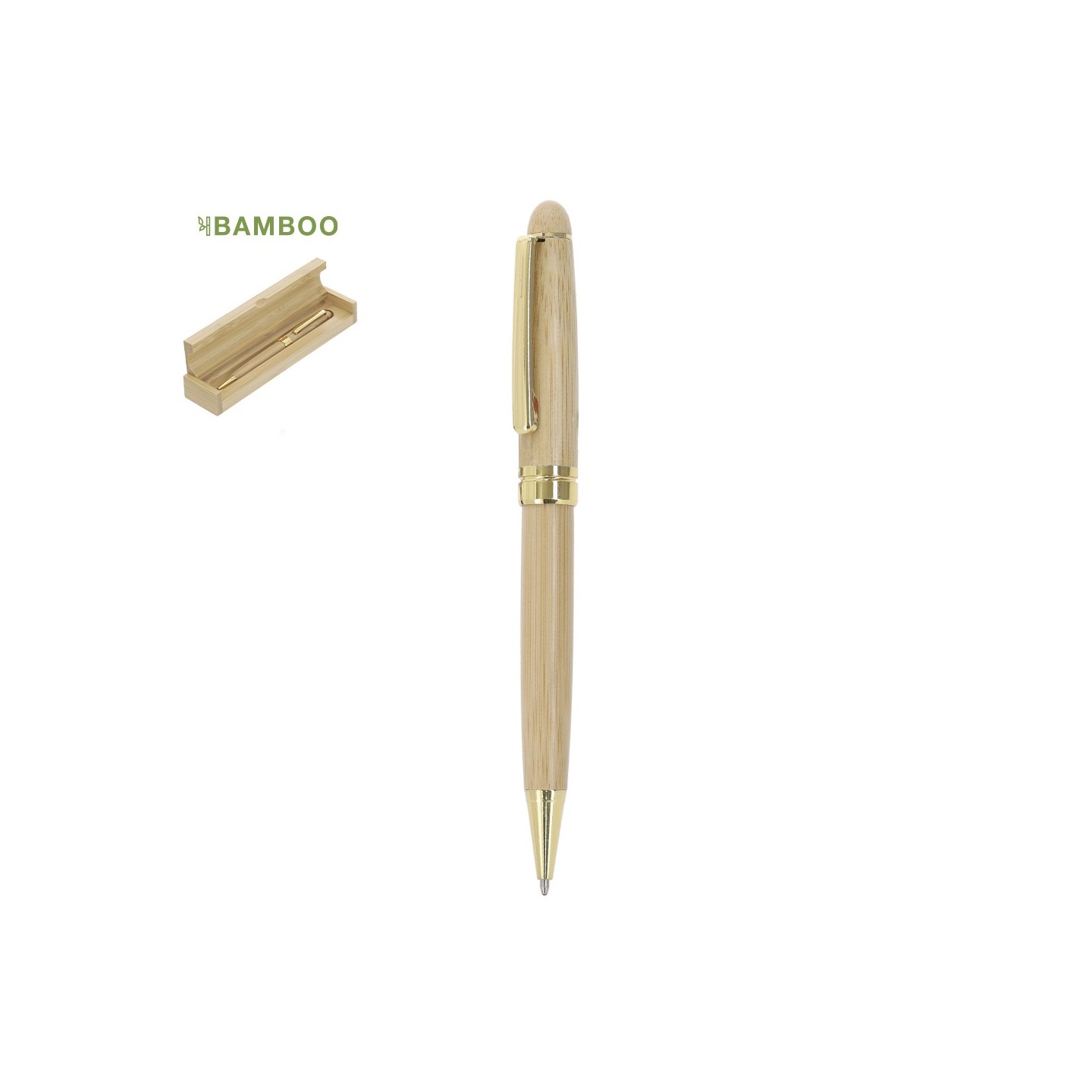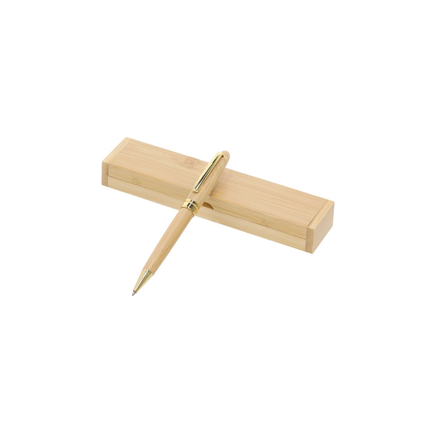 Bolígrafo HOLAN elegante de bambú natural con detalles metálicos dorados. Personalizable con tu logotipo. Presentado en estuche de bambú. Perfecto para empresas eco-friendly.