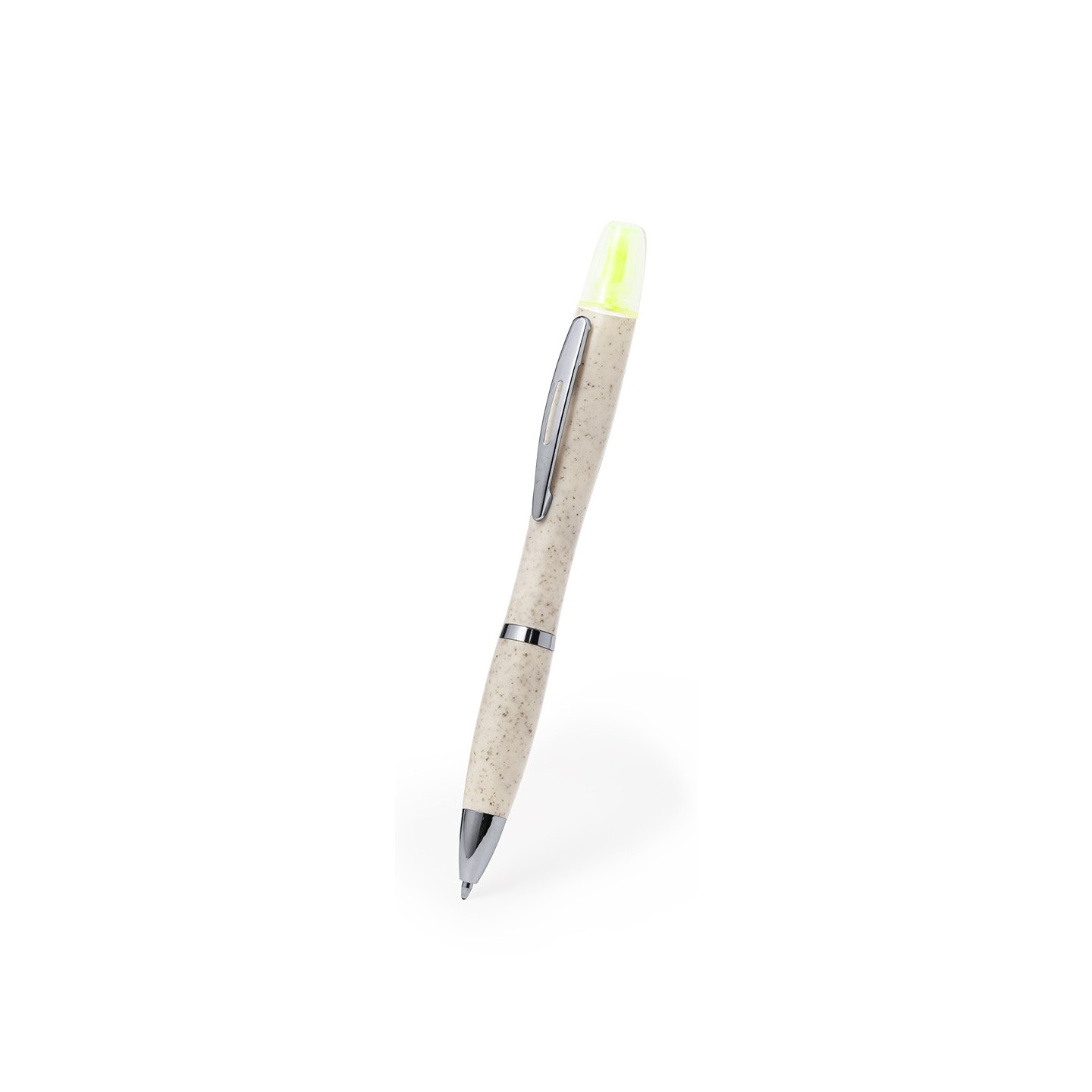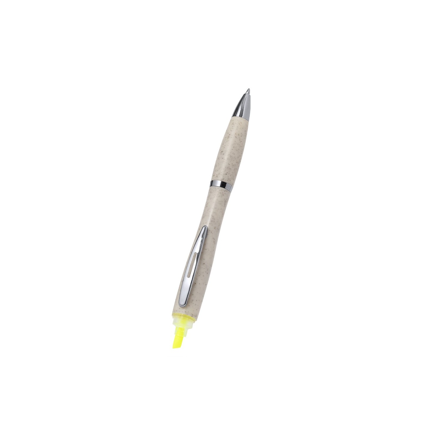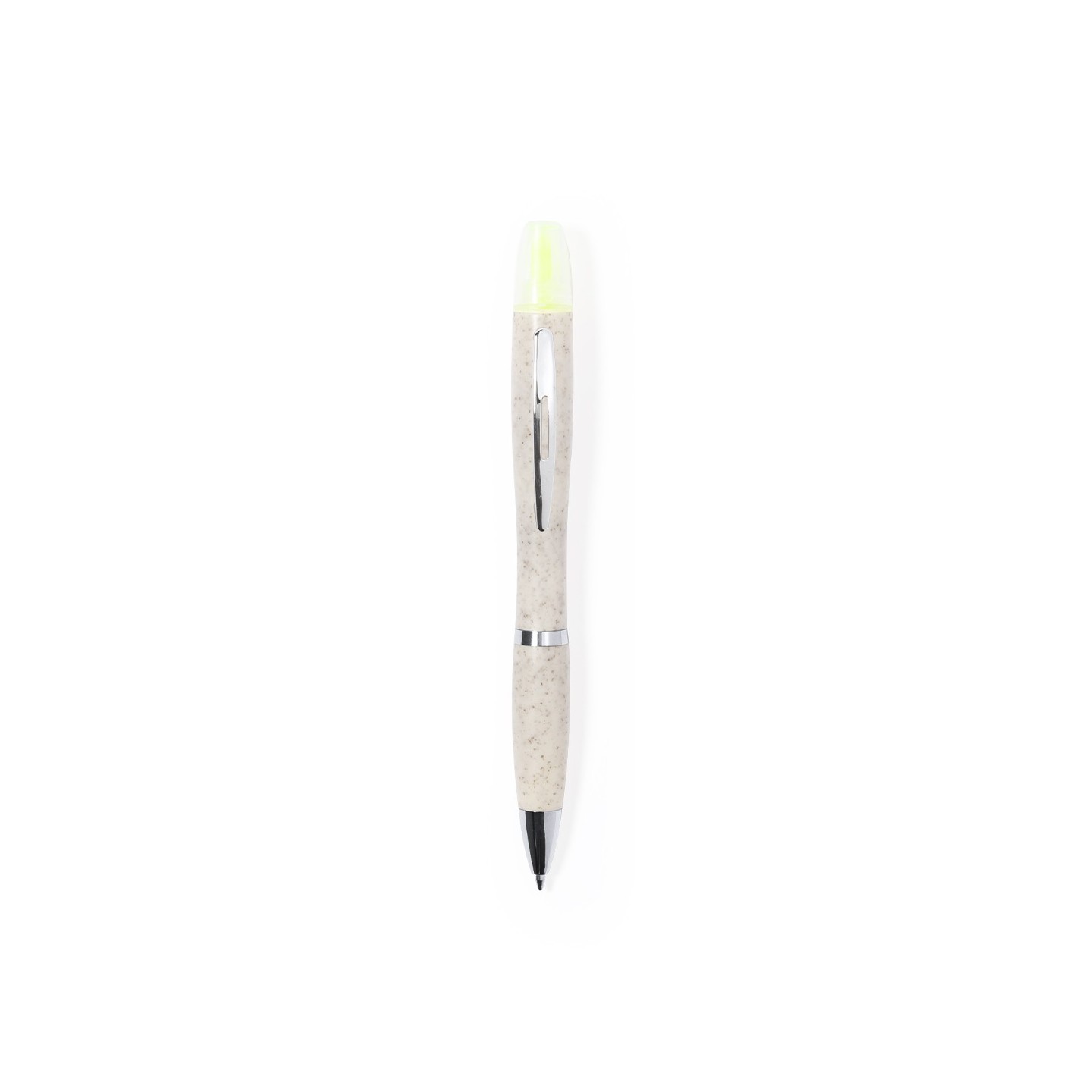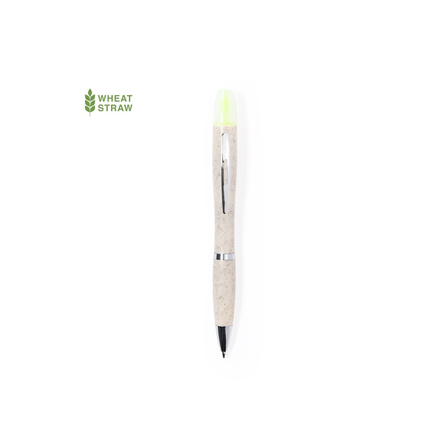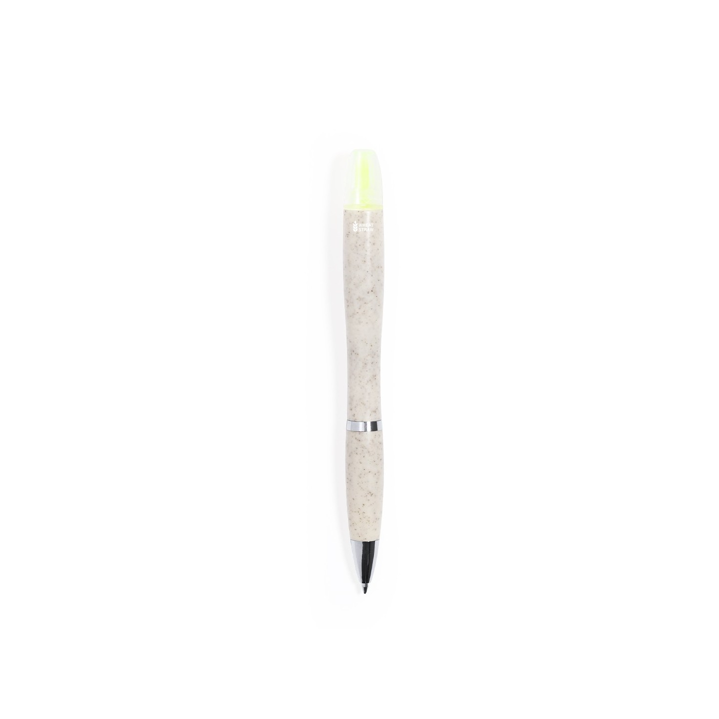 El Bolígrafo Kinun es eco-friendly, con marcador amarillo fluorescente. Personalizable para empresas. Fabricado en caña de trigo y ABS