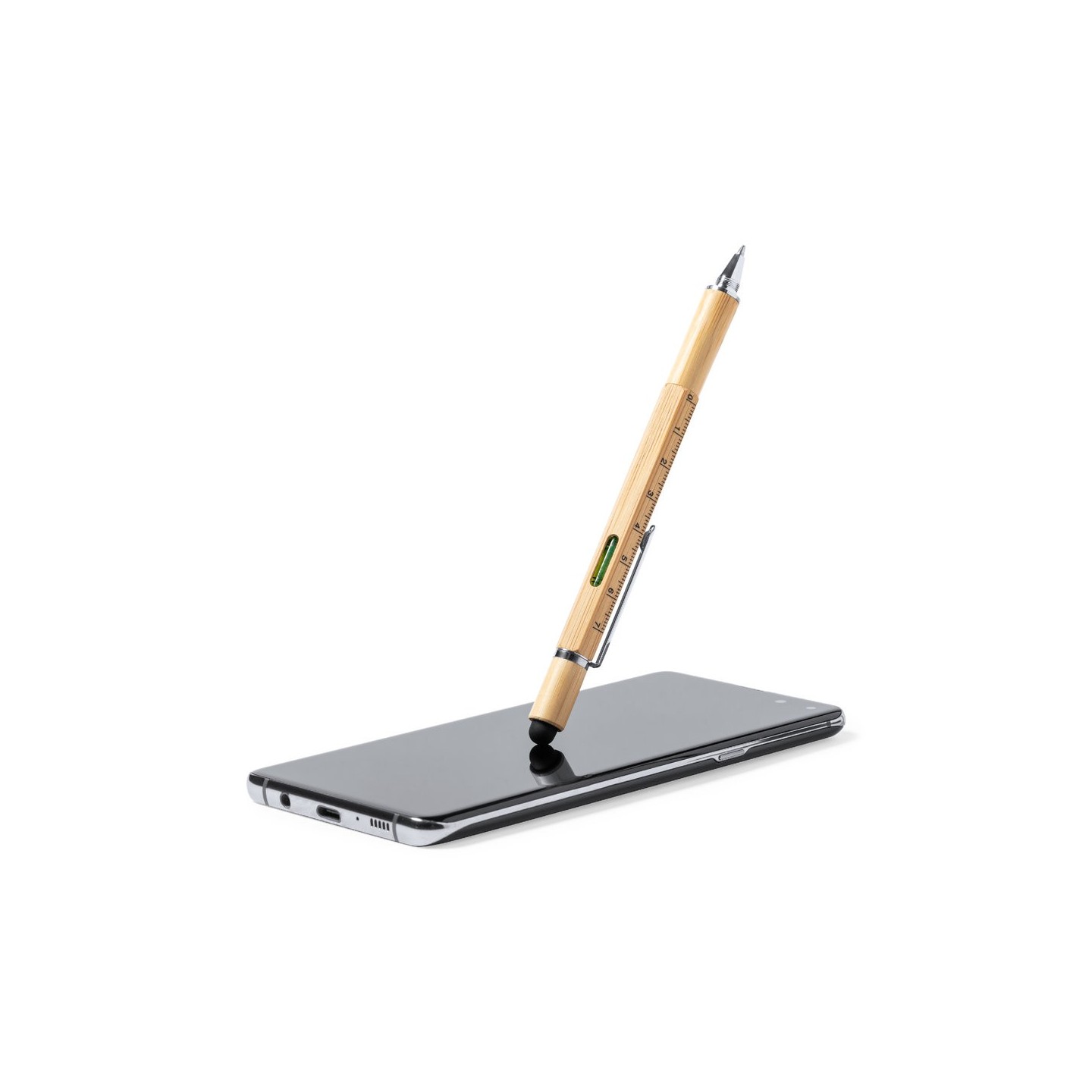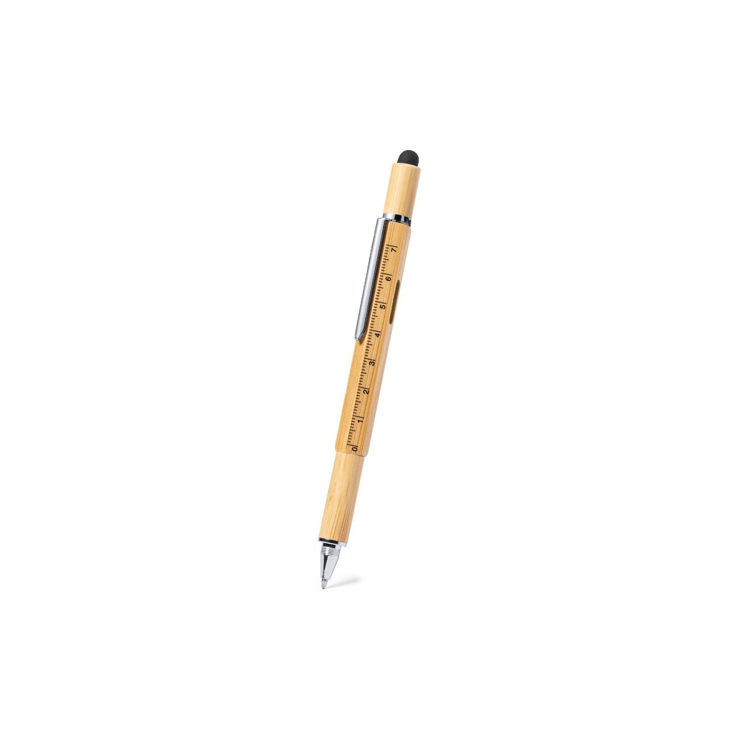El Bolígrafo Multifunción Rakars desprende elegancia y versatilidad en bambú. Tinta azul, puntero táctil, destornilladores, regla. 1 accesorio, 6 funciones.
