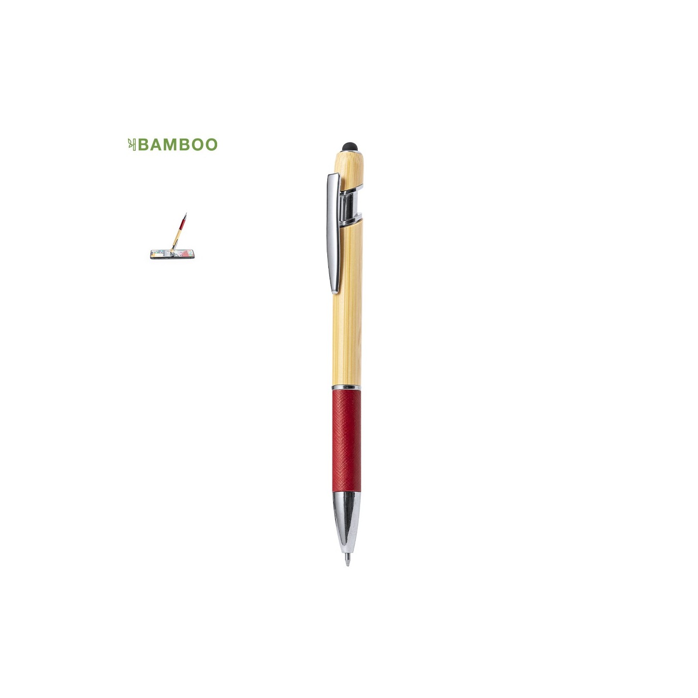 Además de su funcionalidad y estilo, el Bolígrafo Puntero Filipo está elaborado con elementos vegetales, como el bambú, para fomentar el uso de materias primas naturales y reducir las emisiones contaminantes.