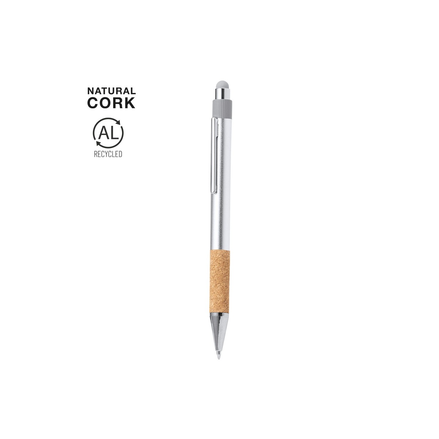 El corcho utilizado en la fabricación de este bolígrafo es un elemento vegetal que fomenta el uso de materias primas naturales, contribuyendo a la reducción de las emisiones contaminantes. Además, el Aluminio Reciclado ofrece posibilidades de reciclaje casi infinitas, sin perder sus propiedades originales y consumiendo menos energía en el proceso.