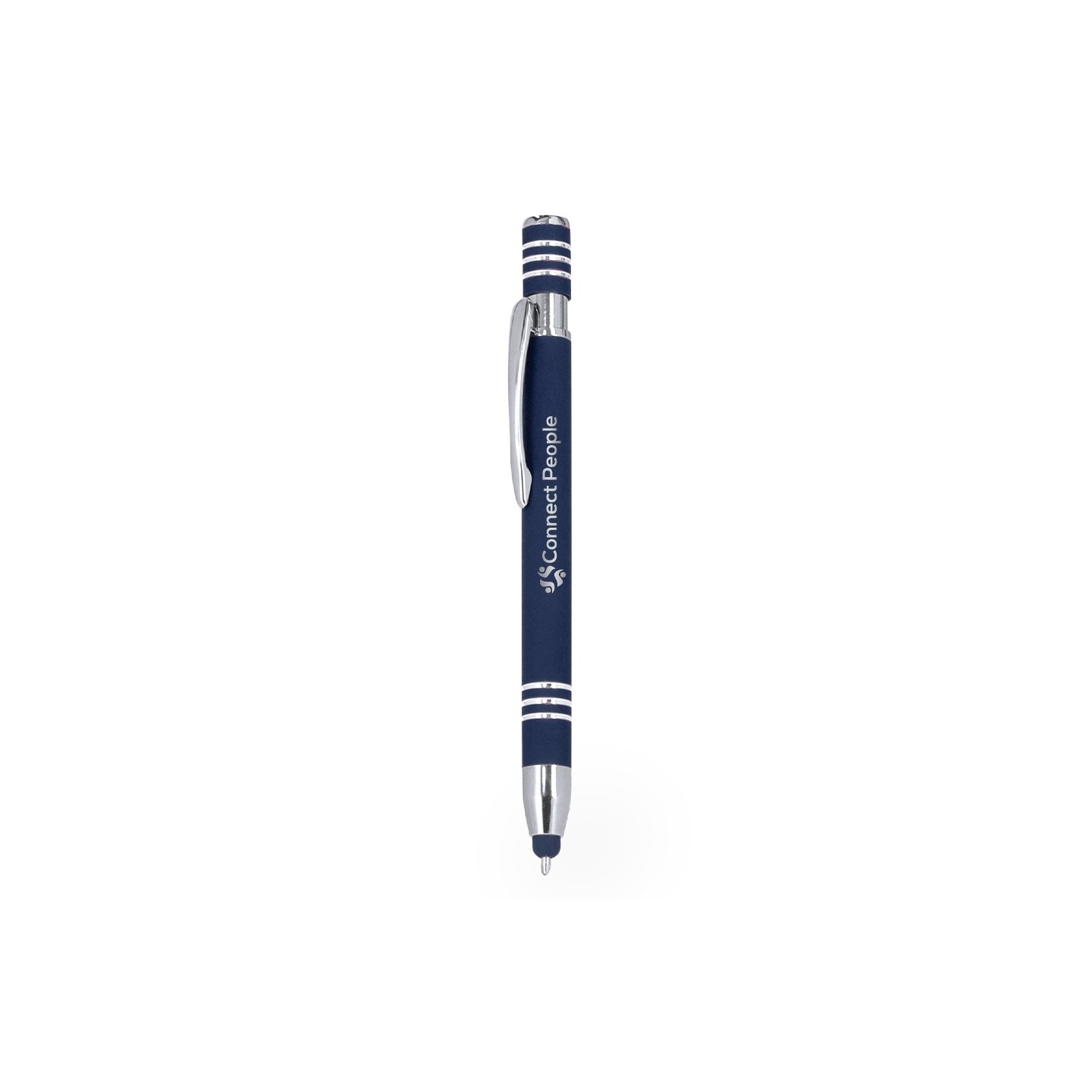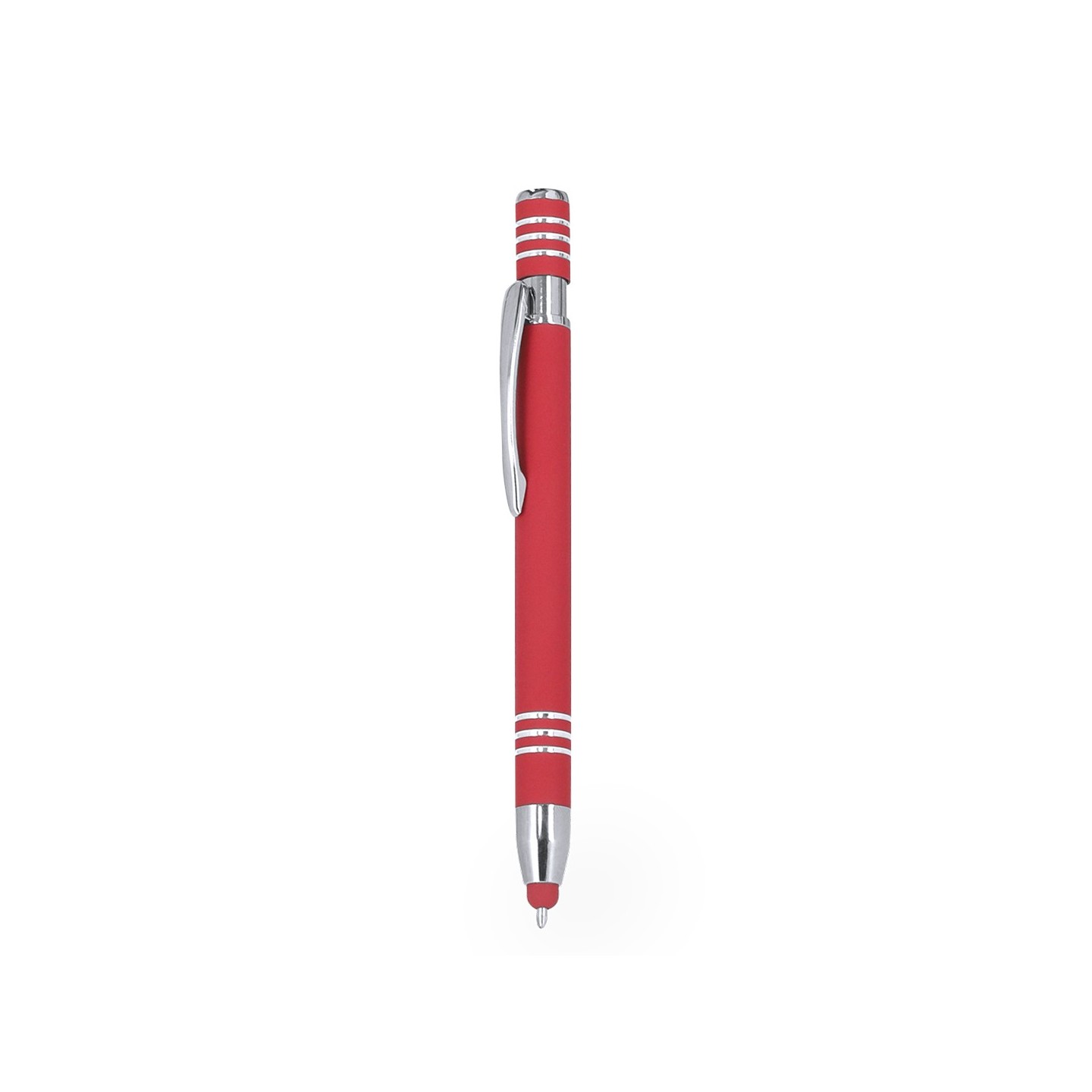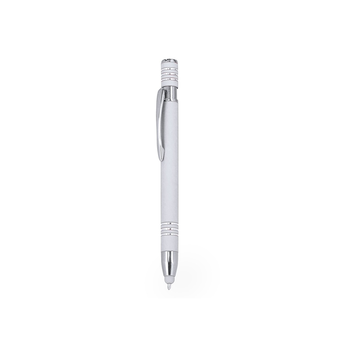 Bolígrafo puntero en aluminio con acabado gomoso y mecanismo pulsador. Personalizable a láser en tono plateado. Incluye accesorios cromados y tinta azul.