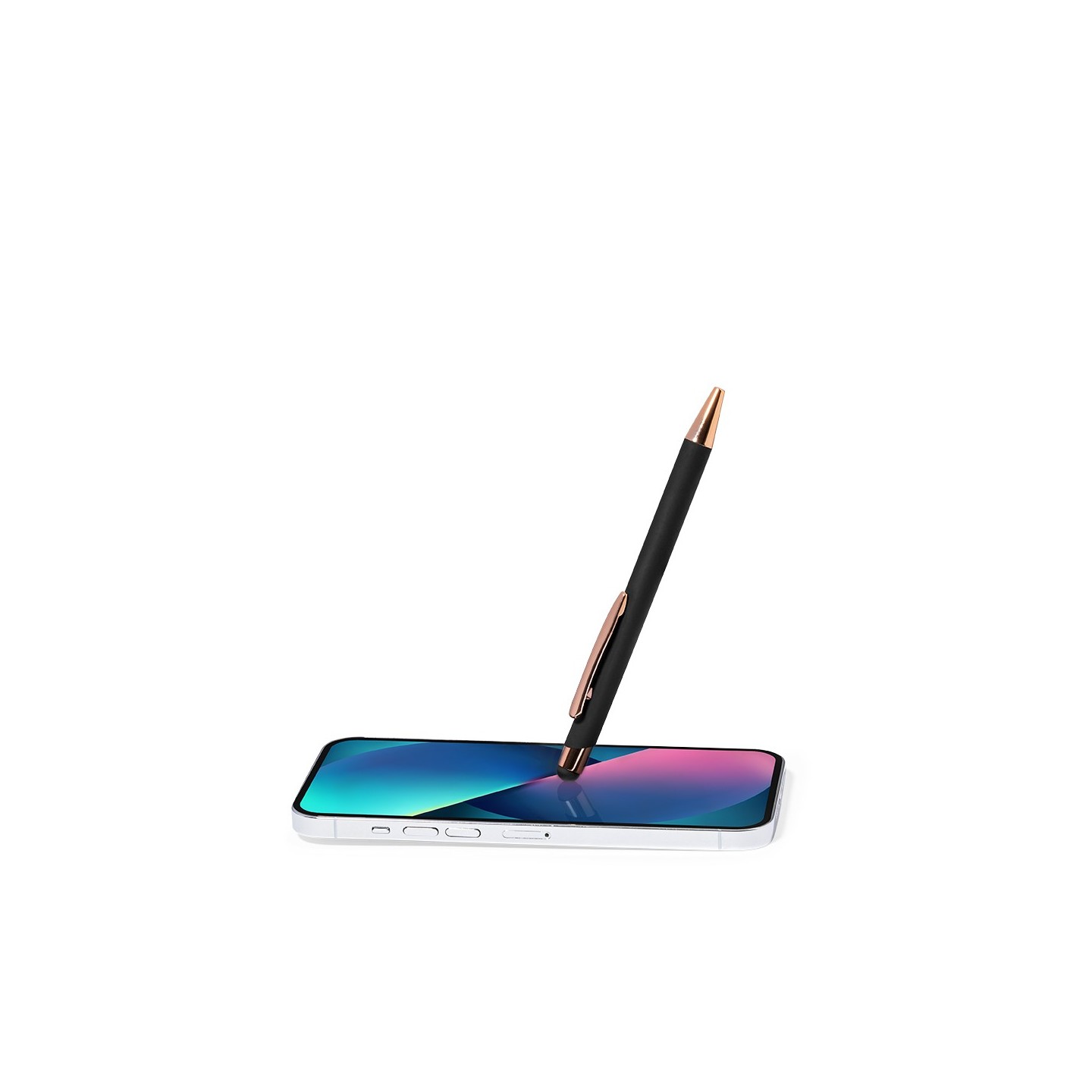 El Bolígrafo Puntero Taulf es una pieza distintiva de la colección, con un diseño meticuloso para brindar funcionalidad y estilo. Este bolígrafo puntero está hábilmente elaborado con tacto de goma, permitiendo un marcaje en láser con un logotipo en color rosado que resalta la identidad de la empresa. Su mecanismo pulsador ofrece comodidad de uso, acompañado de un clip metálico y accesorios en un acabado cobrizo que aportan elegancia y durabilidad.