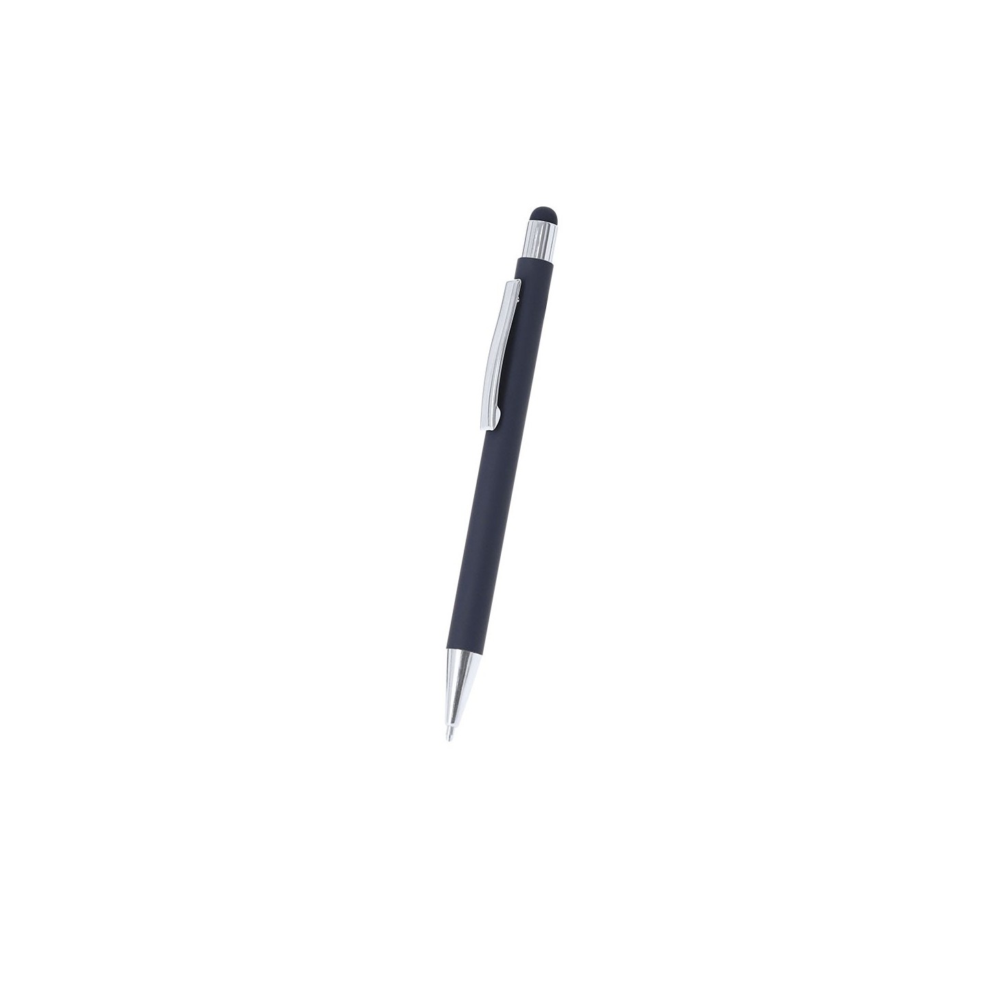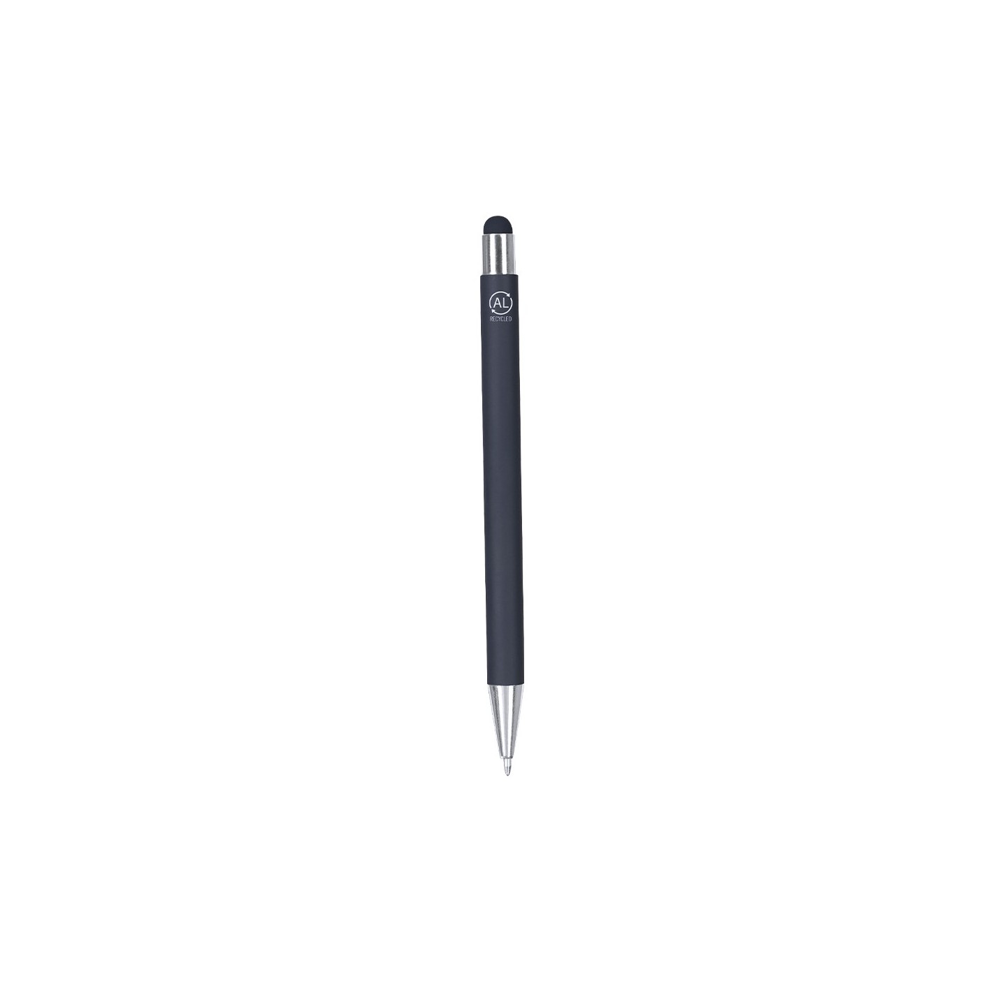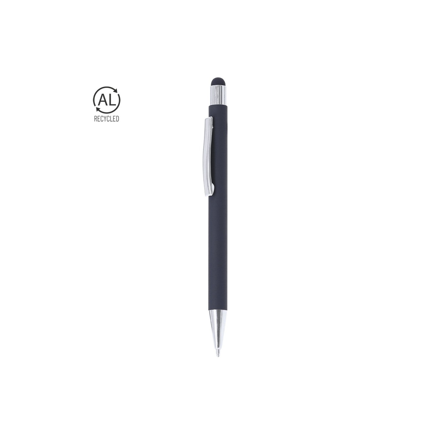 Bolígrafo puntero personalizable de aluminio reciclado con pulsador cromado, cuerpo de goma para marcaje láser, tinta azul y certificación GRS. Ideal para merchandising.