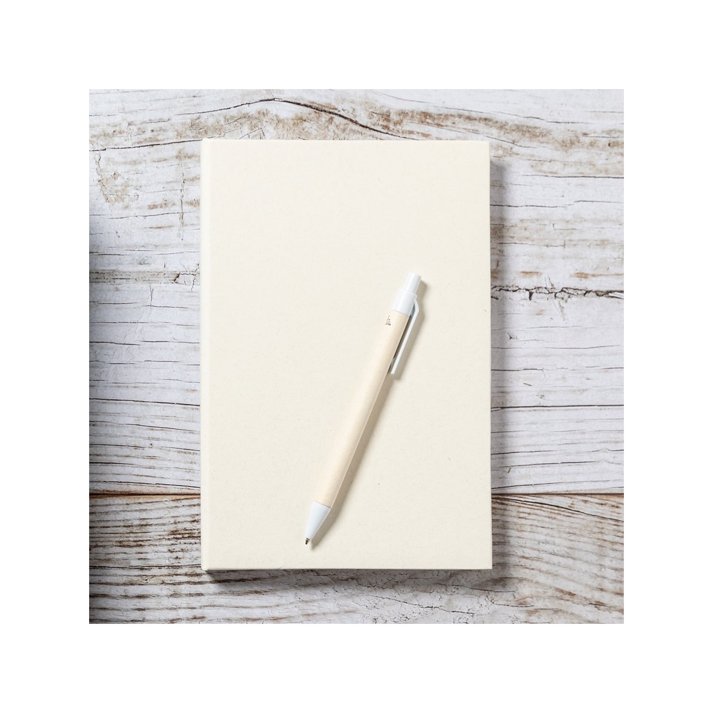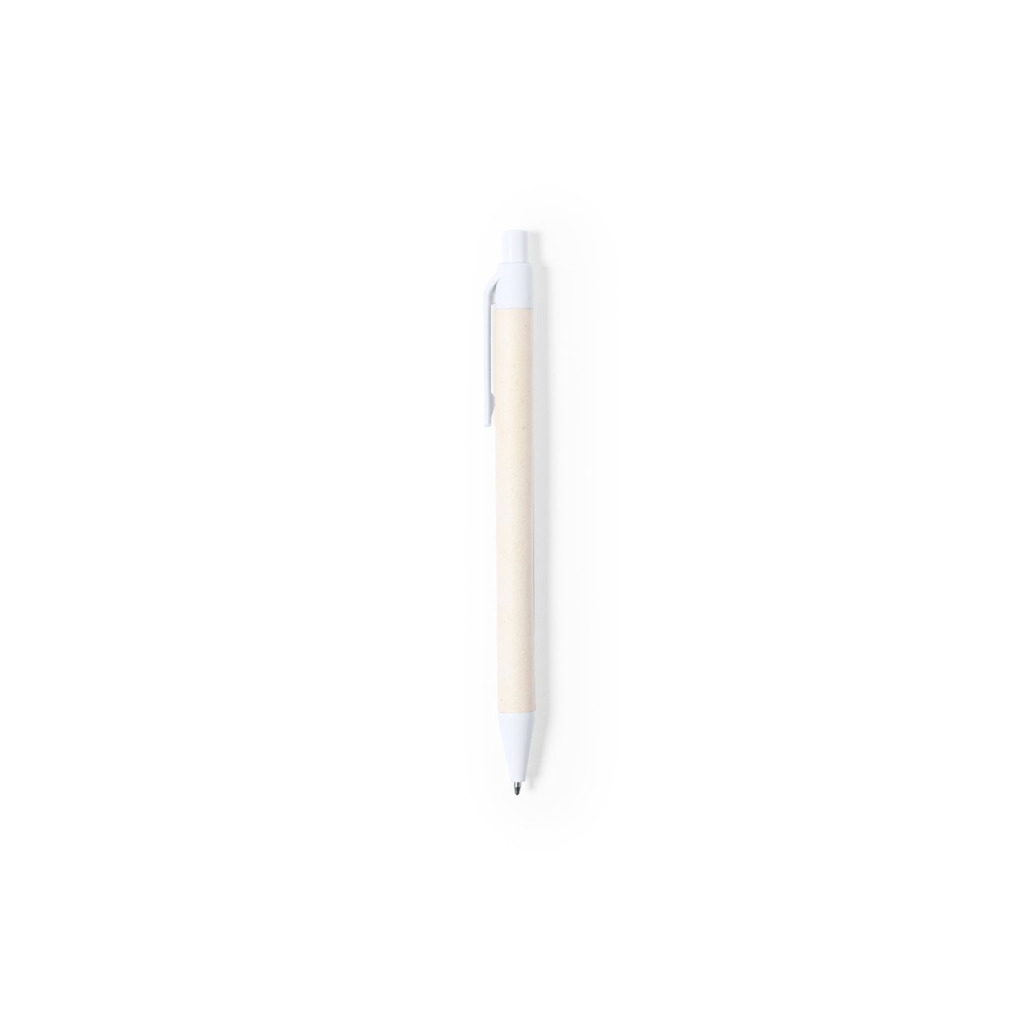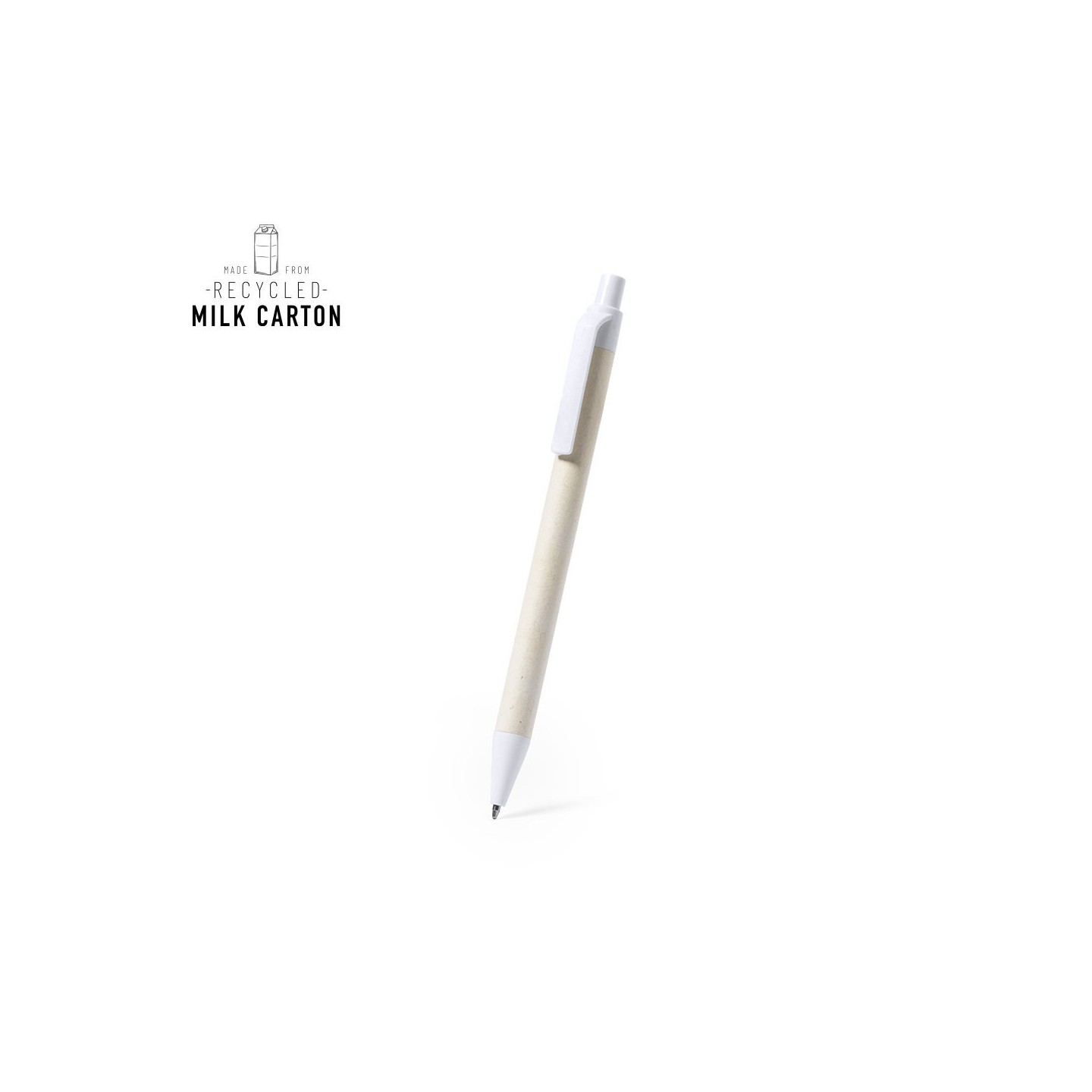 El Bolígrafo Roliok destaca por su cuerpo de cartón de leche reciclado, combinado con detalles en color blanco que añaden un toque de elegancia. Su mecanismo pulsador y tinta azul garantizan una experiencia de escritura suave y fluida.