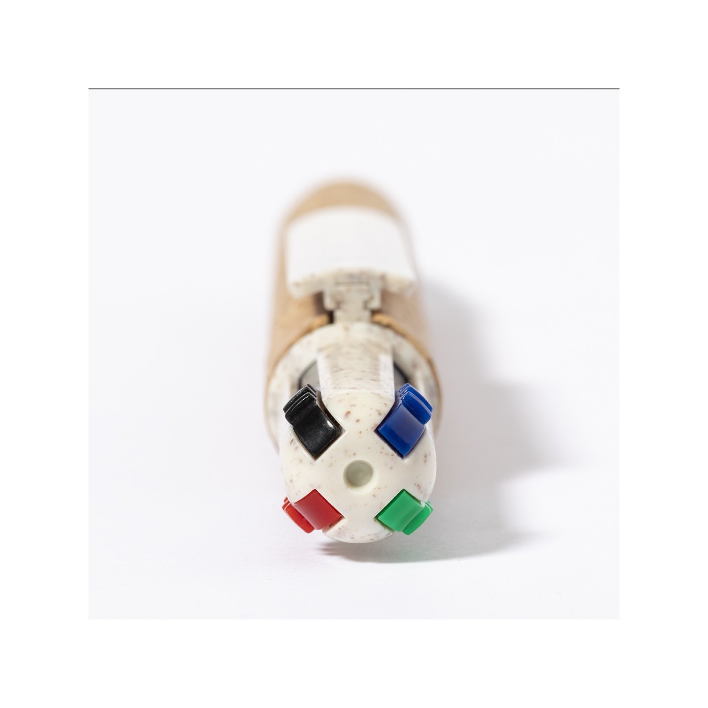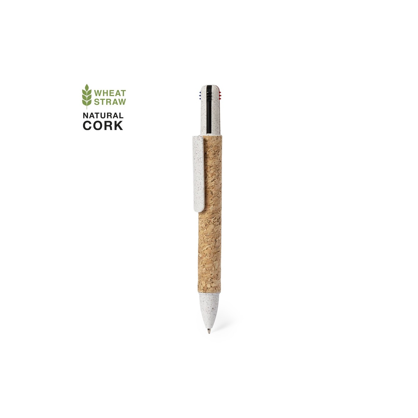 Este bolígrafo 4 en 1, con mecanismo pulsador retráctil, incorpora una combinación innovadora de materiales naturales como el corcho y la caña de trigo, junto con ABS, resaltando su compromiso con el uso y reciclaje de materias primas para reducir las emisiones contaminantes.