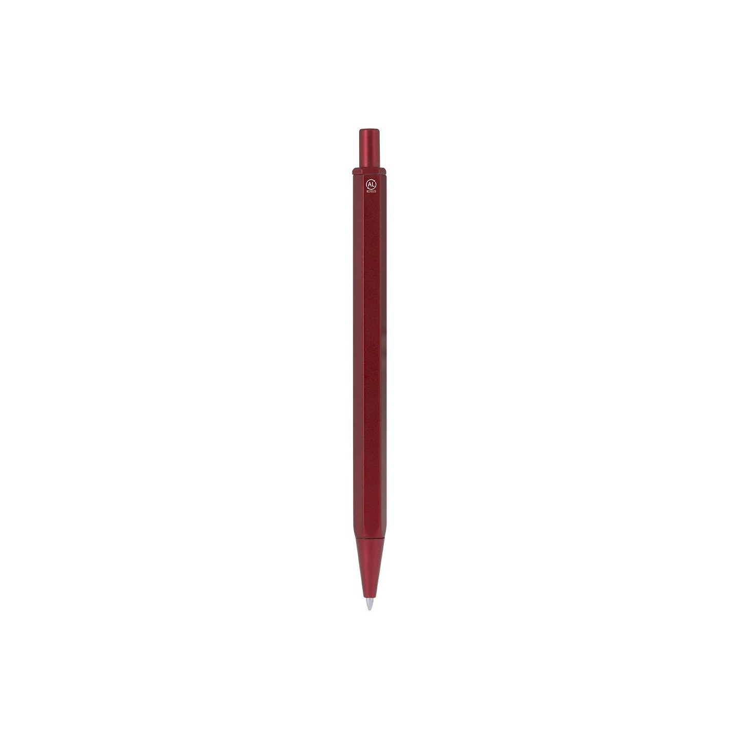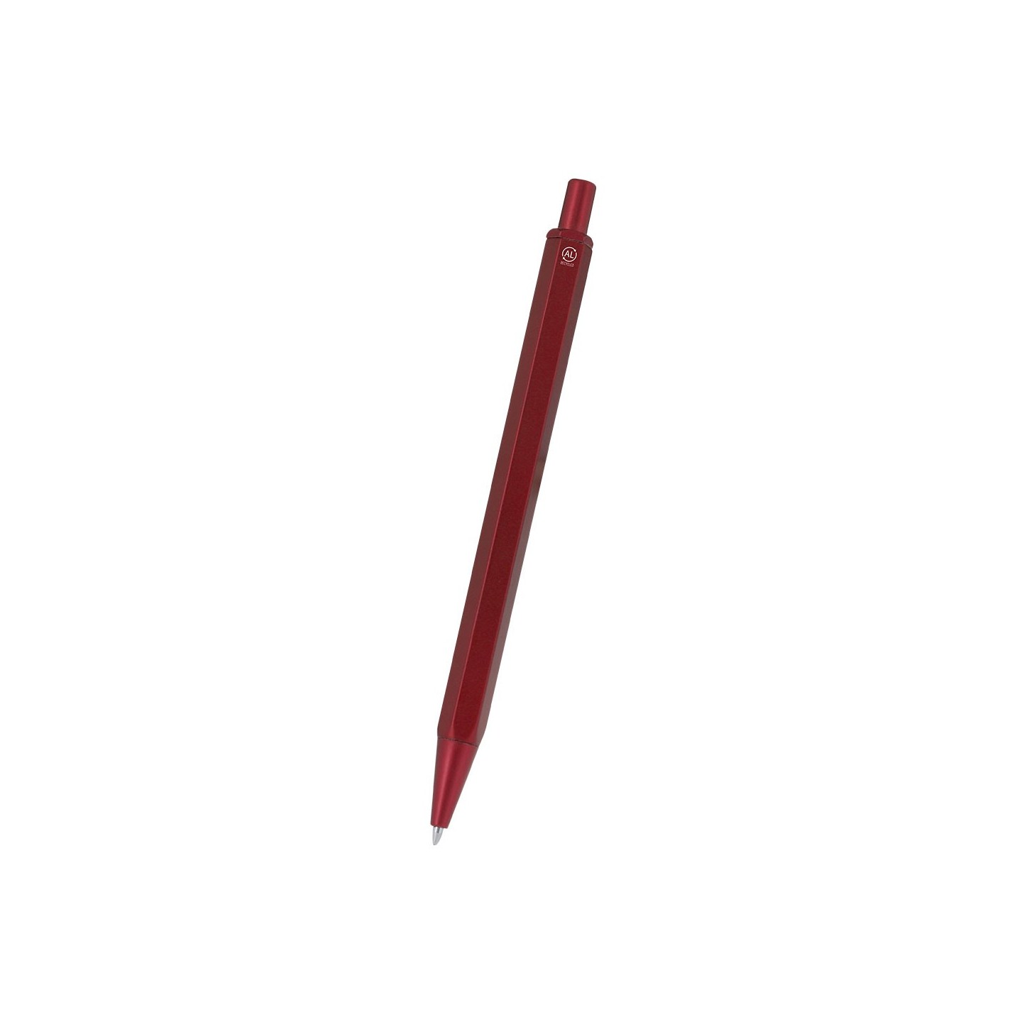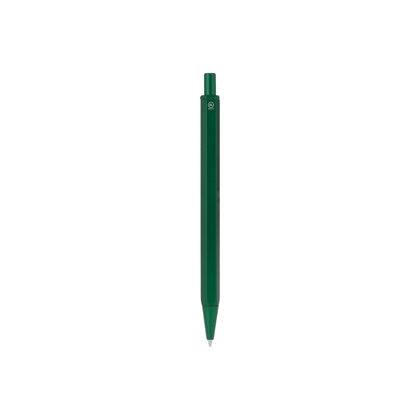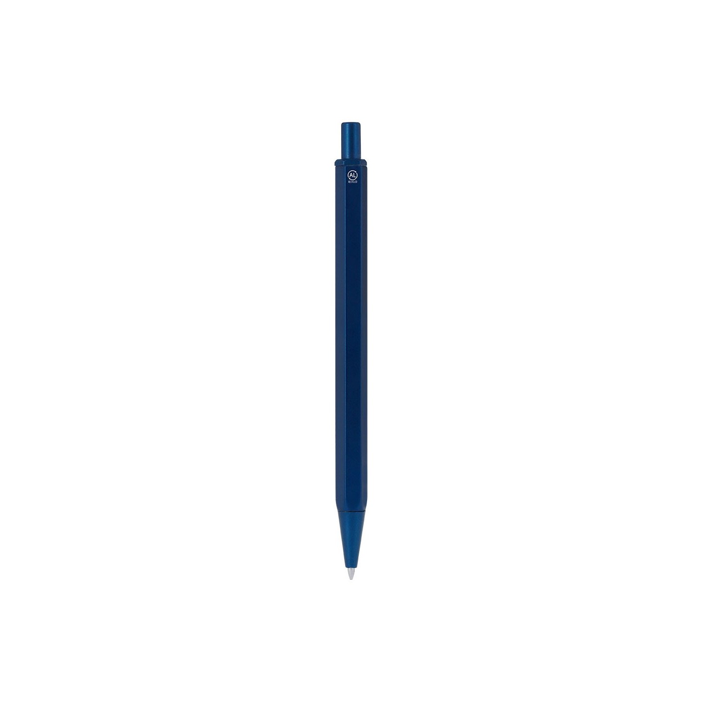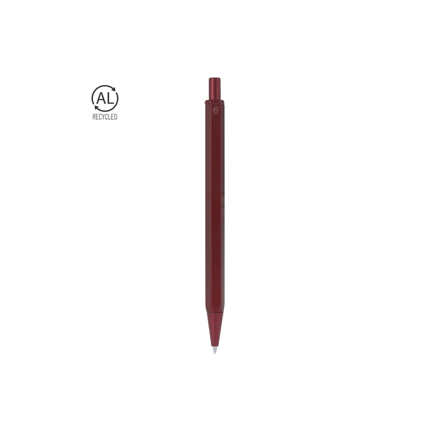 Bolígrafo personalizable fabricado con Aluminio y ABS reciclados. Diseño hexagonal, mecanismo pulsador y tinta azul. Ecológico y elegante, perfecto para merchandising.