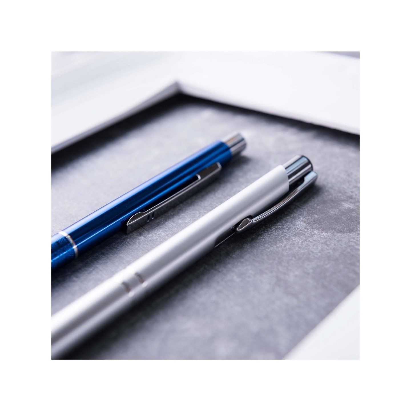 El cuerpo troquelado en aluminio le confiere un aspecto sofisticado y moderno, con un suave acabado en una amplia gama de colores. Además, cuenta con accesorios en plateado, como el clip, las anillas y la punta, que realzan su elegancia.
