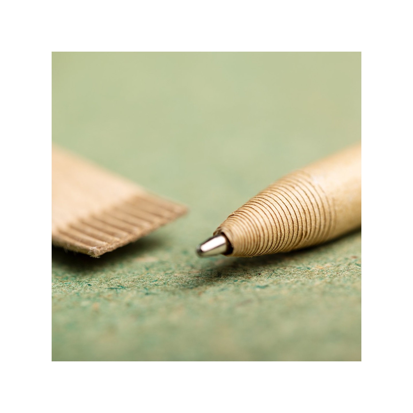 El Bolígrafo Valvek es una excelente opción sostenible en cartón reciclado. Su capucha a juego y la variedad de colores nature lo hacen aún más atractivo. La tinta azul es de buena calidad.