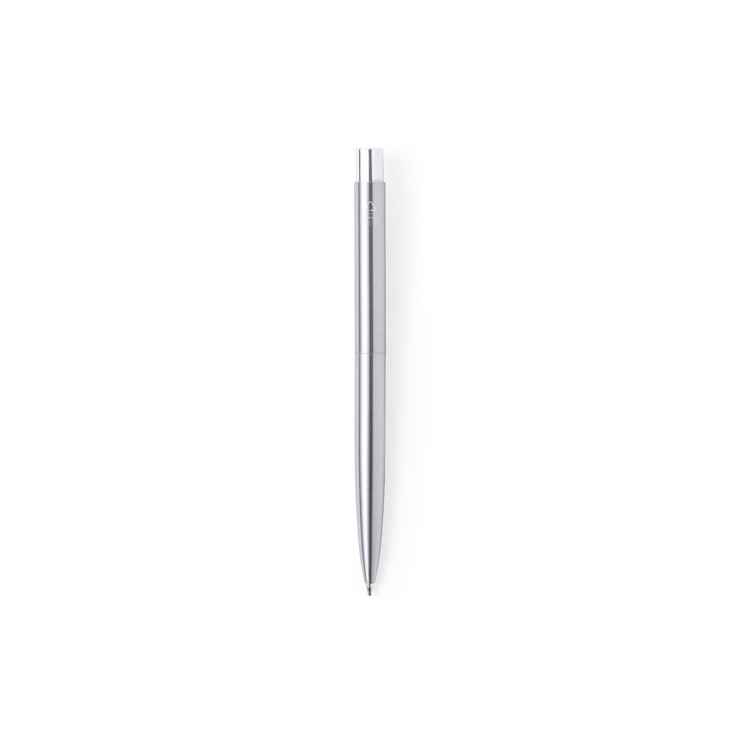 Bolígrafo Wutax eco-friendly de acero inox reciclado. Mecanismo pulsador, cuerpo plateado y accesorios cromados. Presentado en estuche kraft.