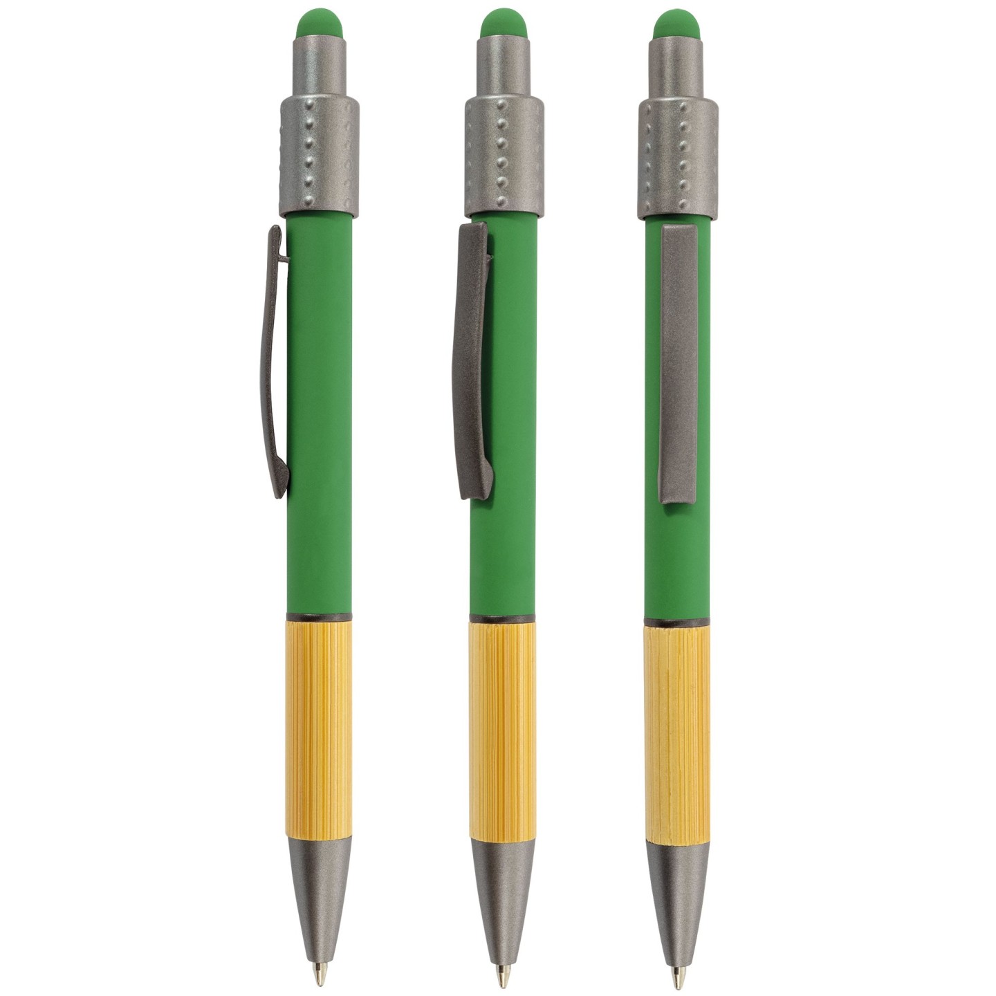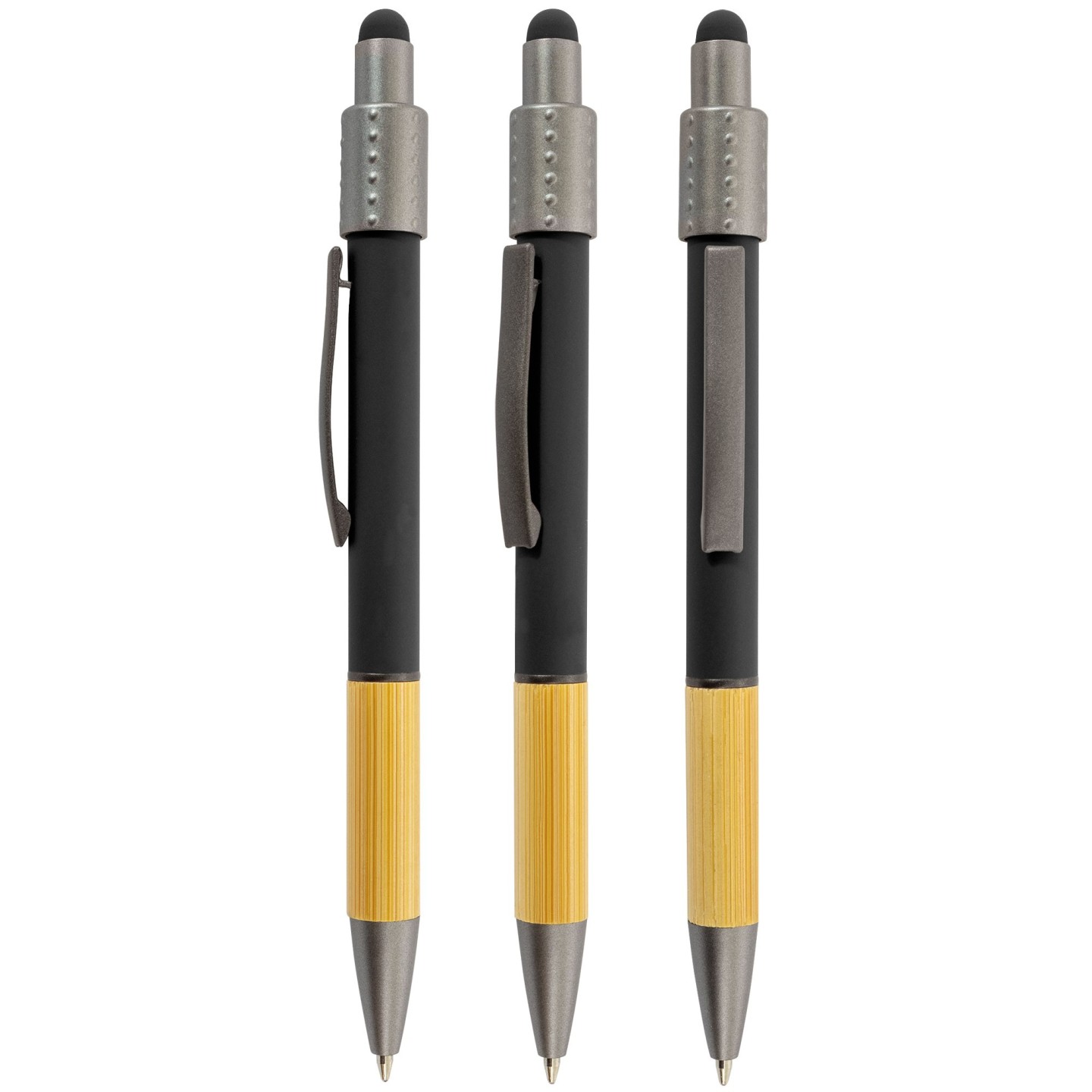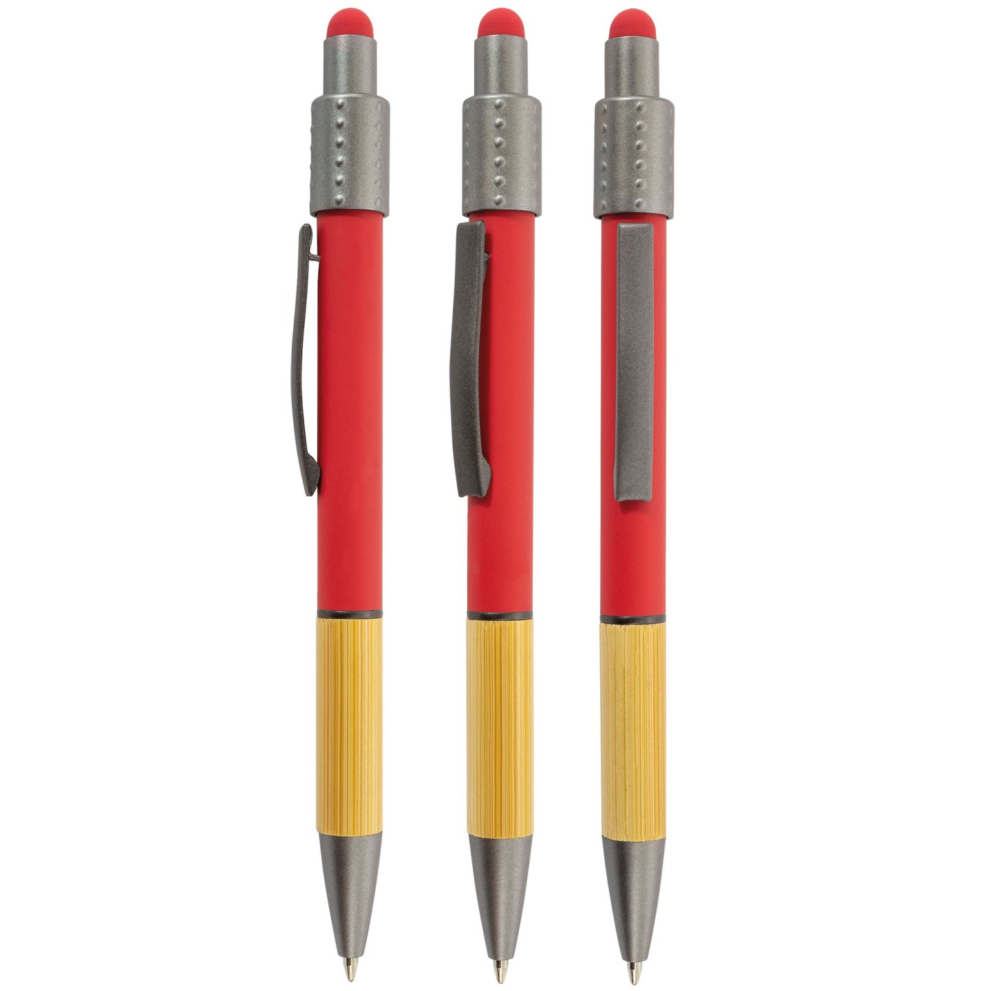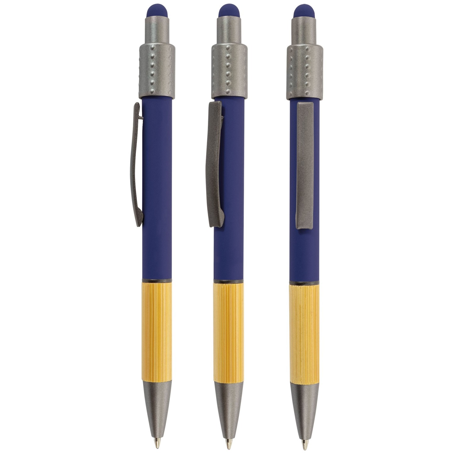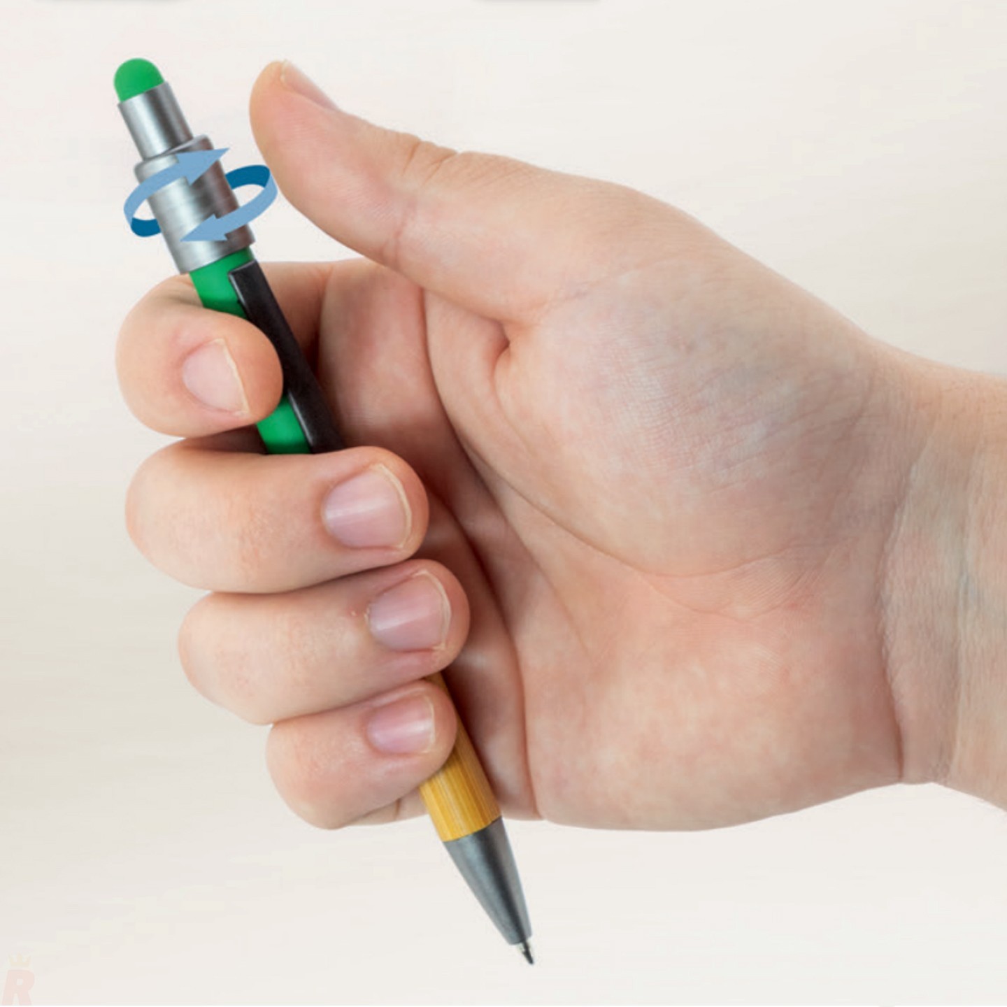 Bolígrafo antiestrés giratorio touch, fabricado en bambú y metal. Tinta azul y goma en la parte posterior. Personalizable tu logotipo. Medidas: 14.5 cm.
