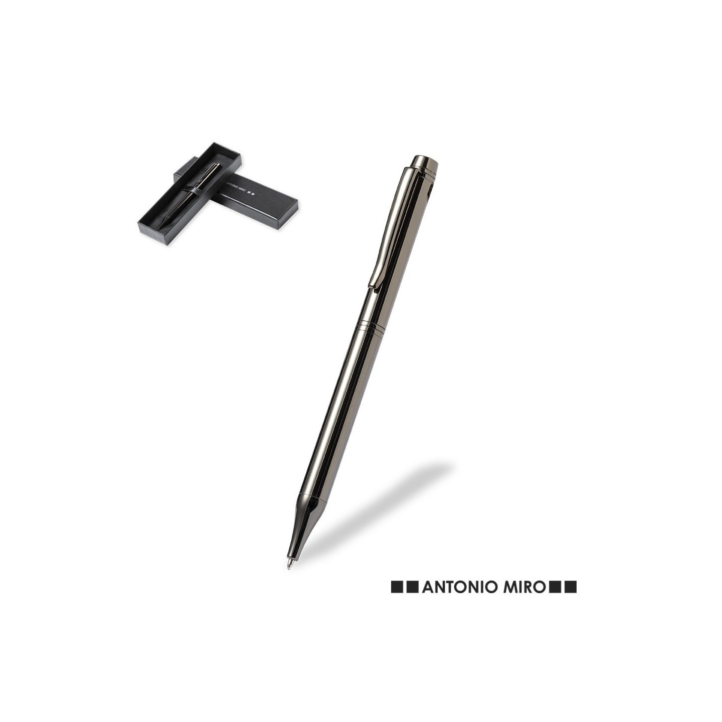 Bolígrafo de Antonio Miró fabricado en metal de acabado brillante, con logotipo de la marca en cuerpo y disponible en variada gama de colores. Con mecanismo giratorio y en tinta azul. Presentado en elegante y resistente caja individual negra con logotipo Antonio Miró y funda a juego.
