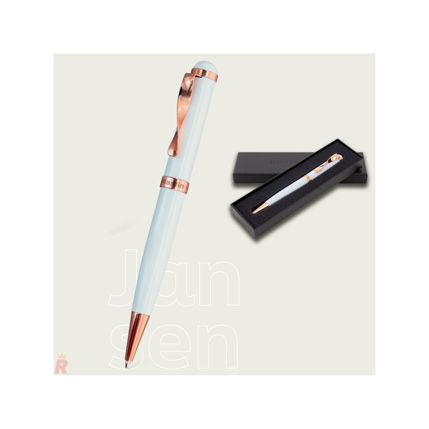 Bolígrafo Pierre Cardín JANSEN, un bolígrafo elegante y sofisticado que destaca por su diseño de cuerpo blanco combinado con detalles en oro rosado, aportando un contraste único y atractivo. Fabricado en metal y acero, este bolígrafo no solo es visualmente impactante, sino que también garantiza una escritura fluida y duradera con tinta azul de alta calidad.