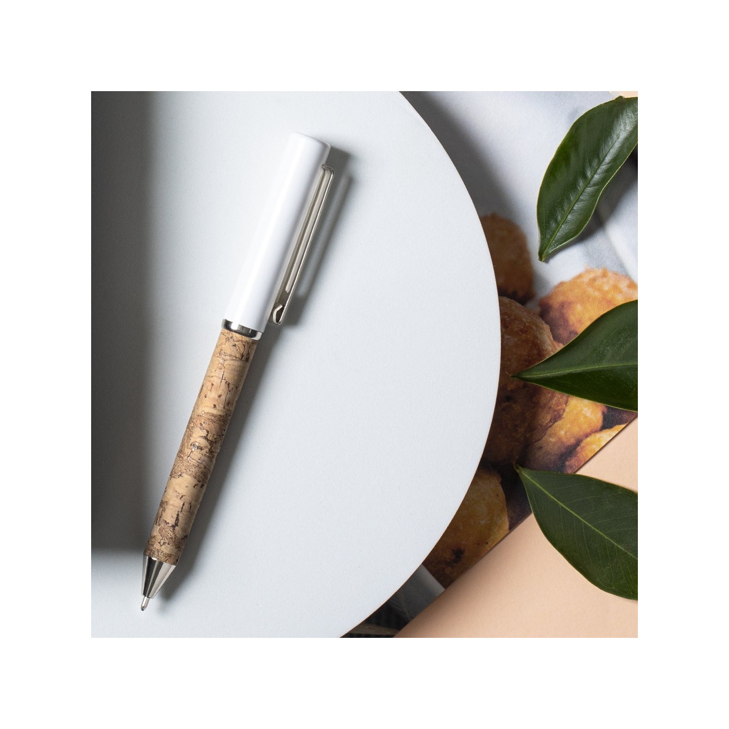El Bolígrafo Siliax mezcla estilo y sostenibilidad en uno a la perfección. Combina corcho natural y metal, clip cromado. Escritura suave en tinta azul. Caja de diseño eco.