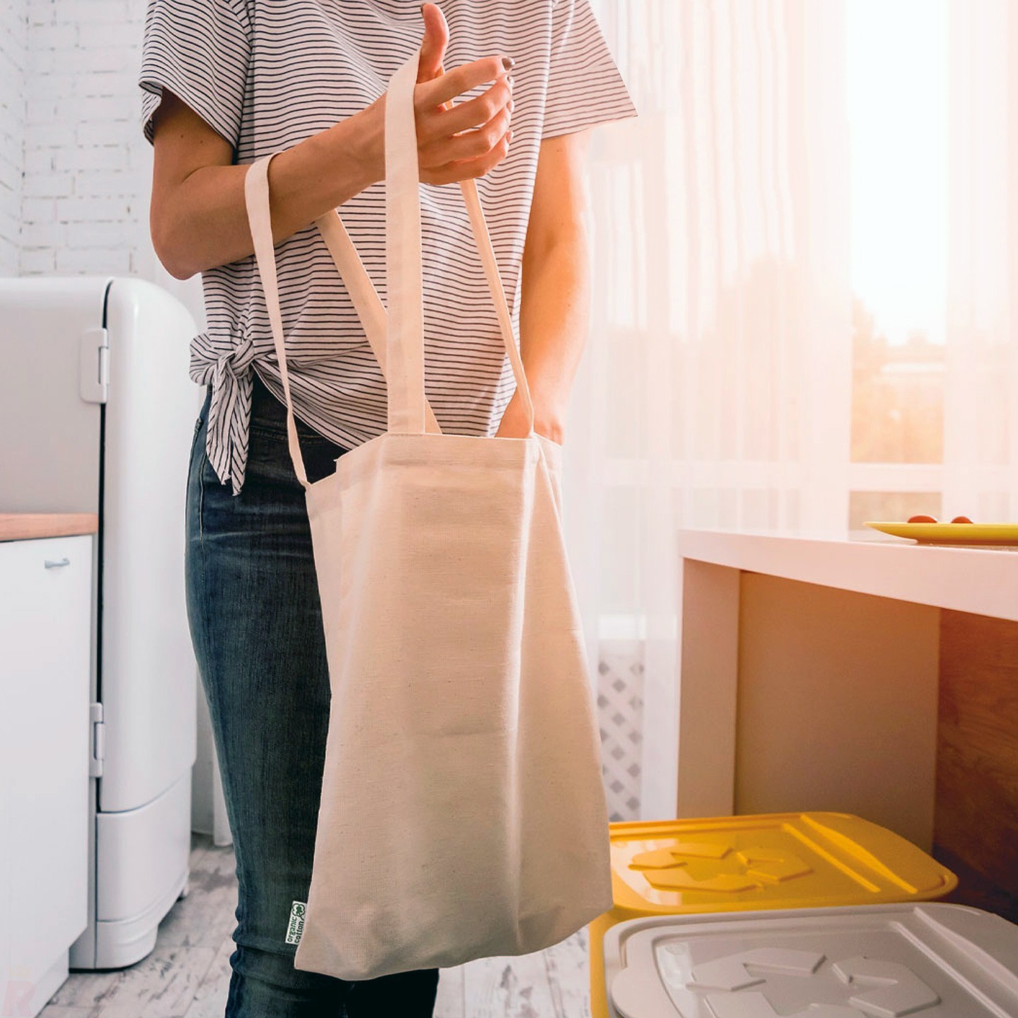 Bolsa ecológica 100% algodón orgánico con asas largas reforzadas. Personalizable con tu logo, perfecta para promover productos sostenibles