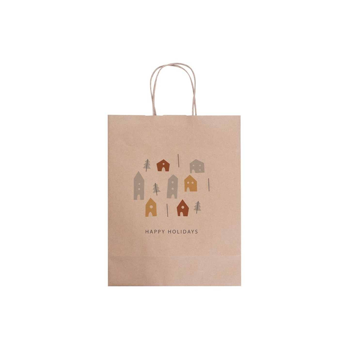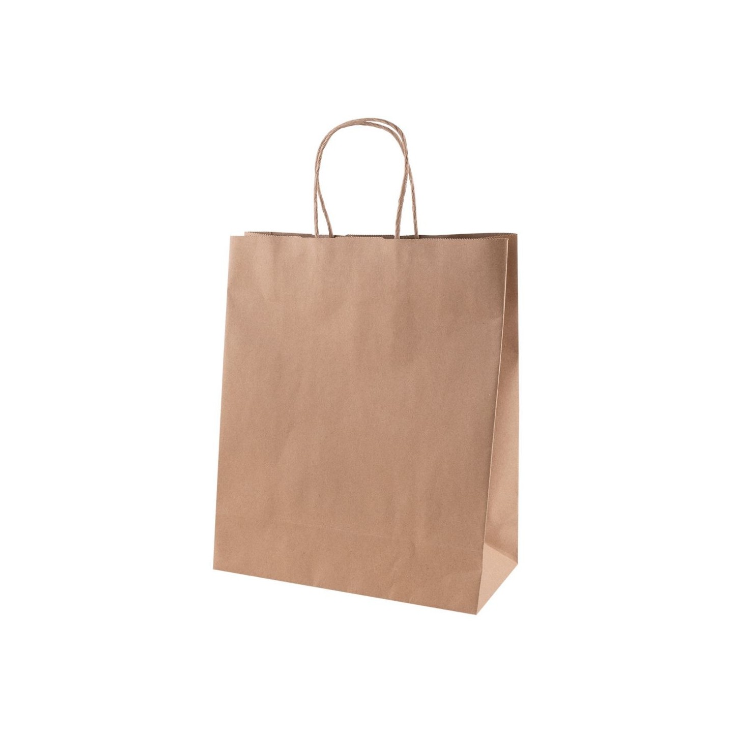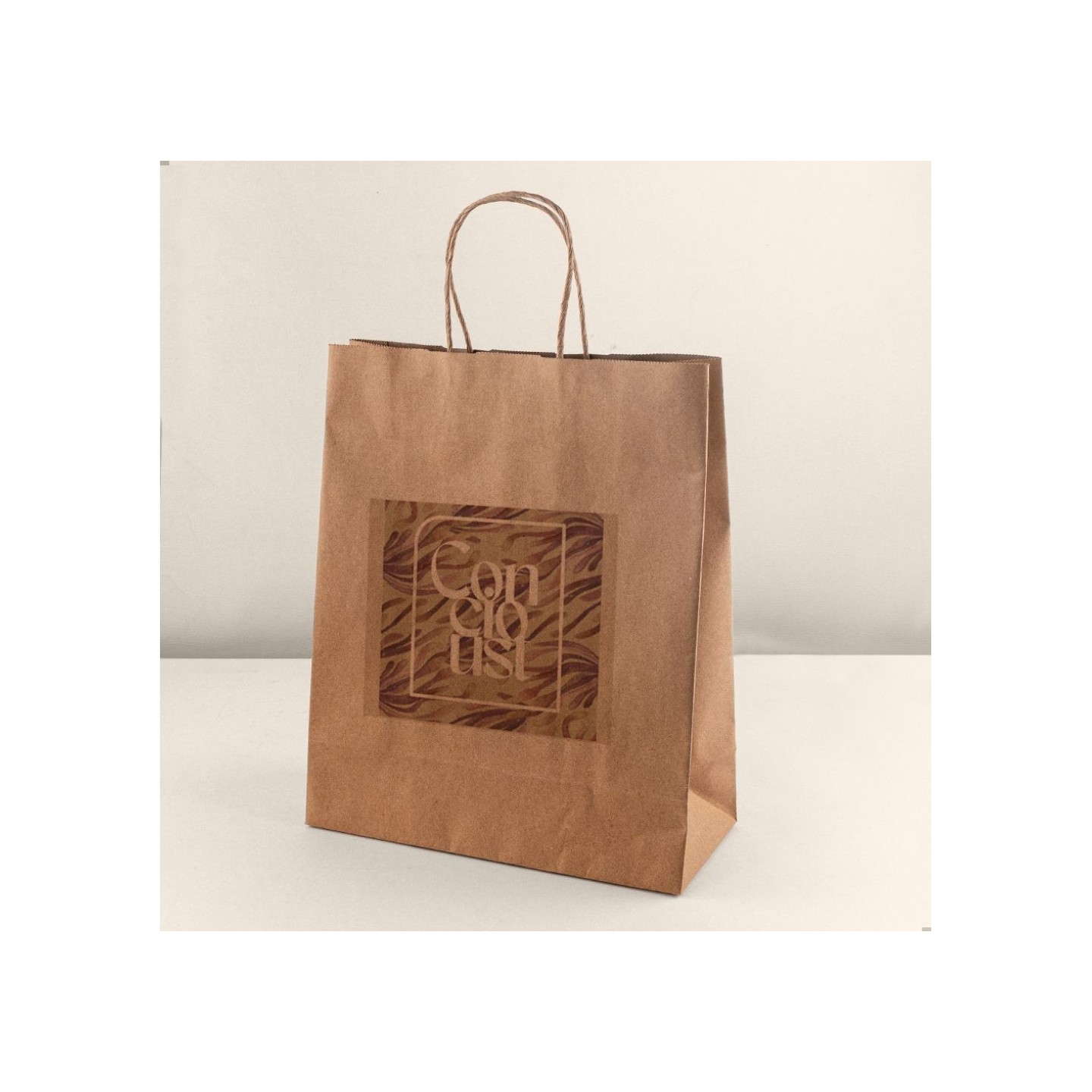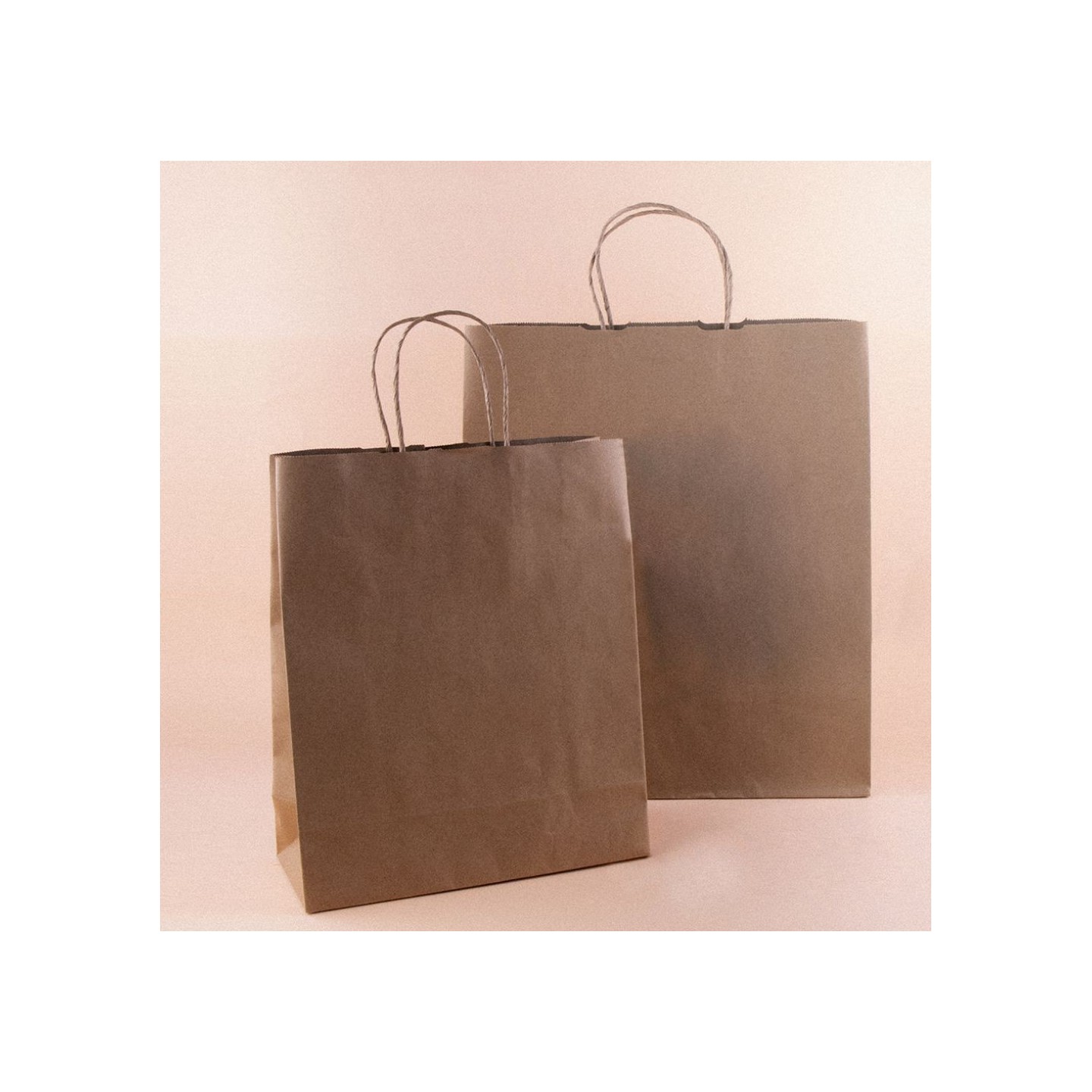 La Bolsa Aysen Pequeña es de papel kraft (120 gr/m²) con asas rizadas (25x11x30 cm) es ideal para regalos corporativos. Certificada FSC, fusiona estilo y sostenibilidad