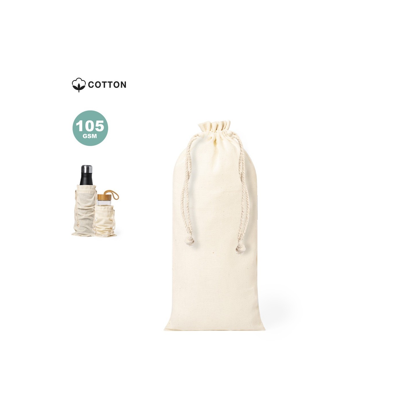 La bolsa de algodón 100% natural es perfecta para empaquetar botellas y termos. Su tamaño y cordones de autocierre la hacen muy práctica. Además, se puede personalizar con tu marca.