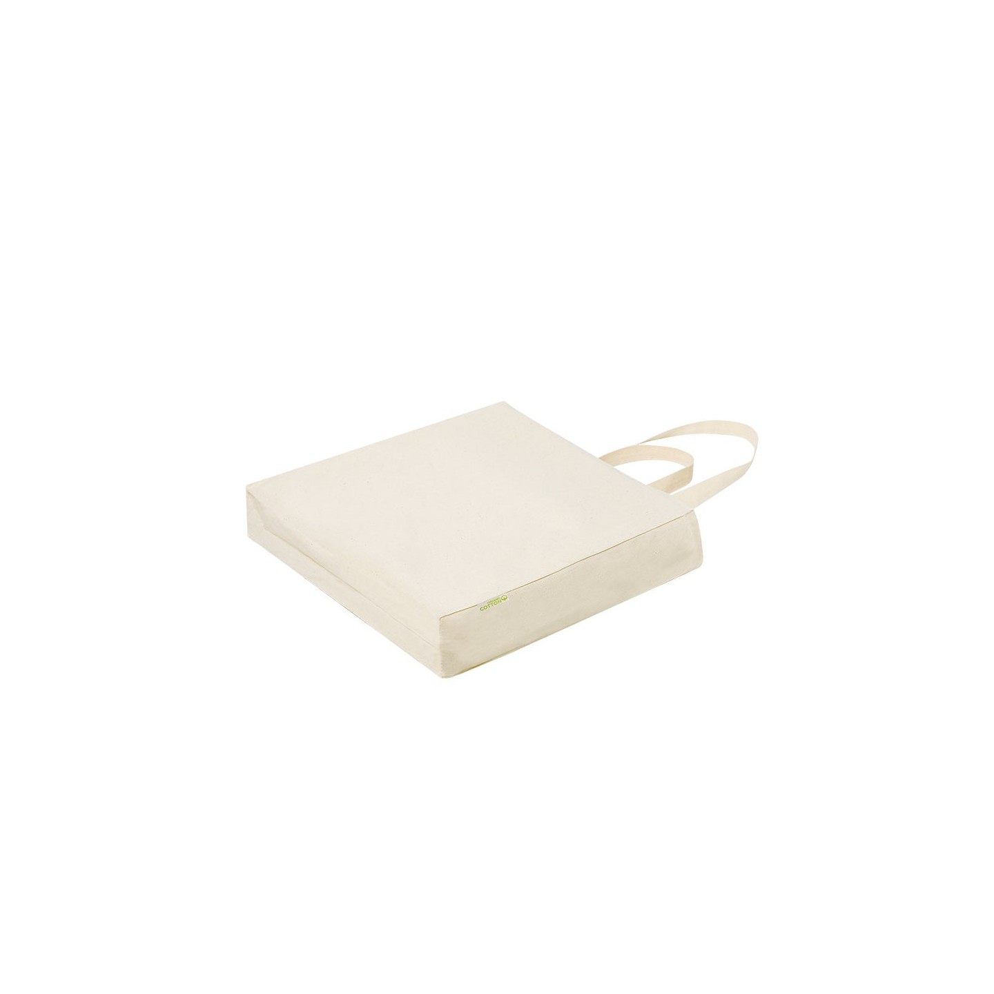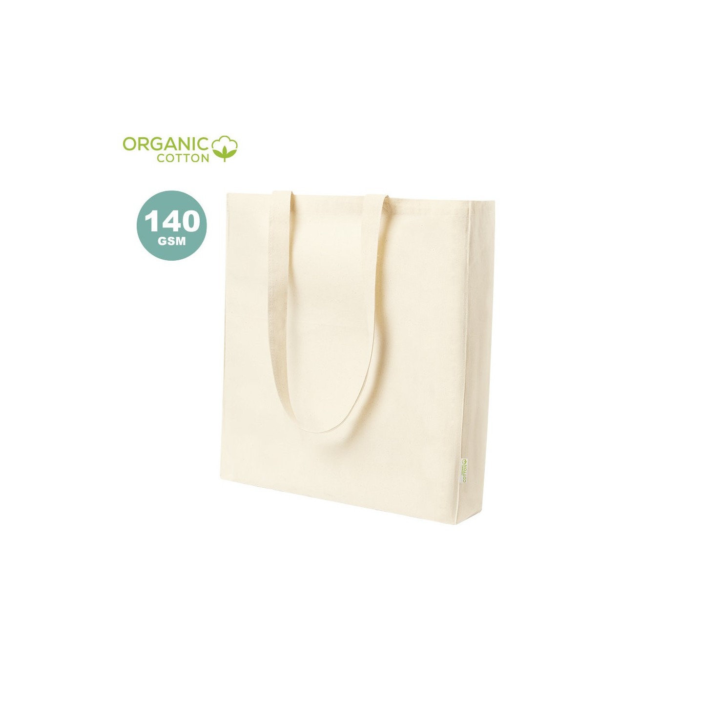 Bolsa Casim de algodón orgánico con asas largas reforzadas y etiqueta distintiva. Resistente hasta 8kg de peso y acabado cosido para mayor durabilidad.
