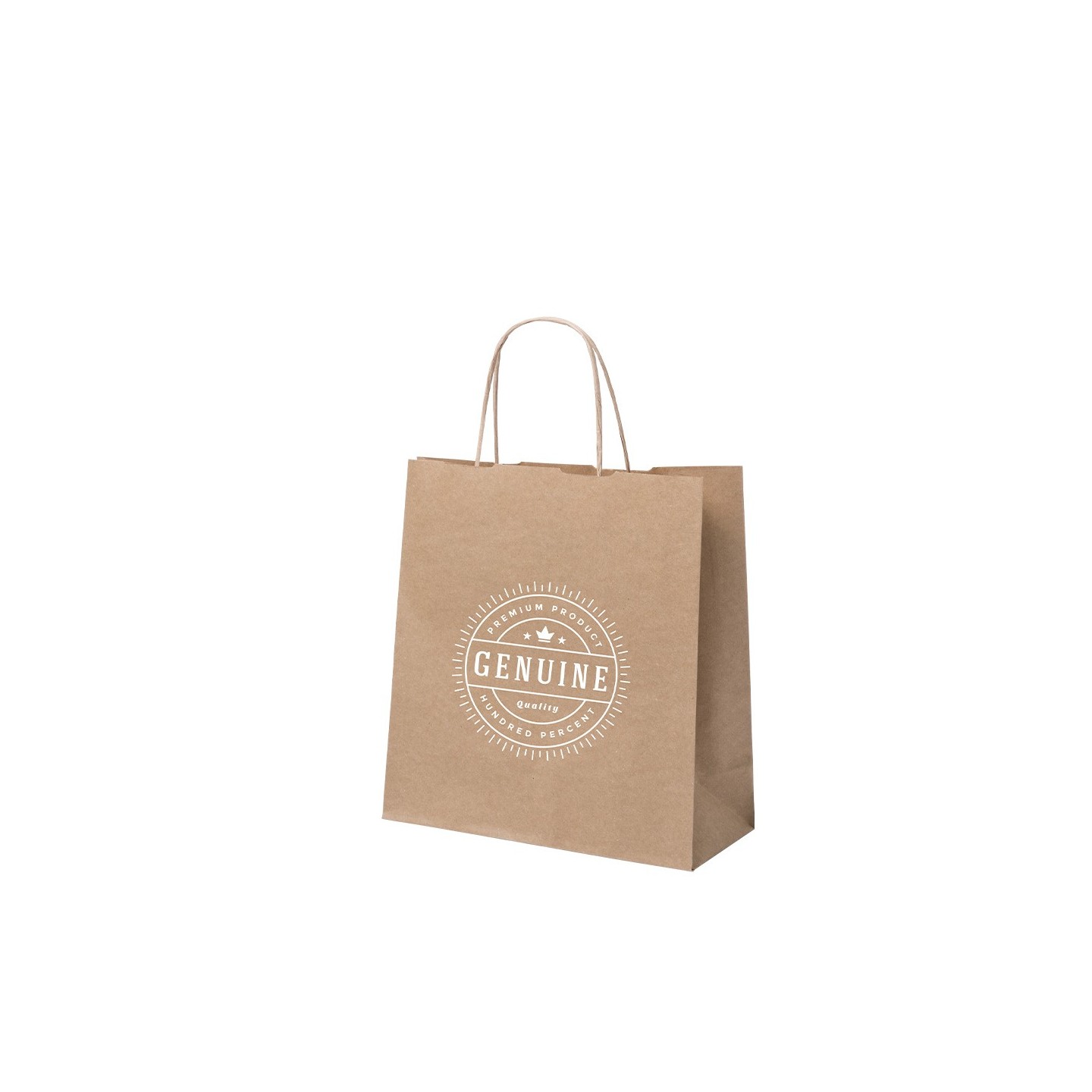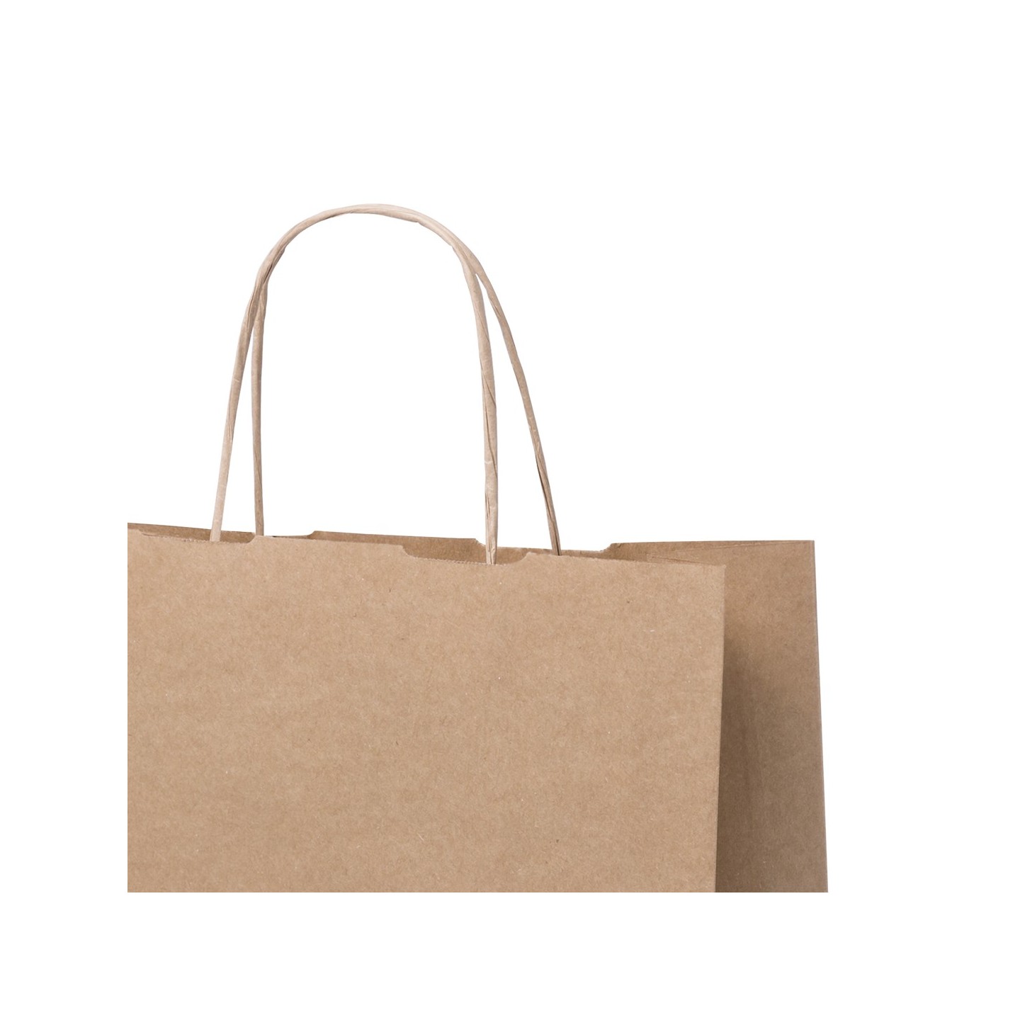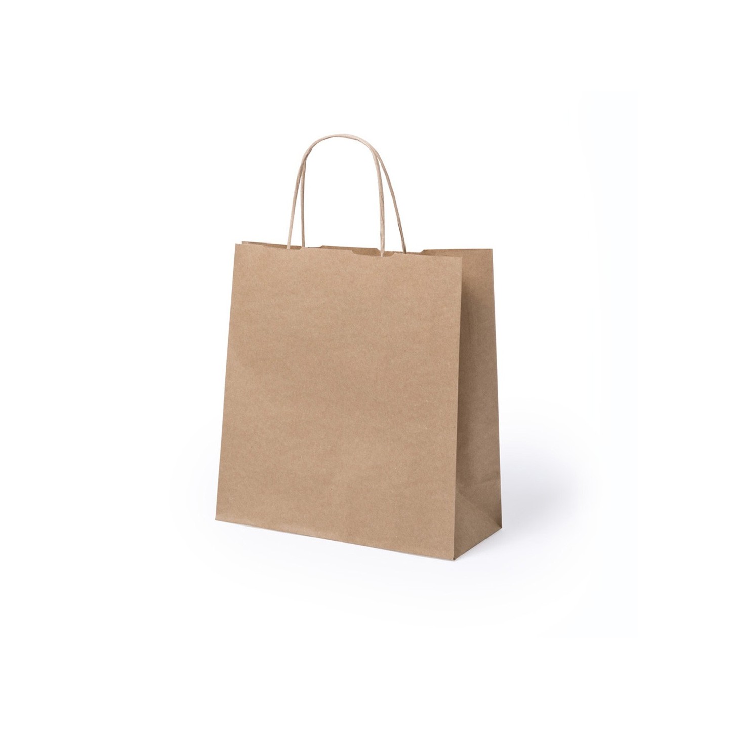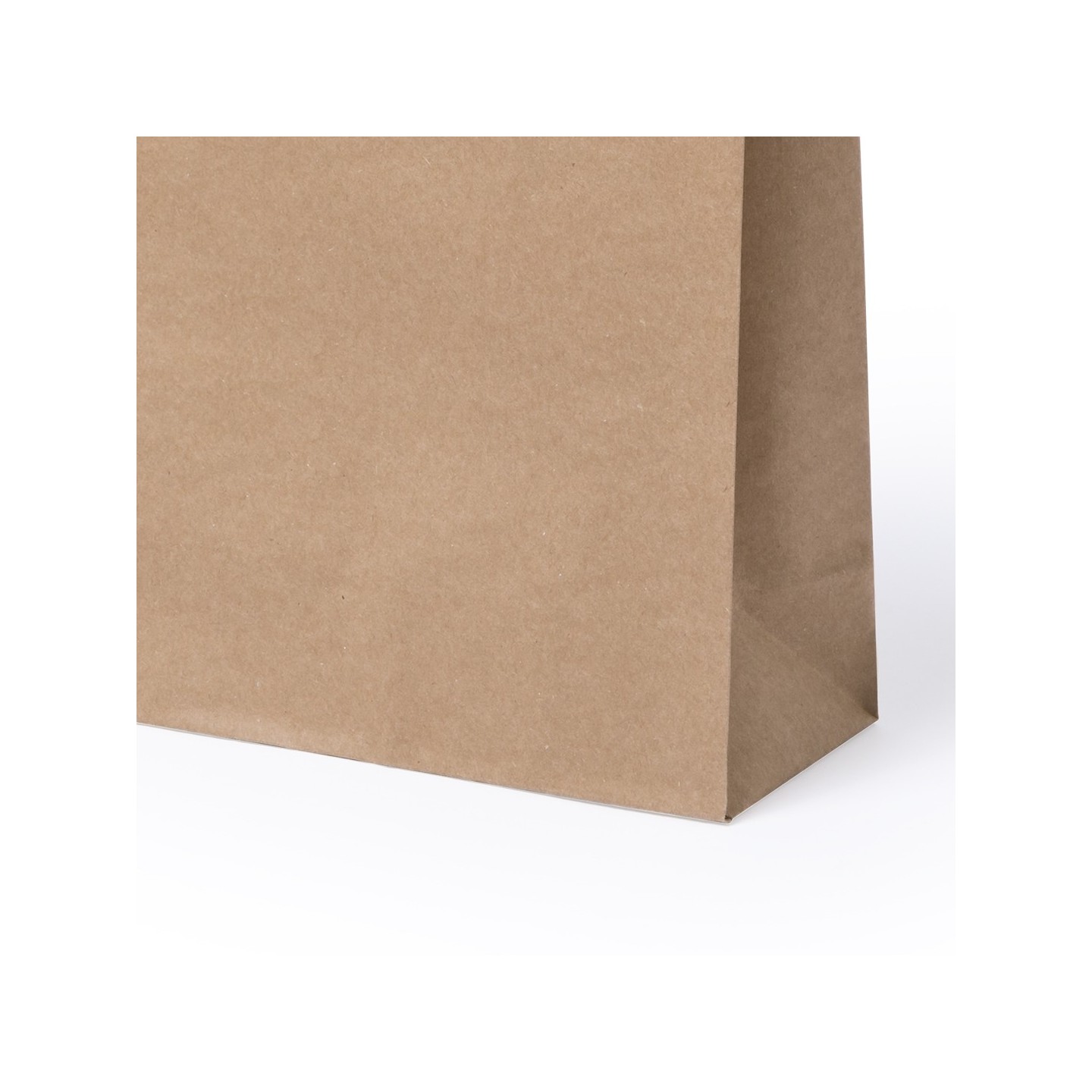 Bolsa en papel resistente de 100g/m2 con asas cortas y fuelle. Soporta hasta 7kg de peso. Diseño natural y ecológico. Perfecta para transportar tus objetos.