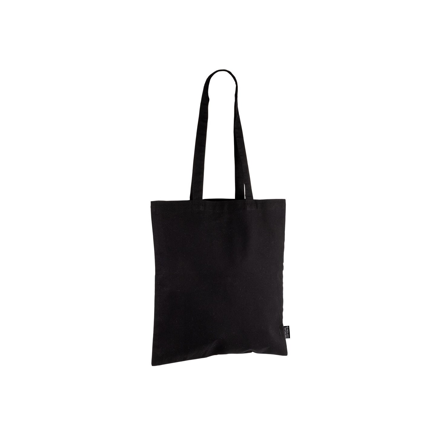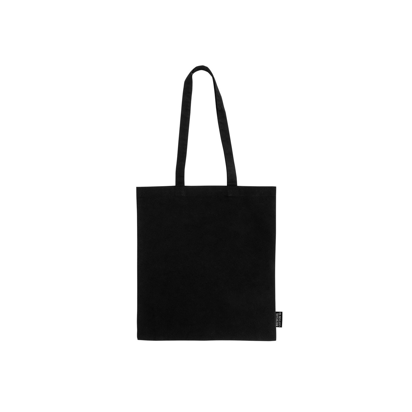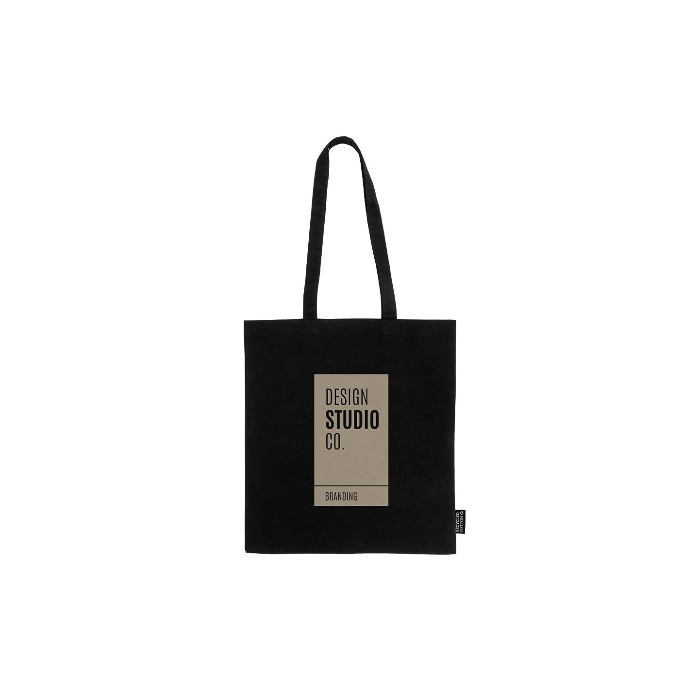 Bolsa ecológica personalizable fabricada en 100% algodón reciclado con asas reforzadas, certificación GRS y diseño negro. Ideal para regalos corporativos.