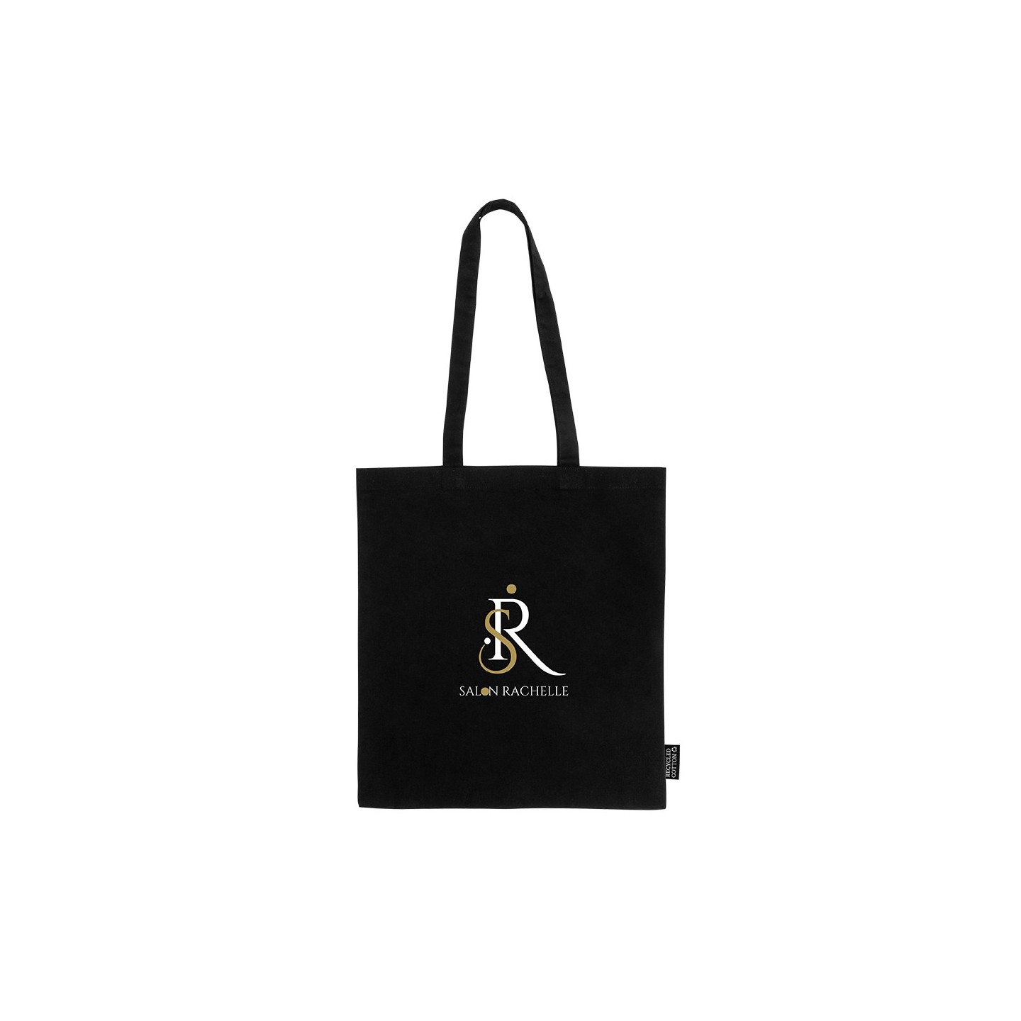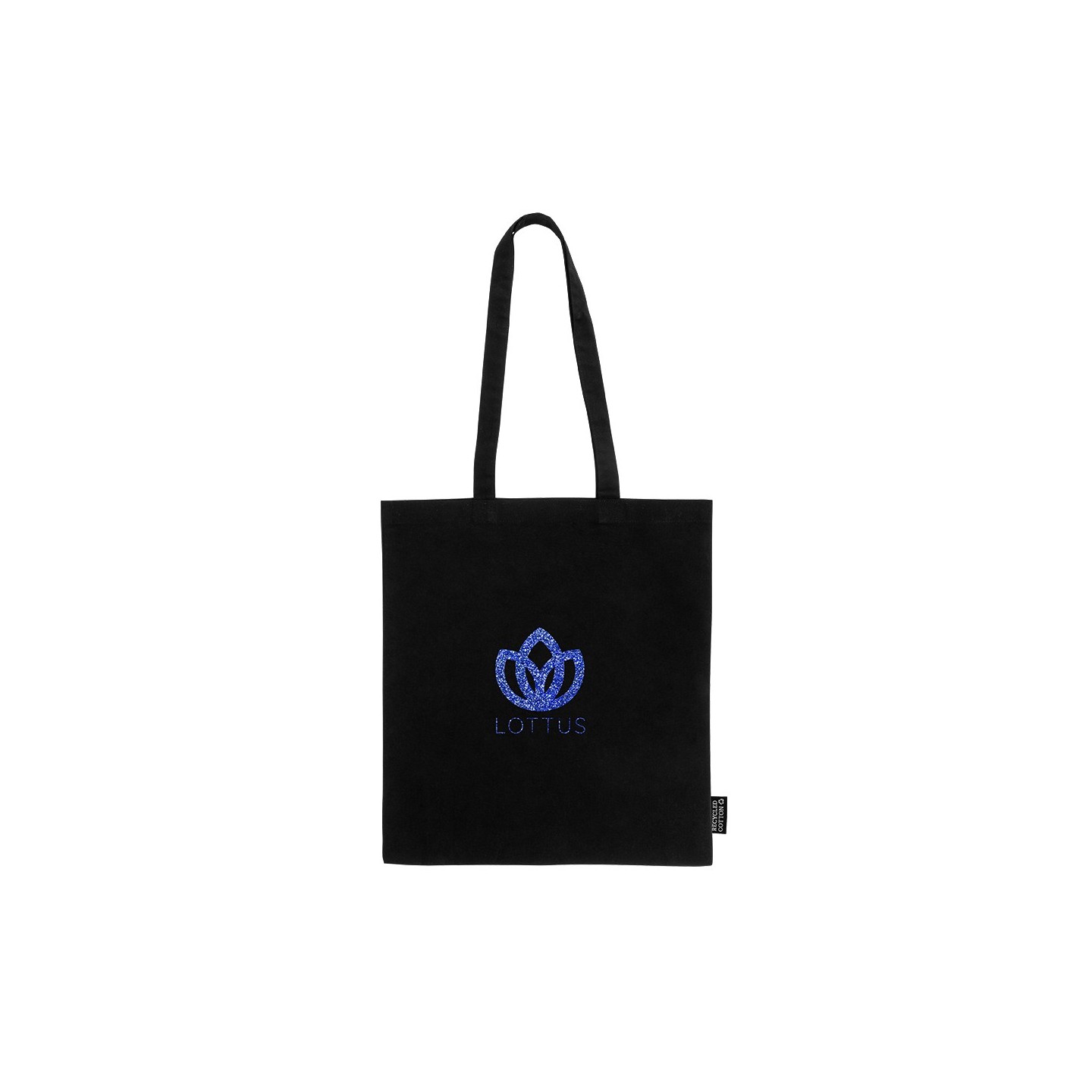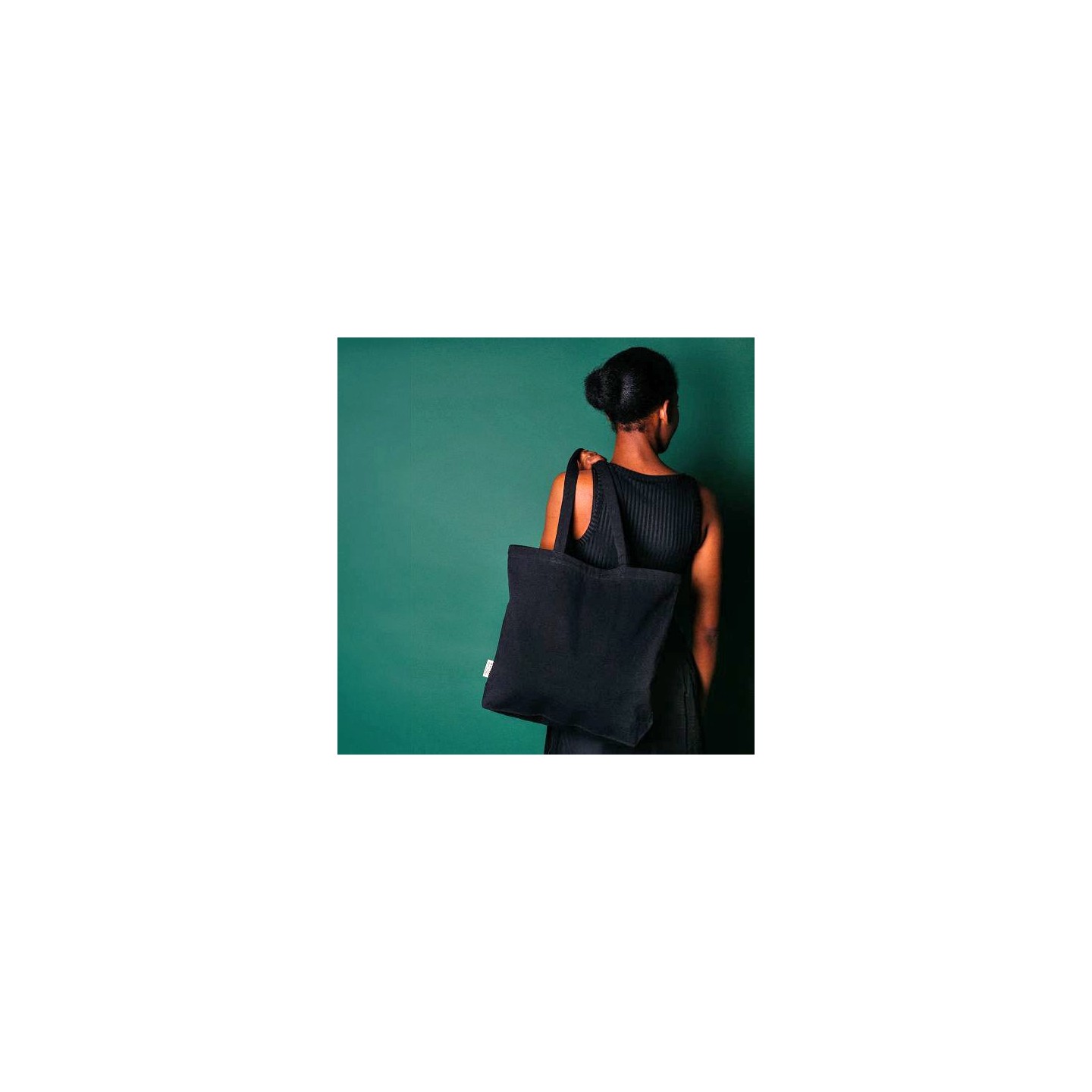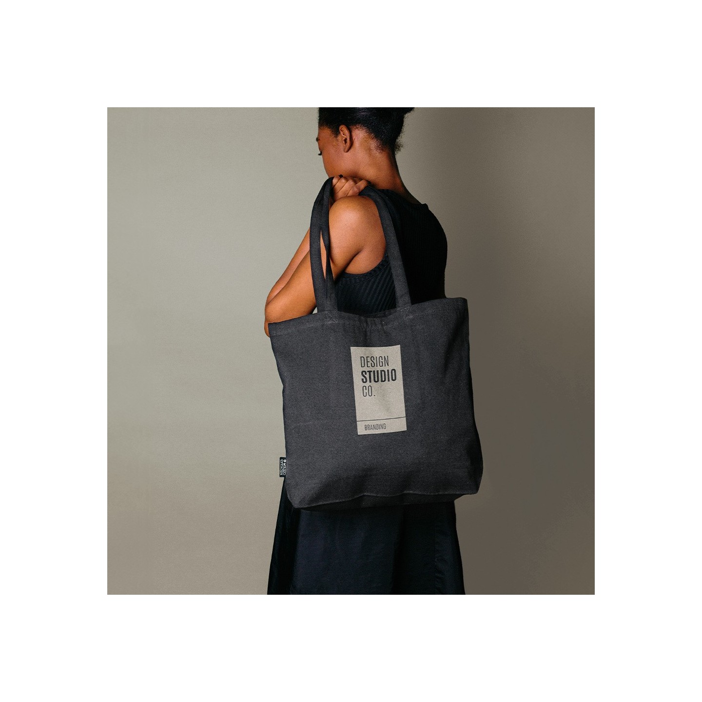 Bolsa ecológica personalizable fabricada en 100% algodón reciclado con asas reforzadas, certificación GRS y diseño negro. Ideal para regalos corporativos.