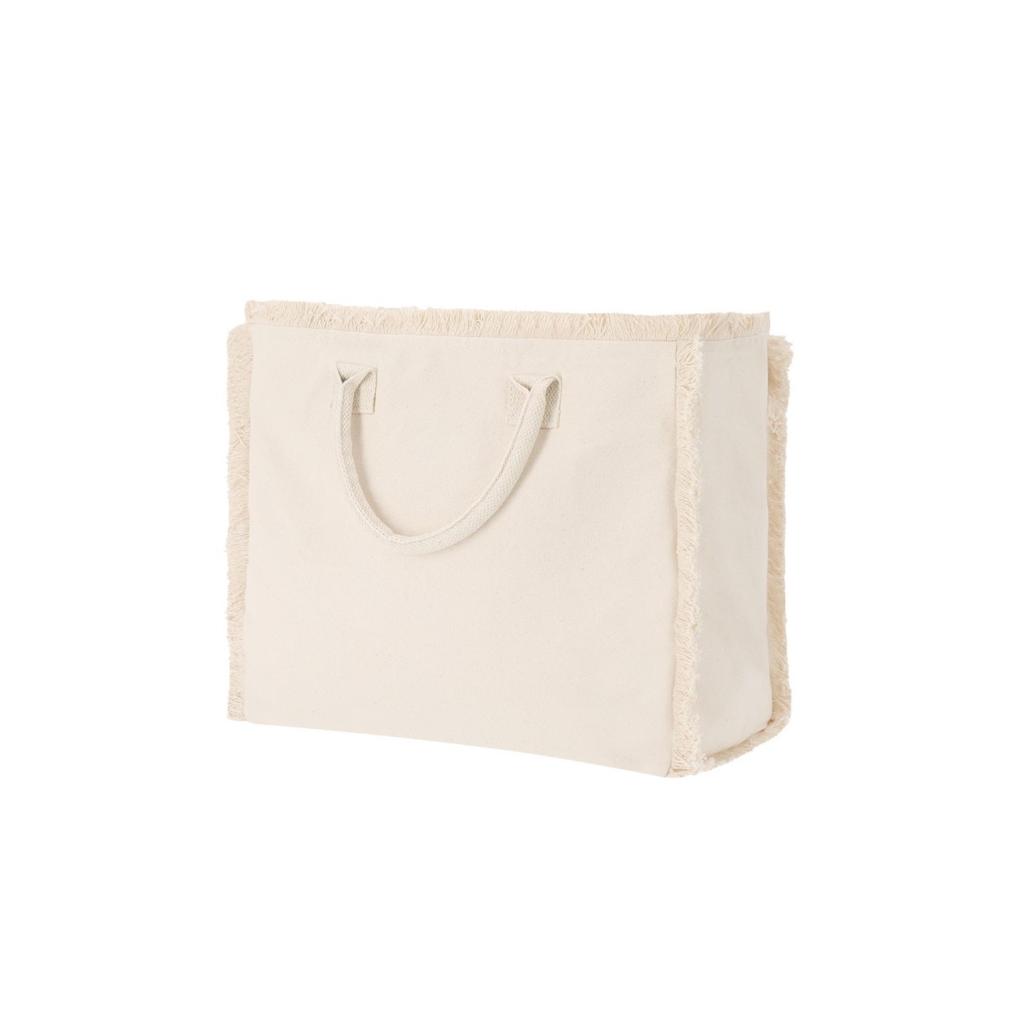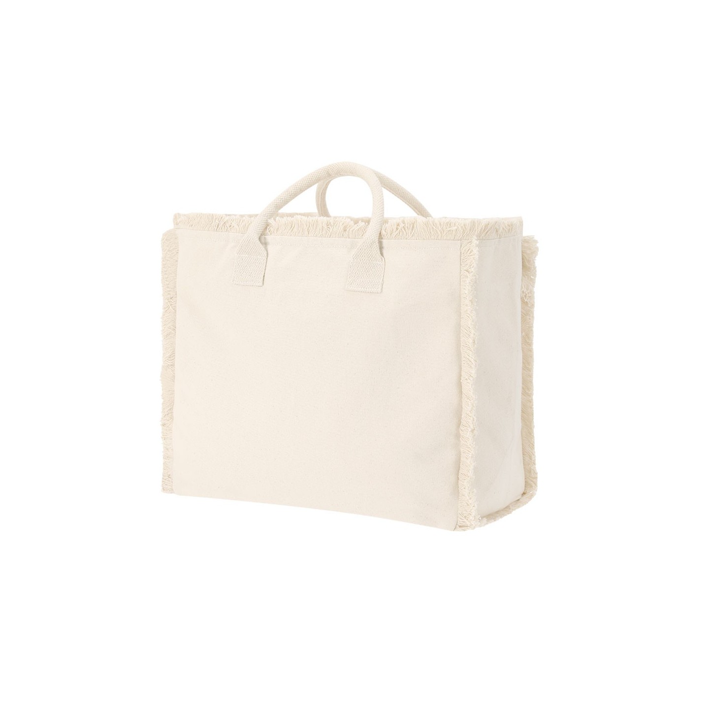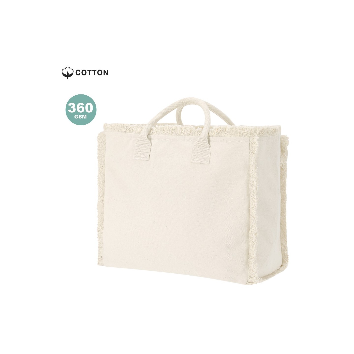 Bolsa DINEBOR de algodón reciclado 360 g/m2, con diseño de flecos, asas cortas reforzadas y cierre con cremallera. Personalizable para tu empresa.