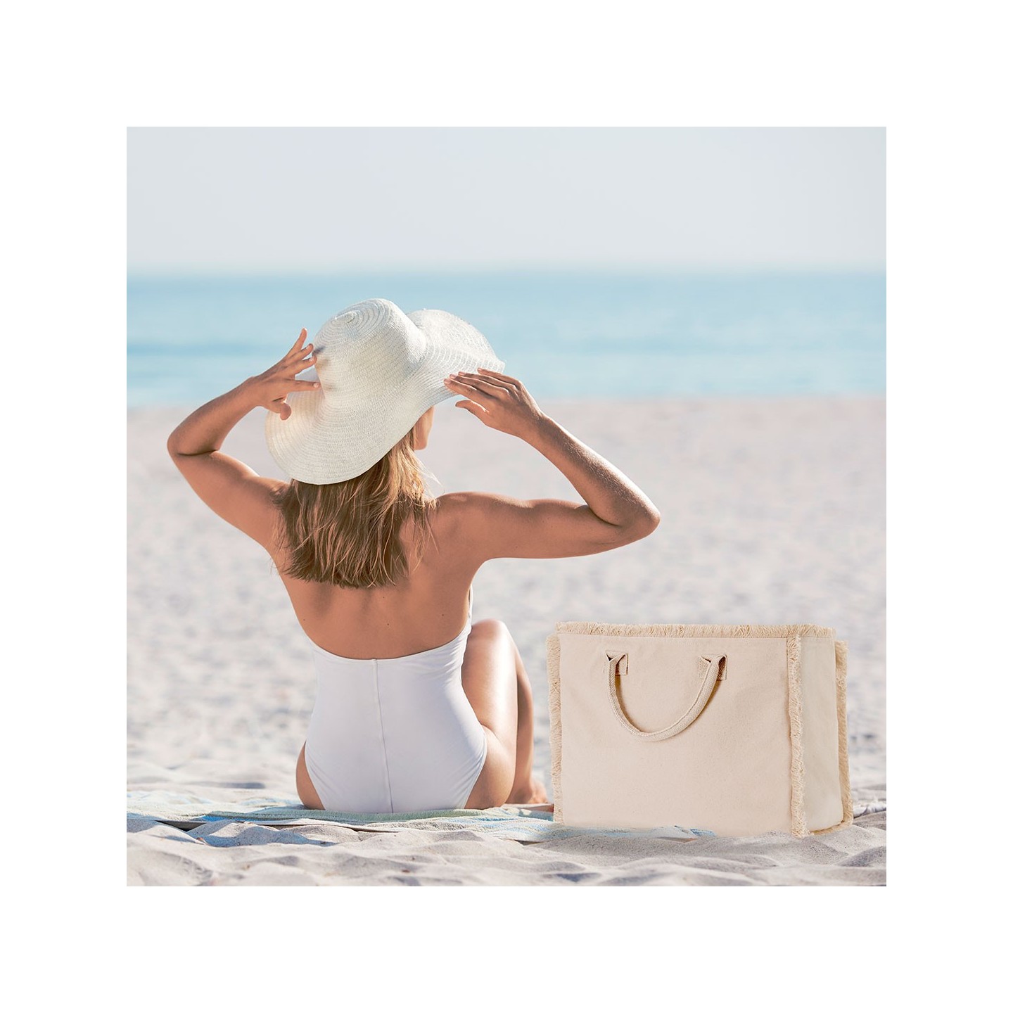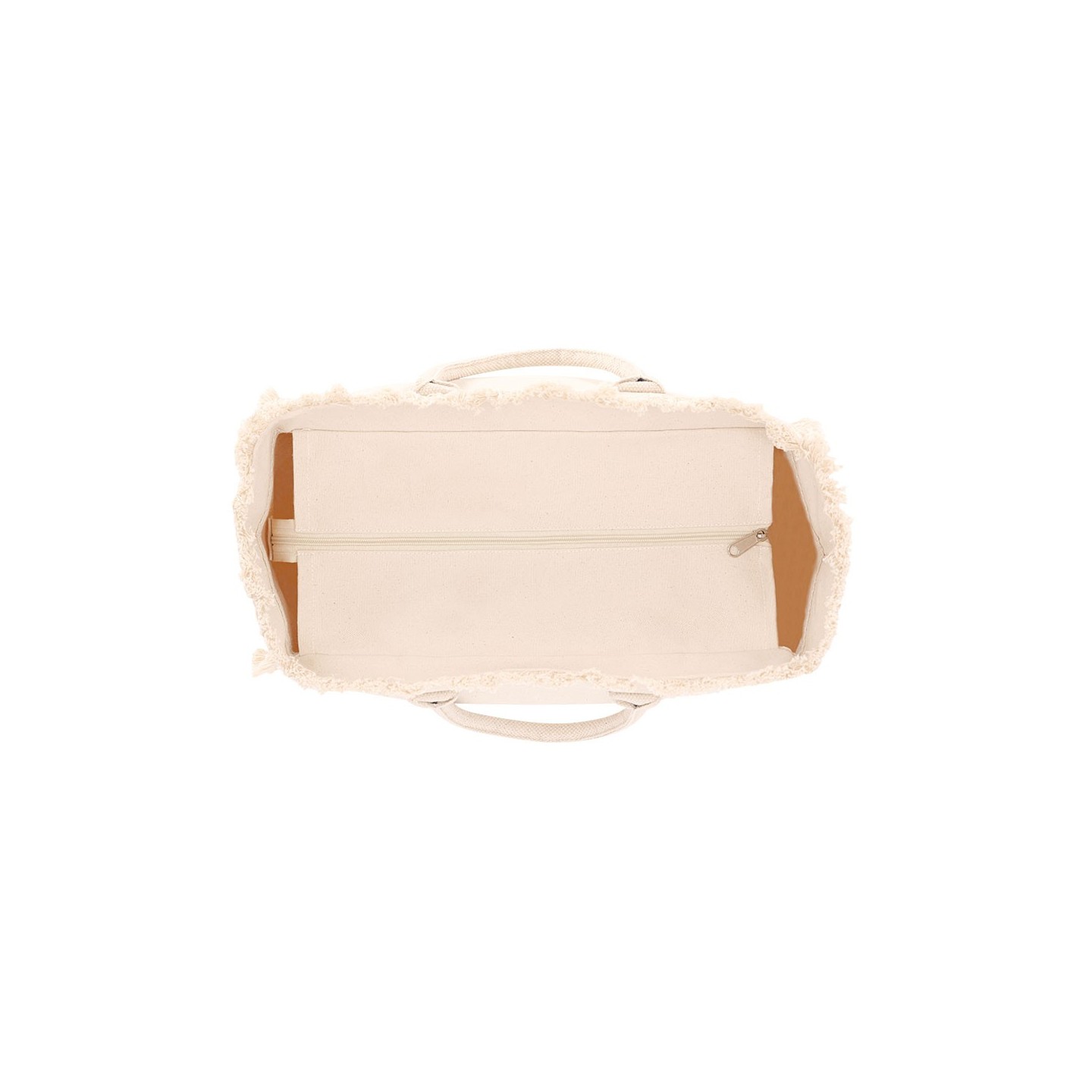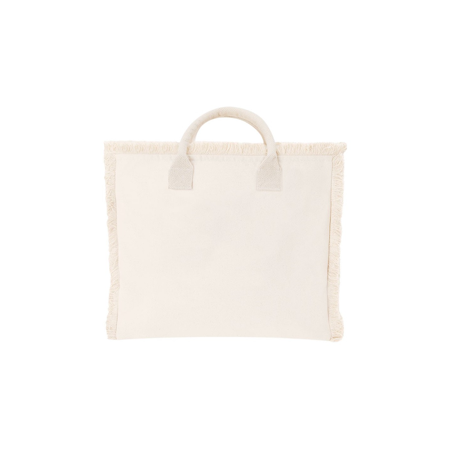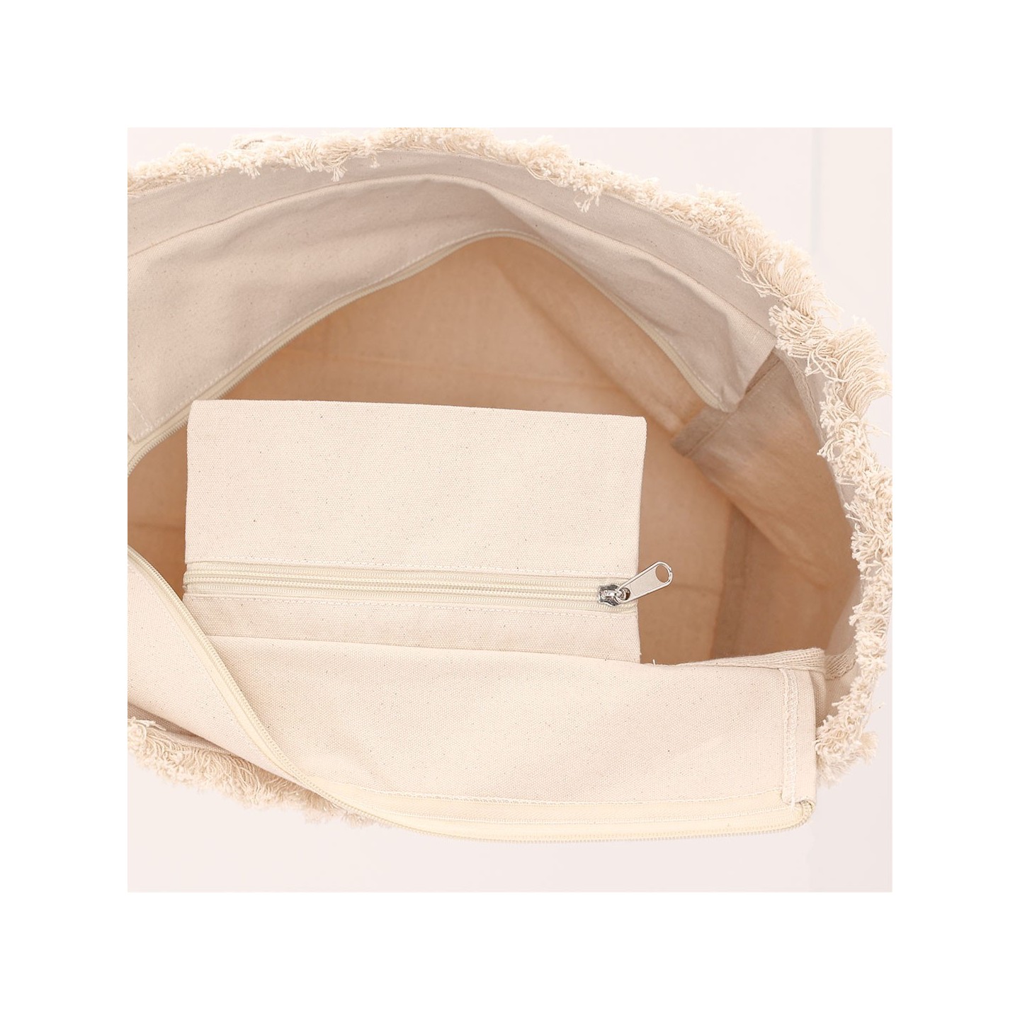 Bolsa DINEBOR de algodón reciclado 360 g/m2, con diseño de flecos, asas cortas reforzadas y cierre con cremallera. Personalizable para tu empresa.