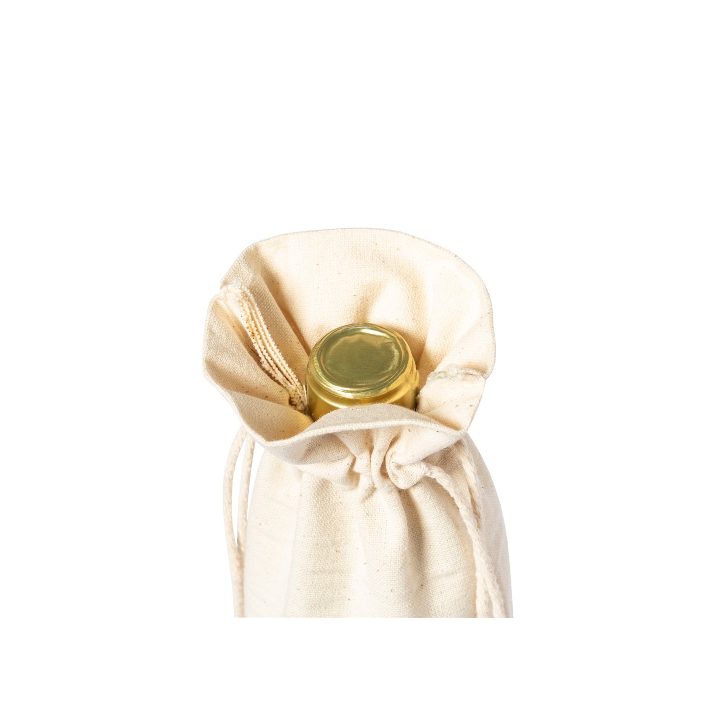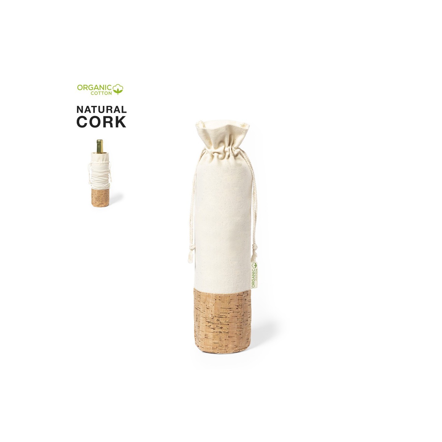 Bolsa para botellas de algodón orgánico con cierre de cordón y base en corcho natural. Ideal para botellas de 750 ml. ¡Cuida del medio ambiente con estilo!