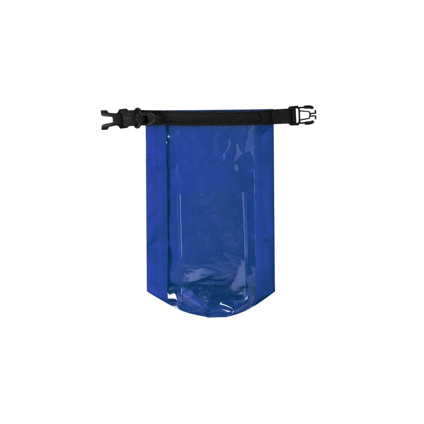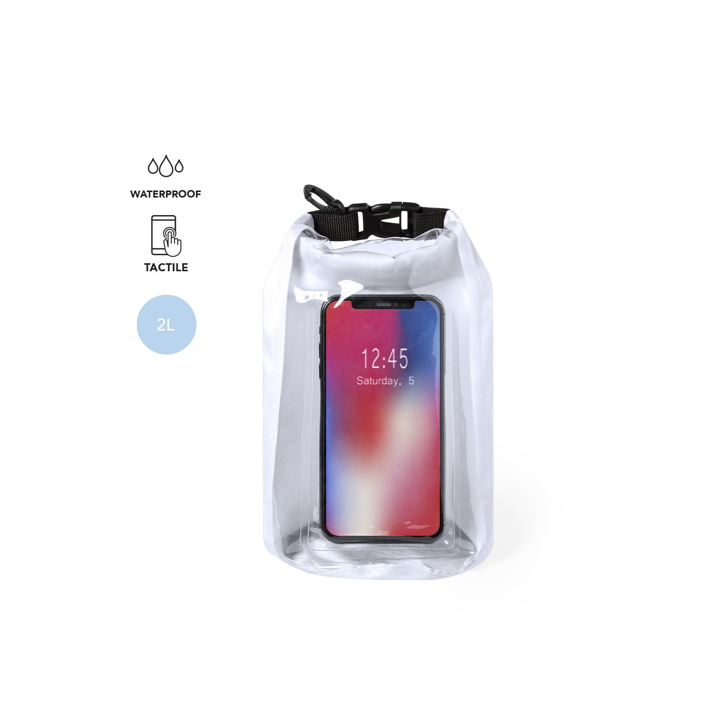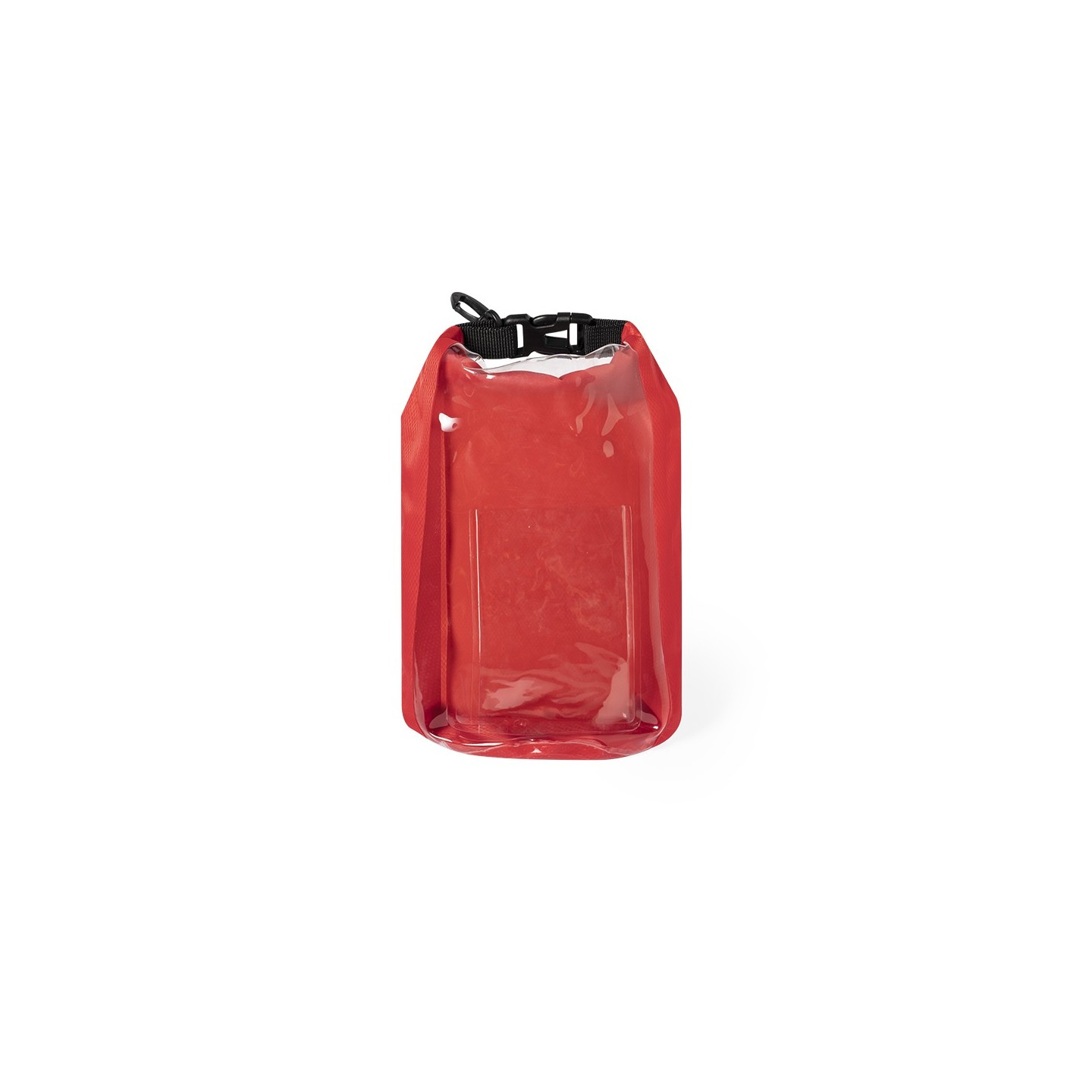 Bolsa impermeable Kambax de 2l de capacidad, con ventana táctil para smartphone y mosquetón para transporte. Disponible en variados colores de acabado brillo.