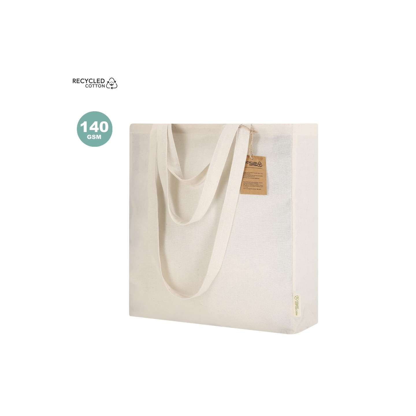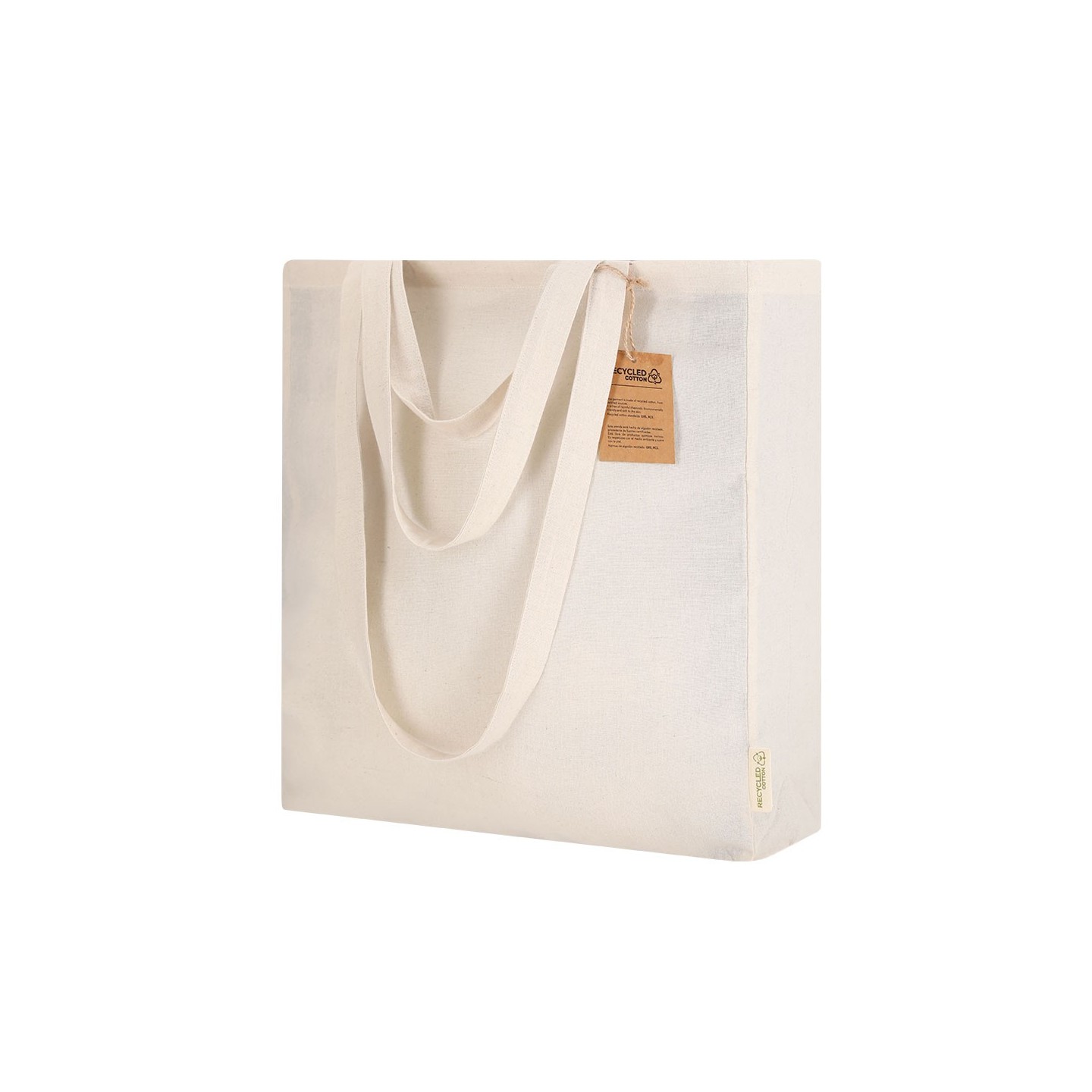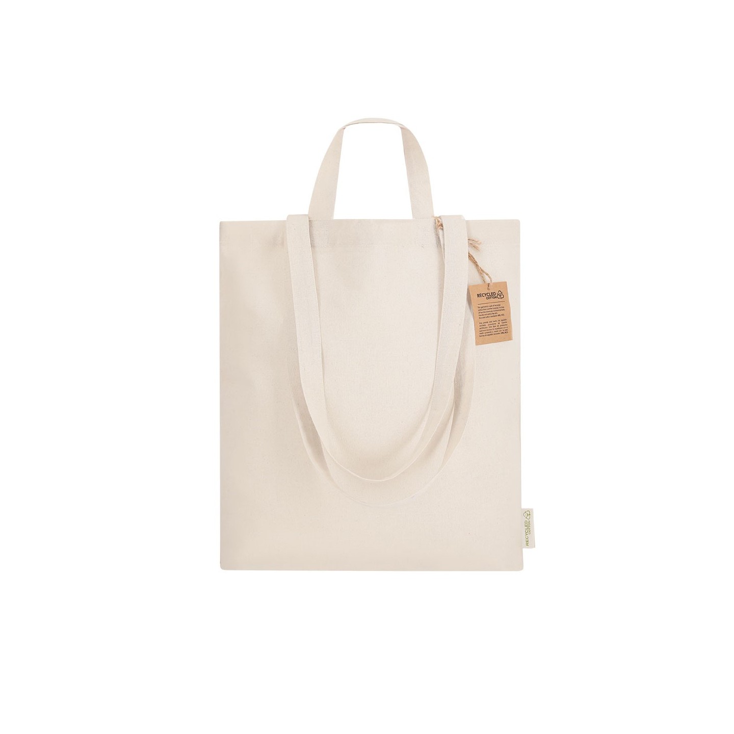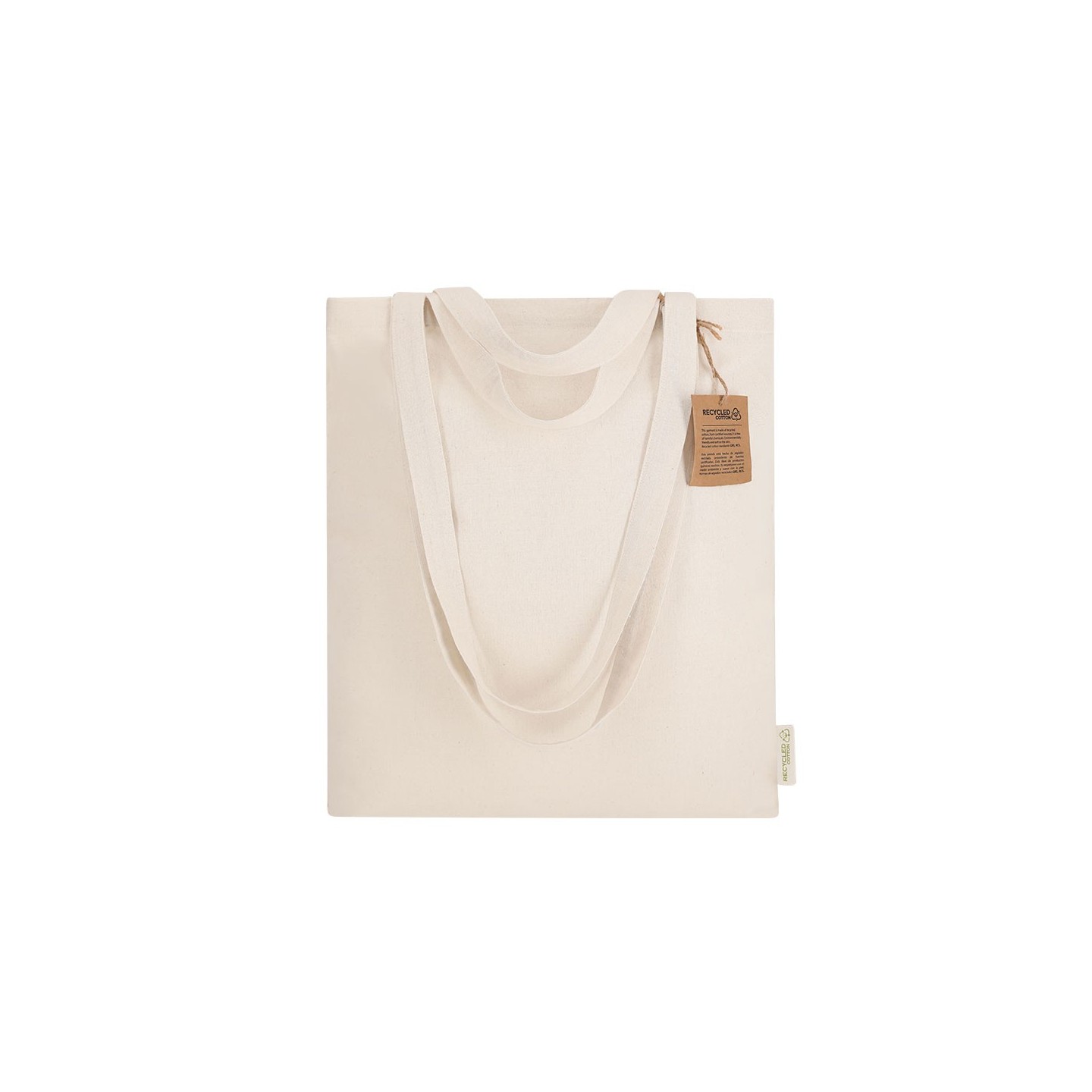 Bolsa ecológica de algodón reciclado con asas largas y cortas. Resistente hasta 6 kg, personalizable con tu logotipo. Perfecta para promociones responsables.