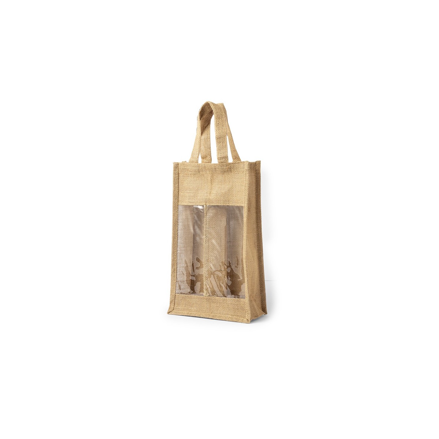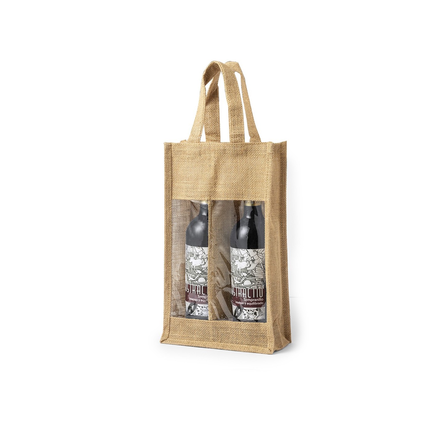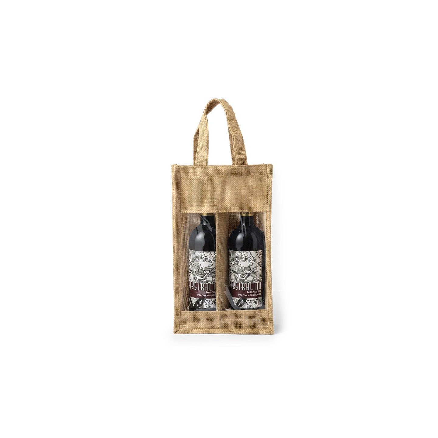 Bolsa Koop, de yute laminado con compartimento para 2 botellas de vino de 75 cl. Con ventana transparente y asas reforzadas, es perfecta para transportar y regalar vino.