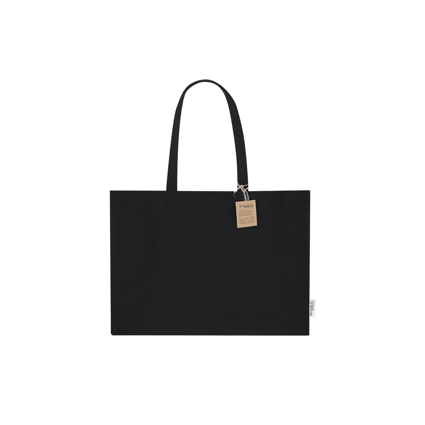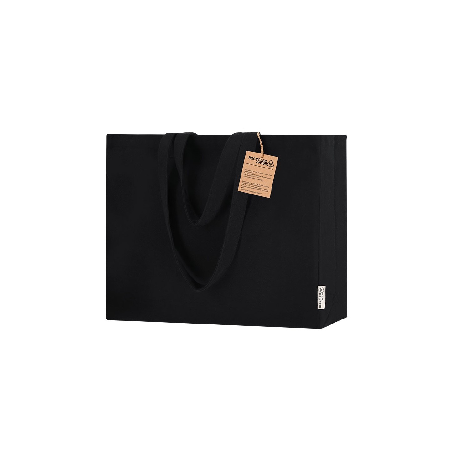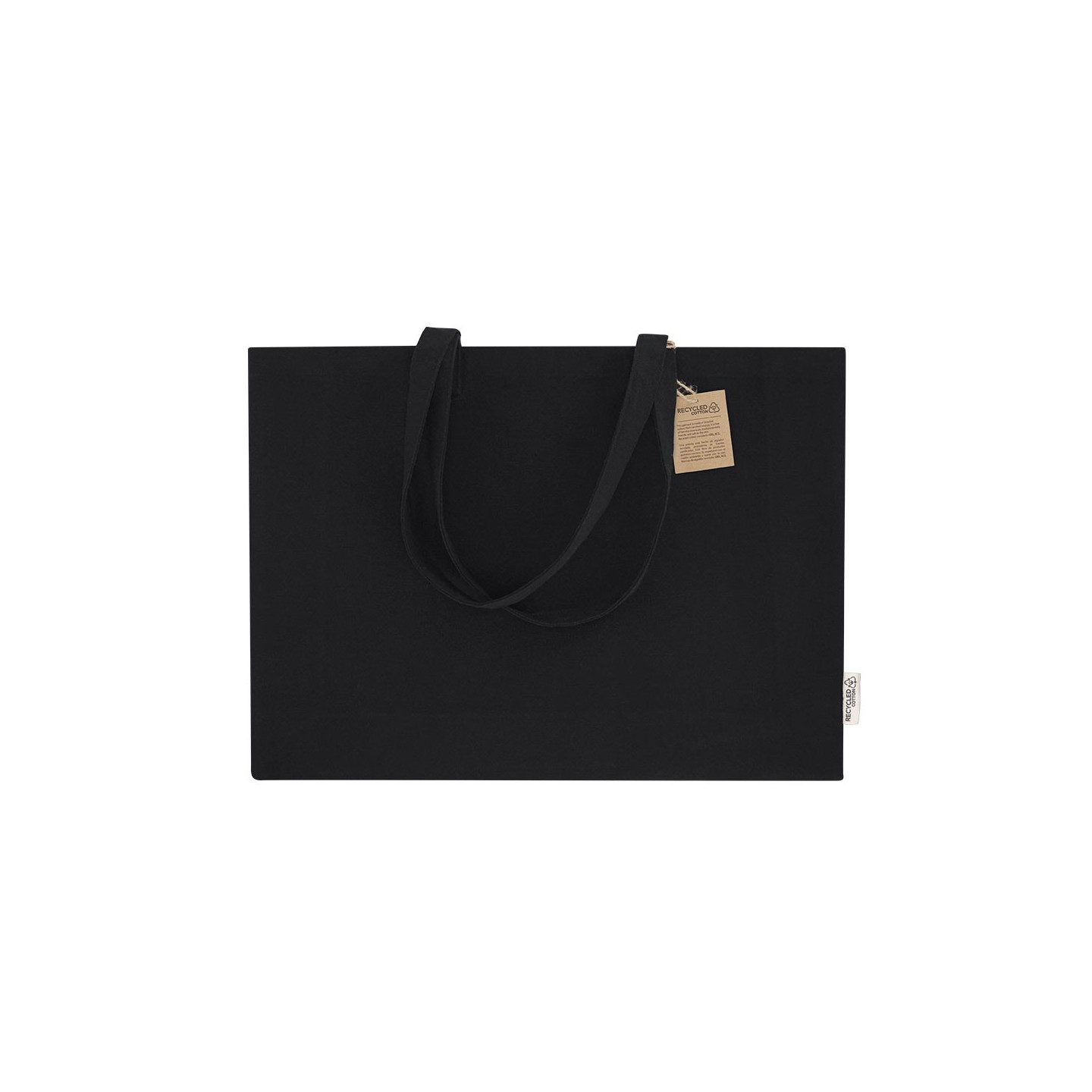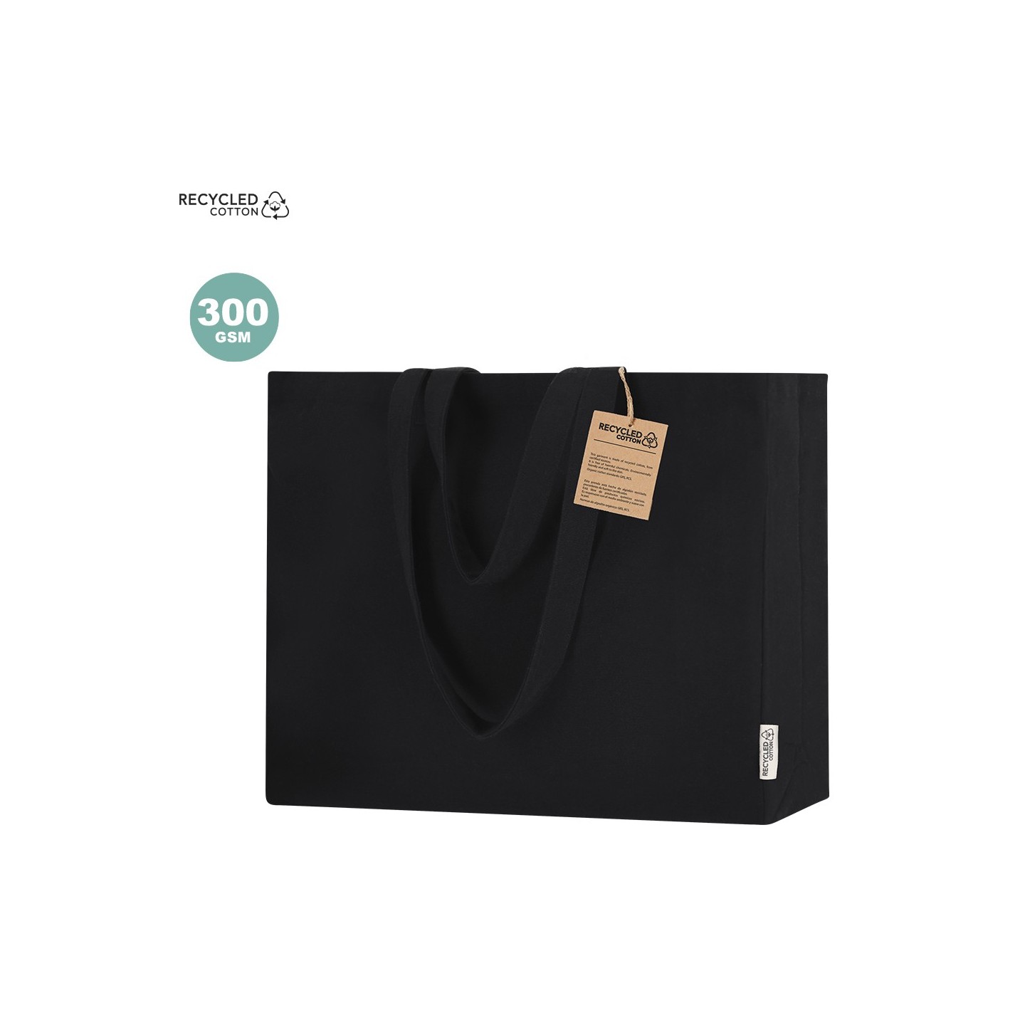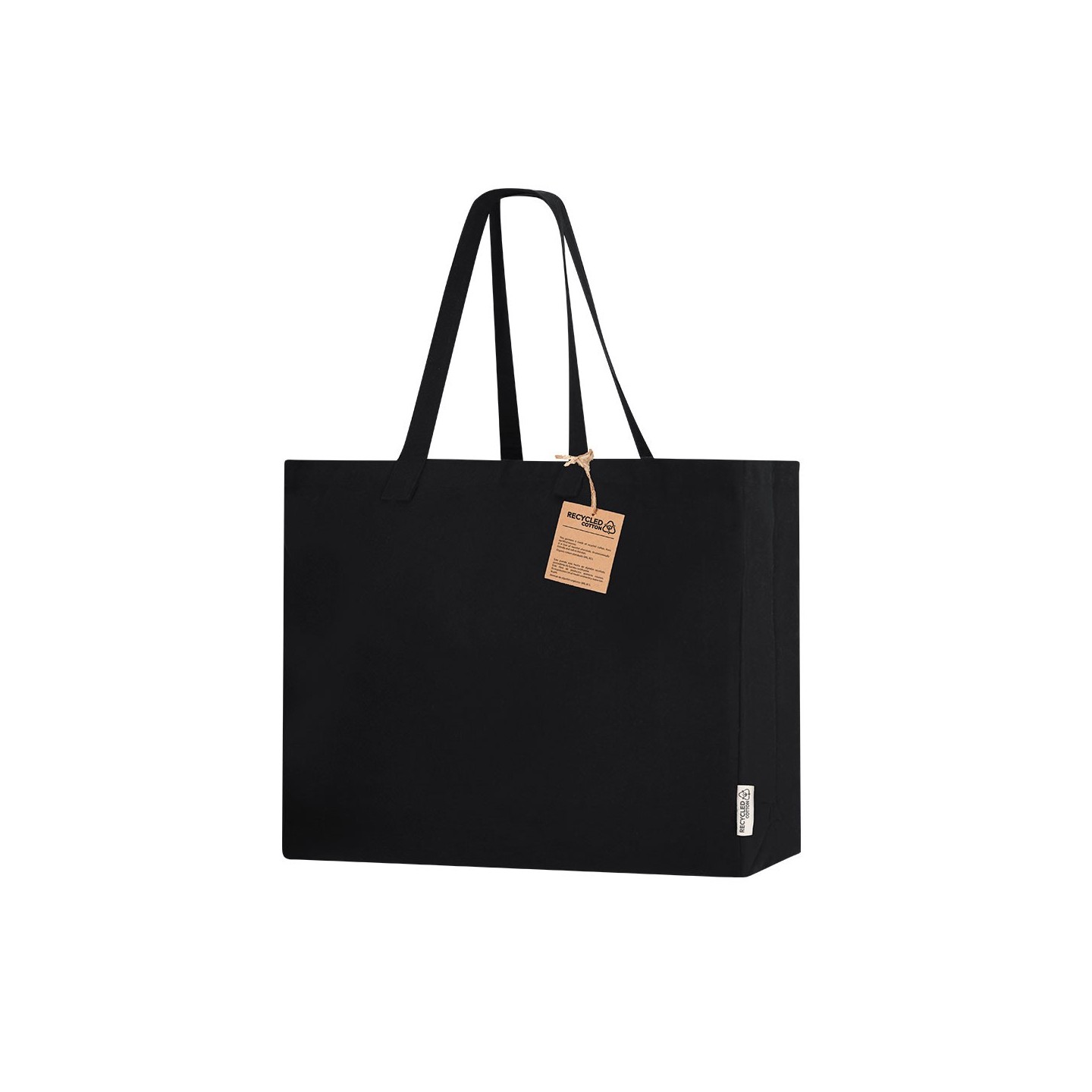 Bolsa ecológica de algodón reciclado, resistente hasta 10 kg, con fuelle, asas largas reforzadas y distintivo lateral. Personalizable con tu logotipo.