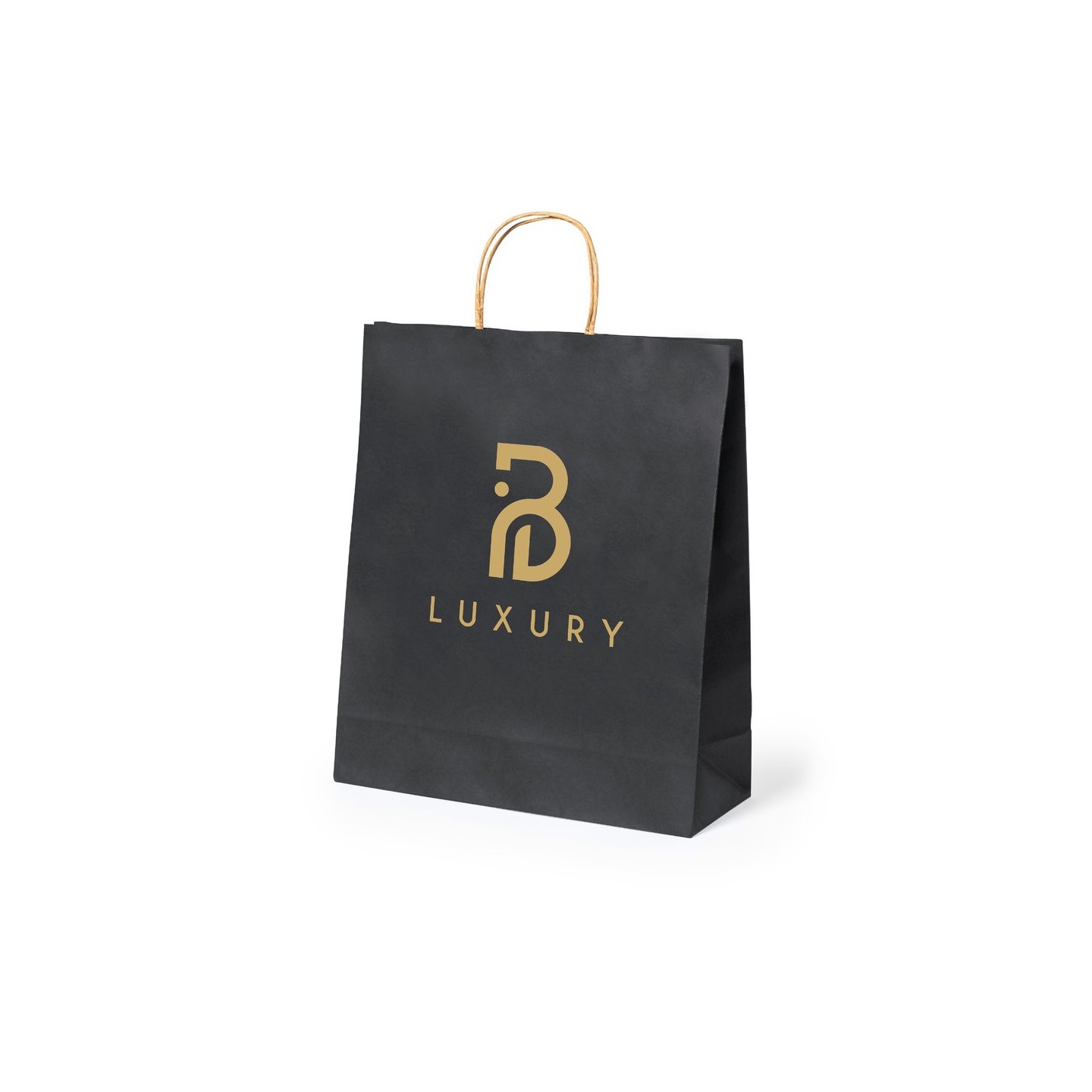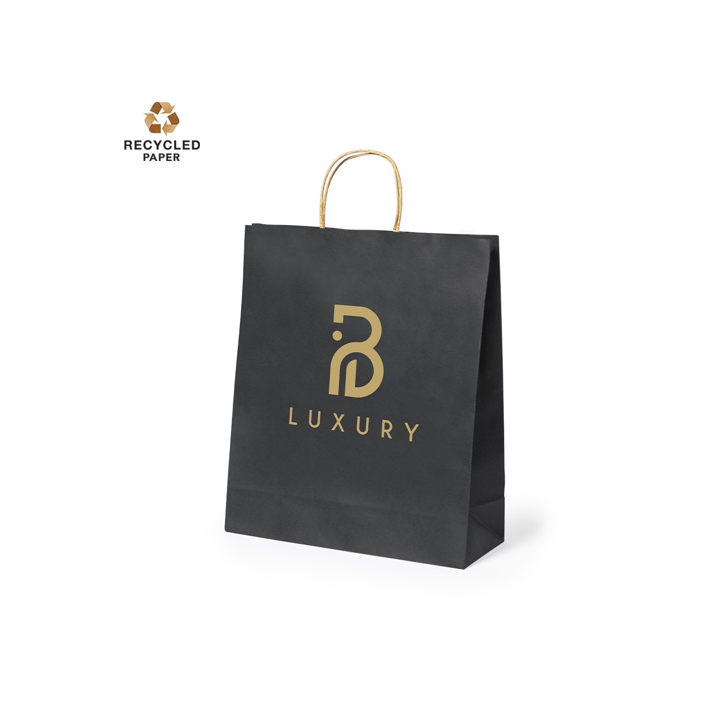 Bolsa ecológica de papel reciclado con asas reforzadas. Resistente y de diseño elegante en color negro. Soporta hasta 6 kg de peso."