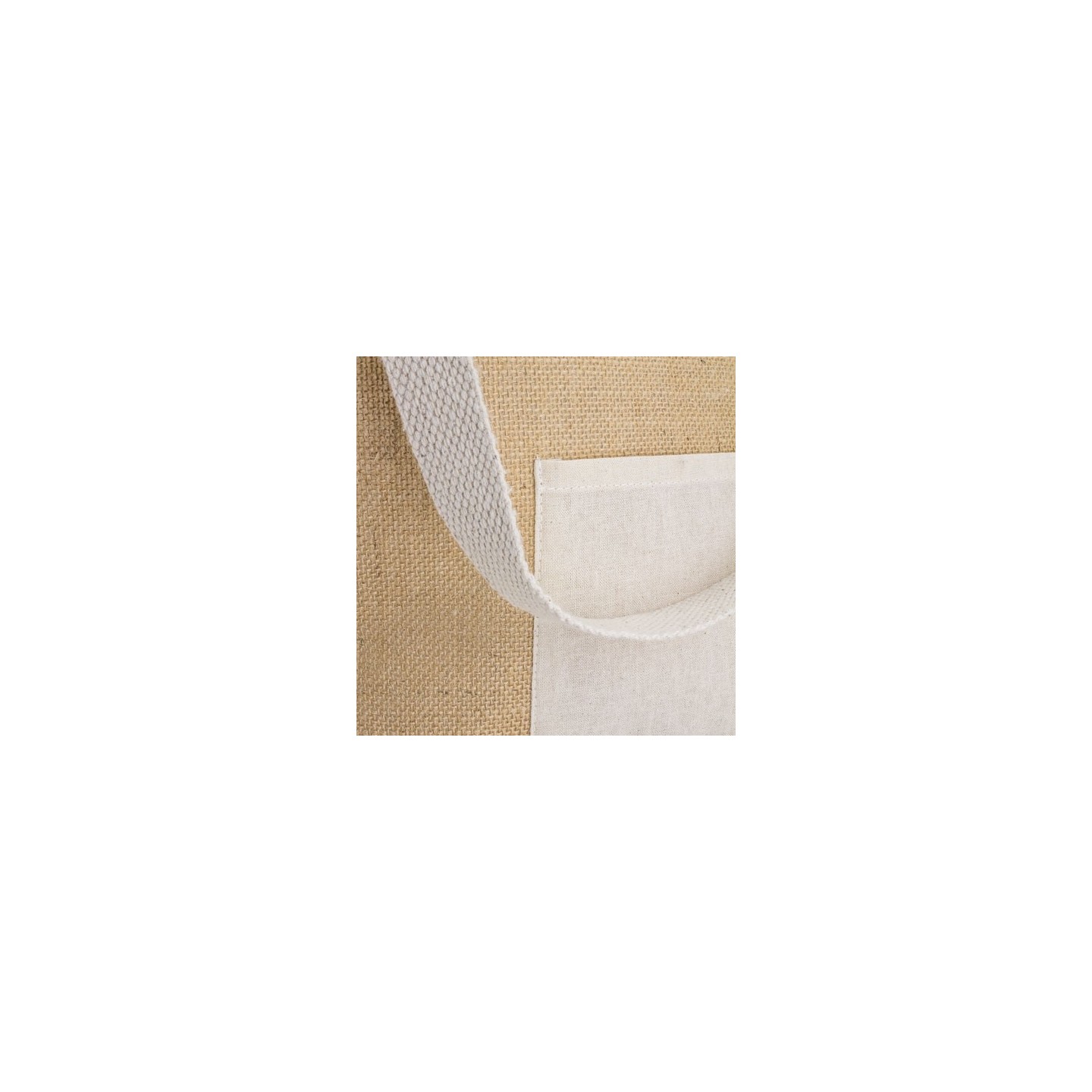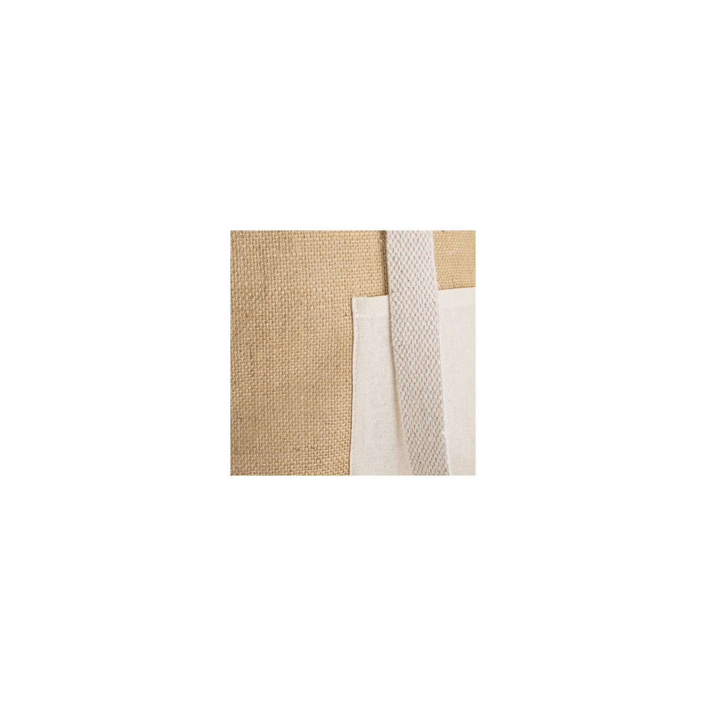 Bolsa reutilizable eco-friendly de algodón y yute laminado, con asas extra confort y bolsillo frontal. Disponible en modelo horizontal y vertical